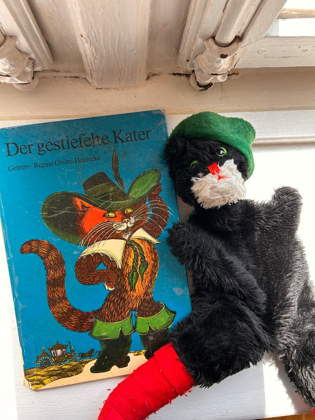 への字口がかわいい、長靴を履いたネコがモチーフとなっているパペットです。 中に手を入れて動かすことができます。 頭の部分には、芯が入っていて、そこに指を入れられます。 手を入れると、頭と両手を動かすことができるかと思います。 ばんざいをさせた表情がとてもかわいいです。 緑の帽子に、赤い長靴は両方ともフェルト製です。 プラスチックの目、刺繍の鼻と口です。 紐を付けて吊るして飾ったり、中にペットボトルなどを入れて飾ってもかわいいと思います。 状態など:長い間愛されていたような、くったりとしたネコです。フェルトには毛玉があります。ドイツの家庭で使用、保管されていたものです。 サイズ:平置きで身長 約43cm デコレーションのレースやほかのくまはディスプレイです。商品には含まれません。 発送について:ドイツよりDHL便で発送します。ほかの商品との同梱も可能ですが、容量と重量を確認する必要があります。決済に進む前に必ずお問い合わせください。