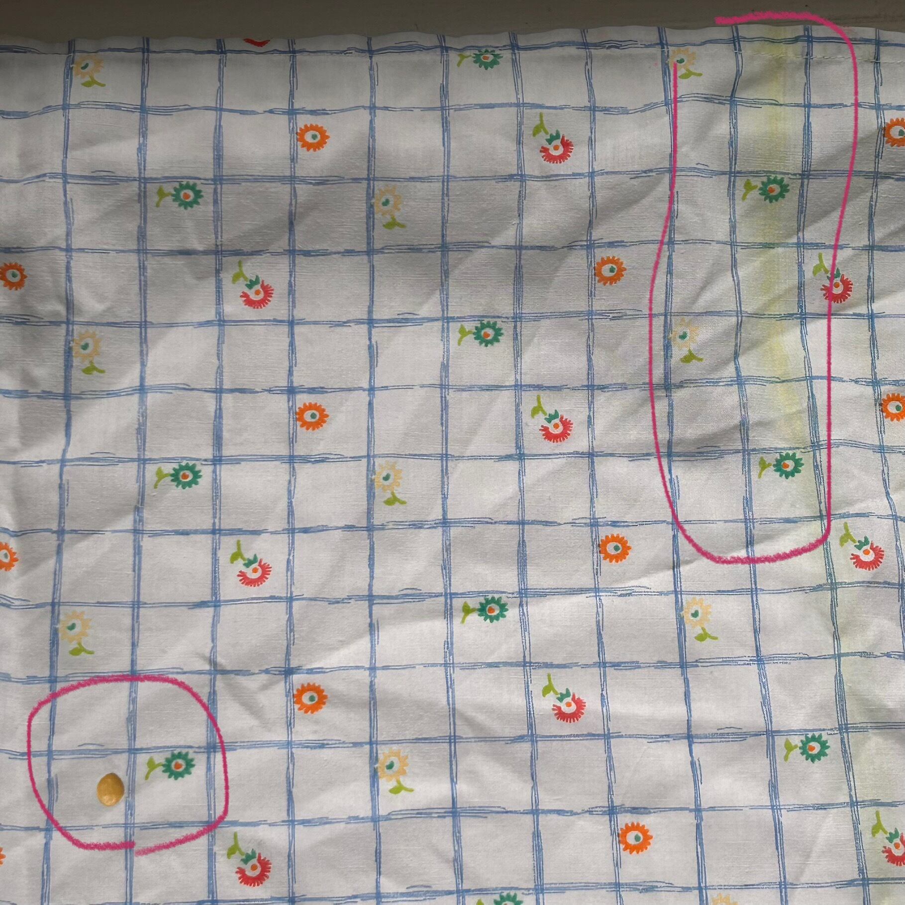 写真4,5と9のような黄緑色の大き目のシミがあります。布のサイズは、その部分を避けたサイズなので実際には86x100cmほどになります。また写真10のような、1cmほどの、のりが固まったようなシミが1点あります。これはほぼ真ん中あたり、上から20㎝ほどの位置にあります。