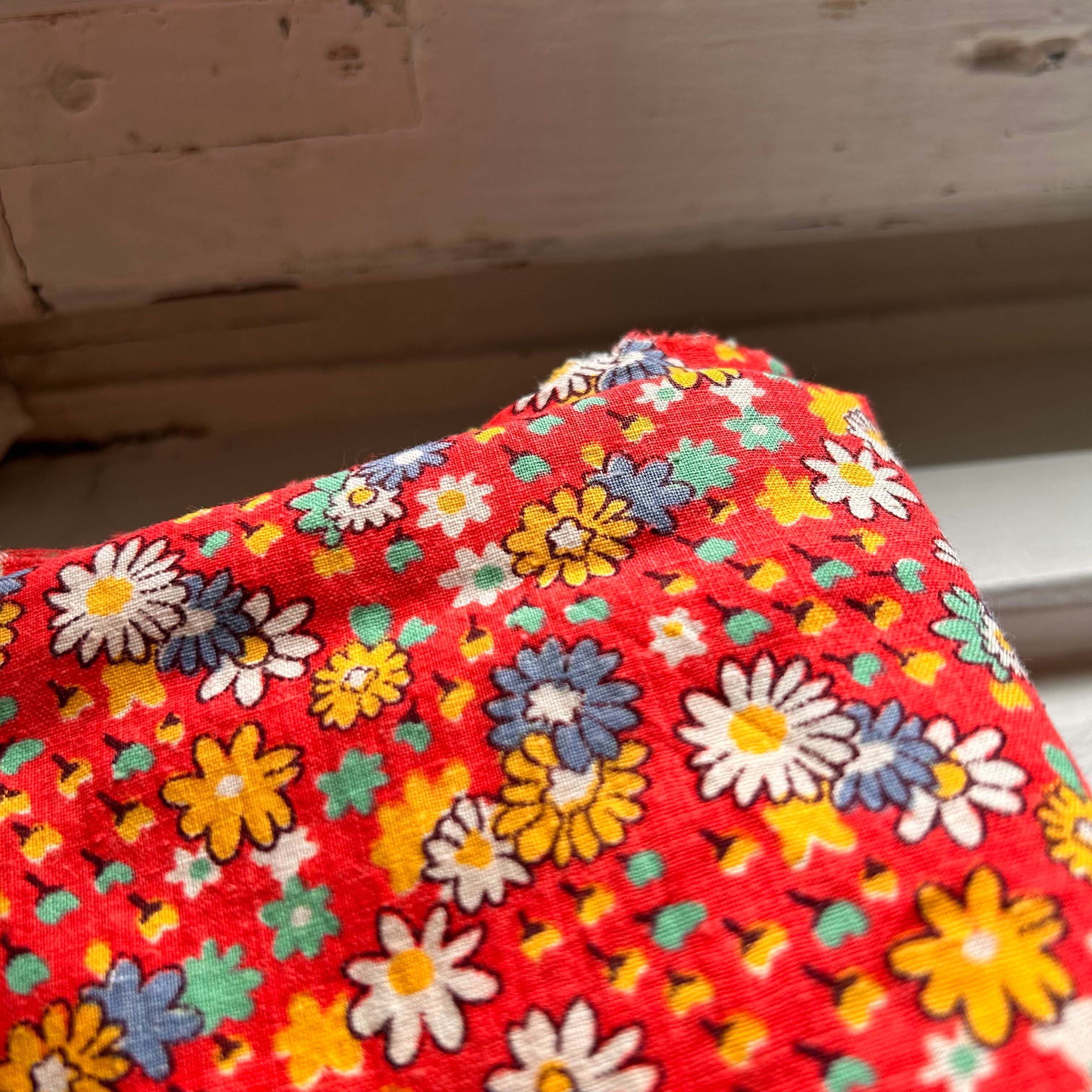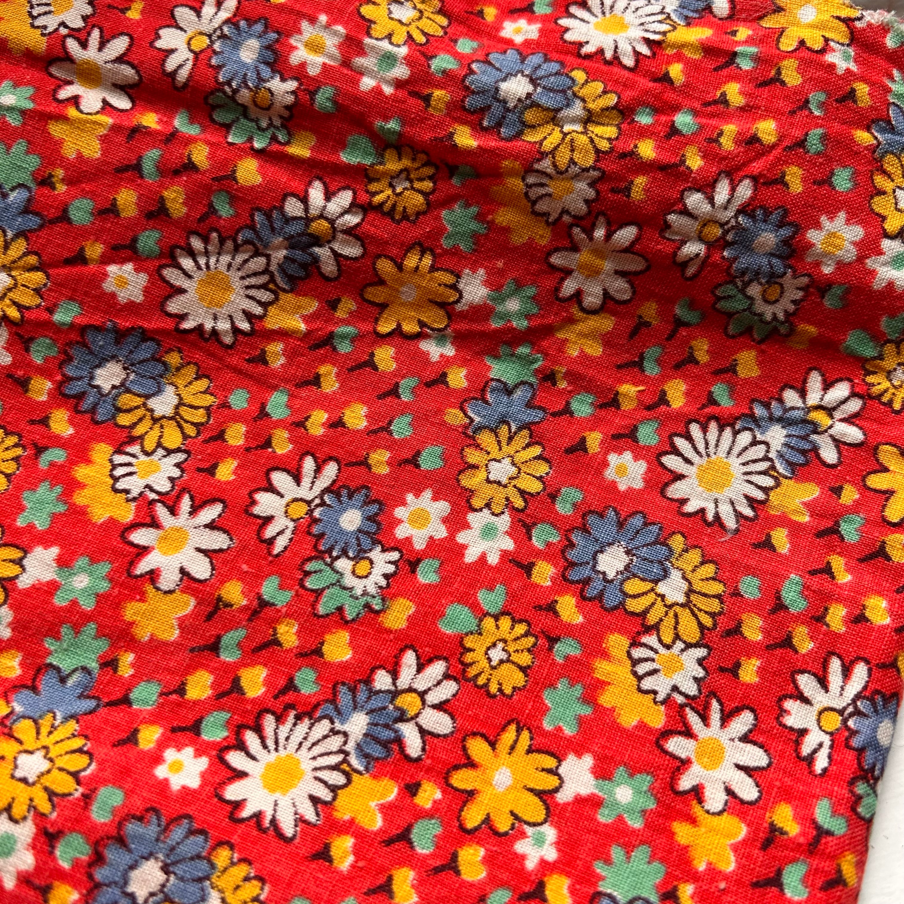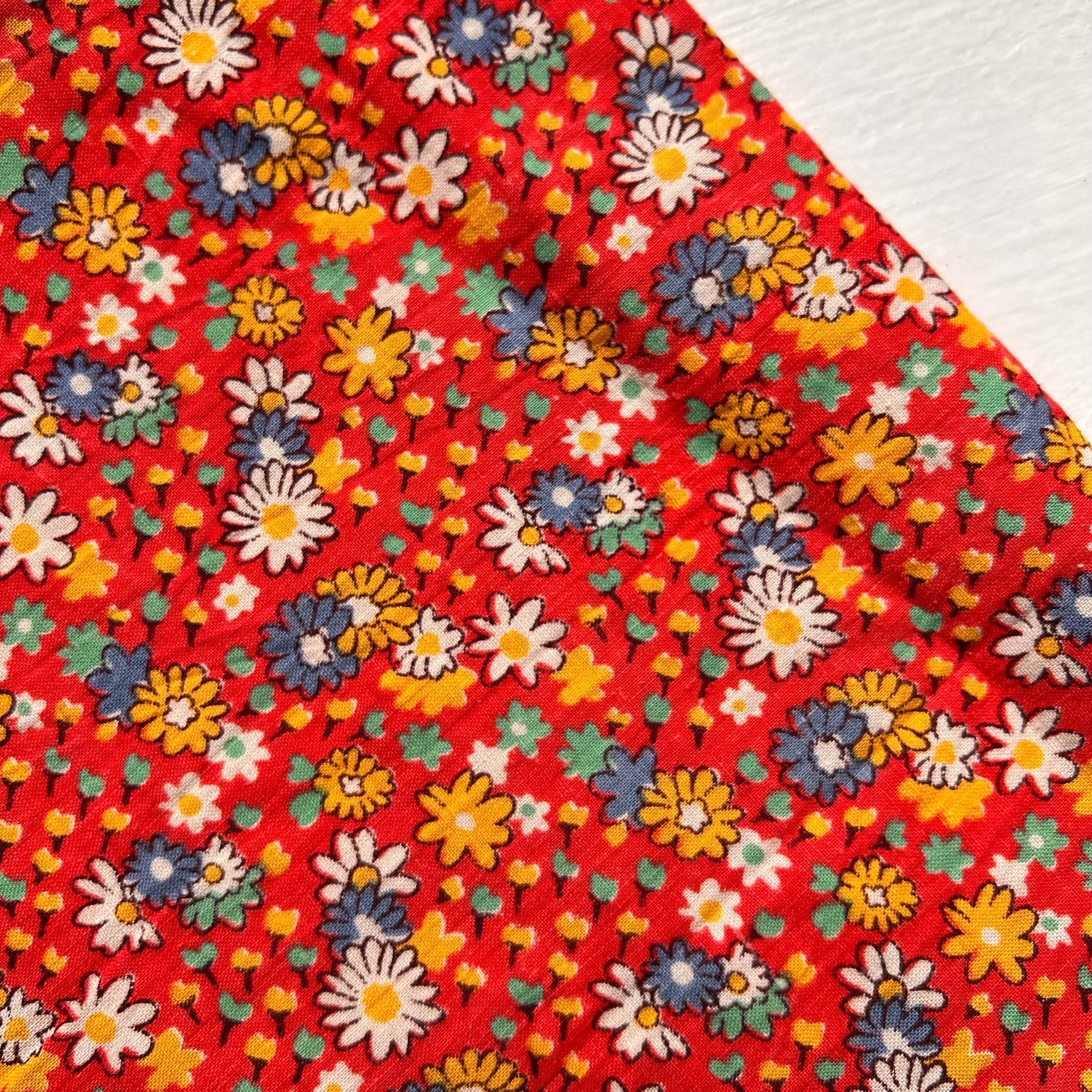赤地にマーガレットなどの小花がかわいい、ヴィンテージ布のカットクロスです。