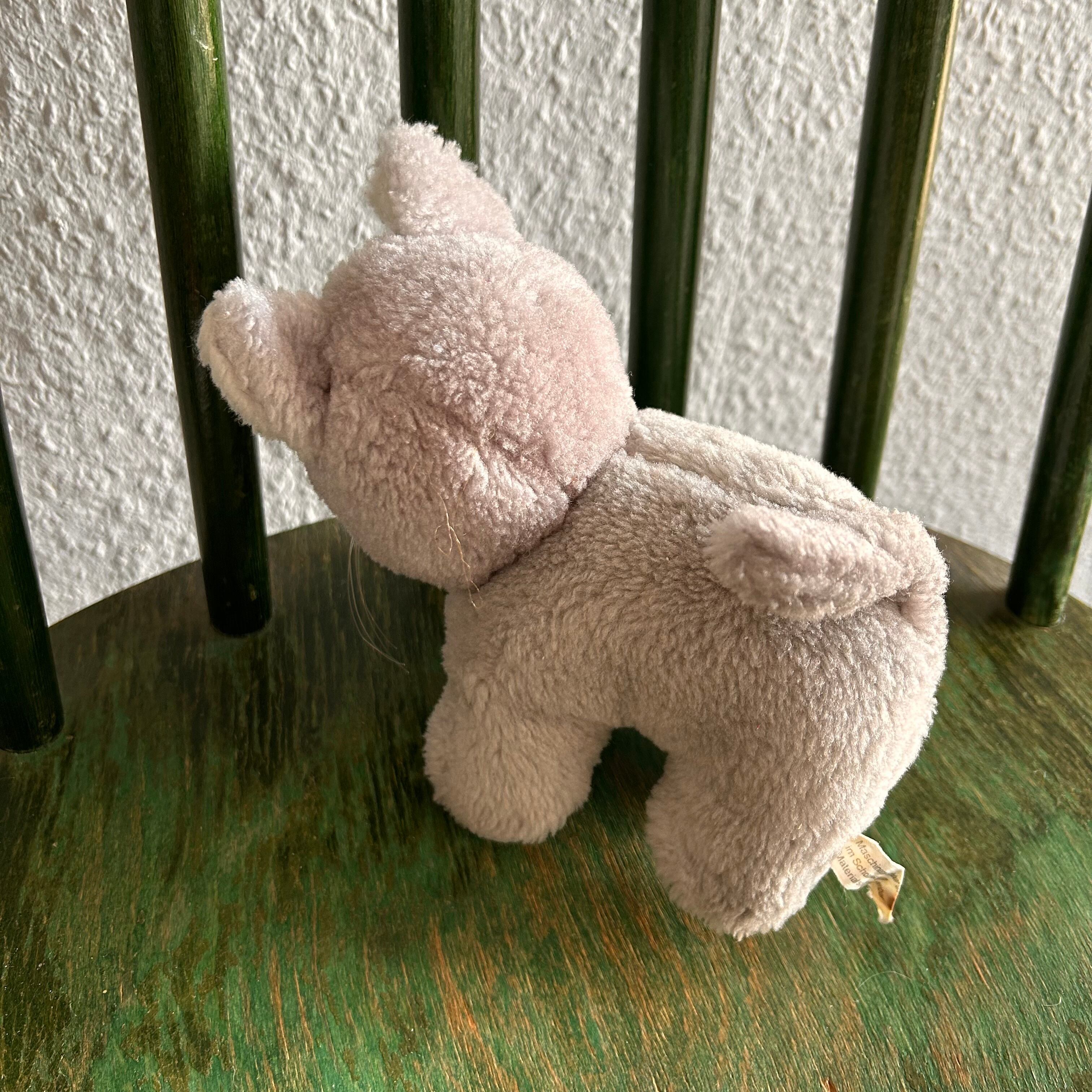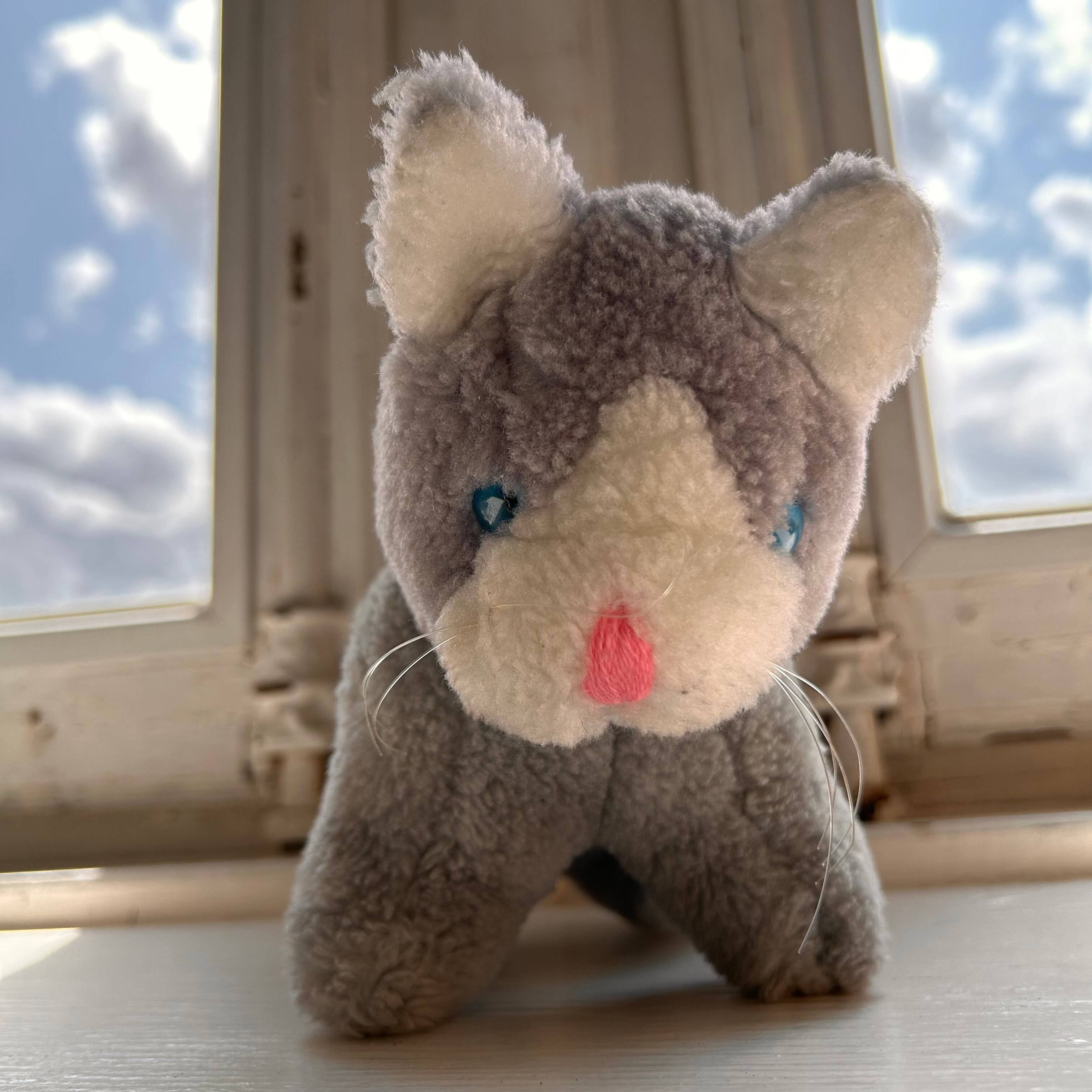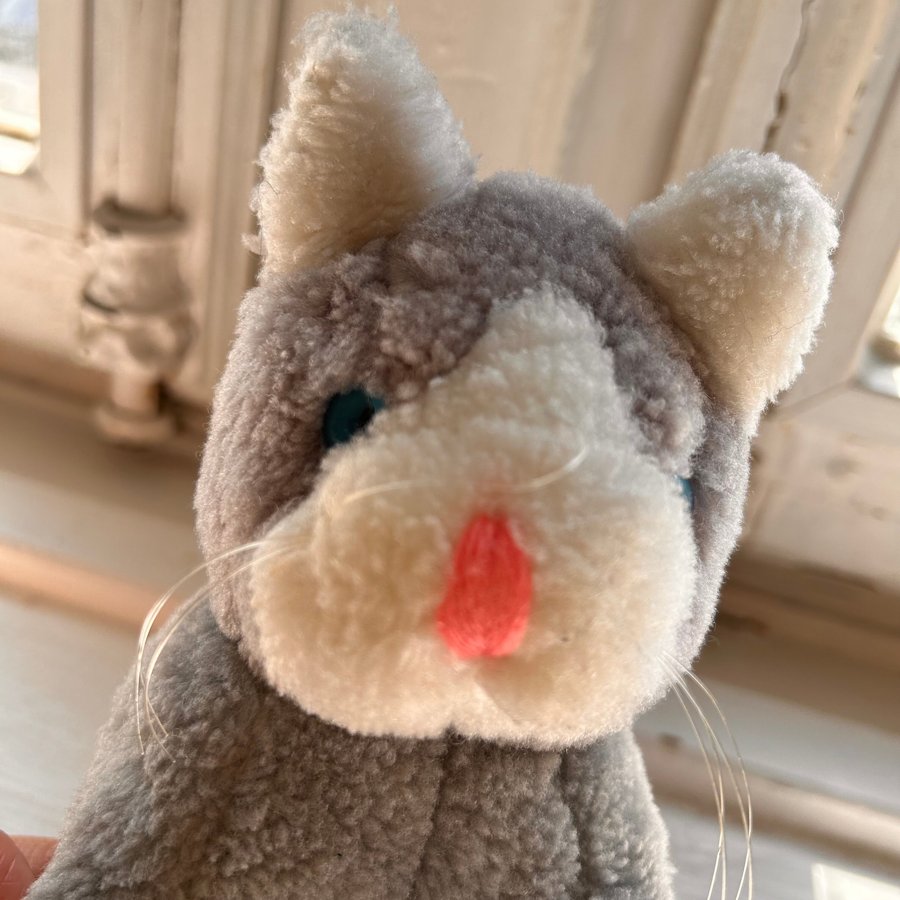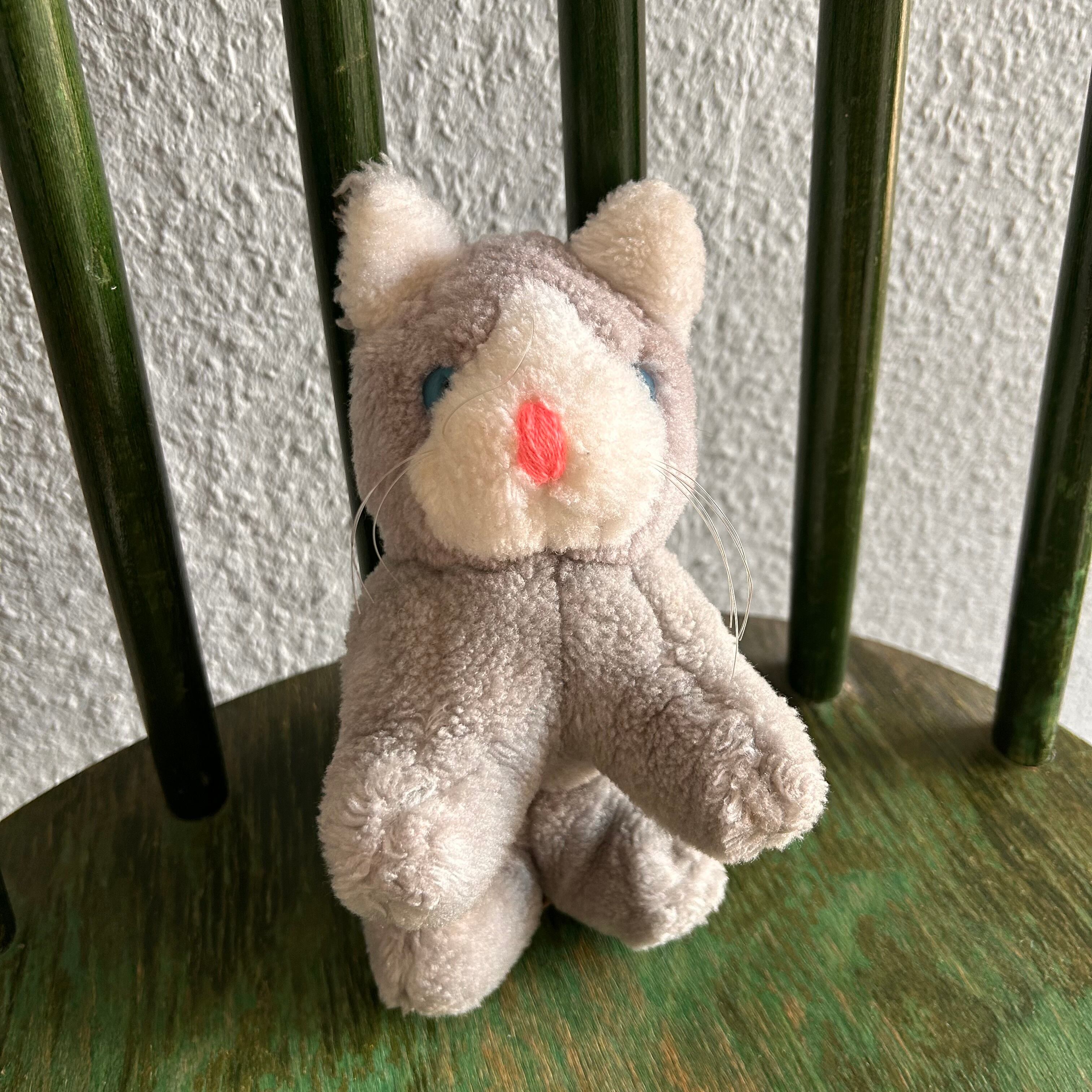 ピンクの刺繍の鼻がかわいいグレーのねこ。