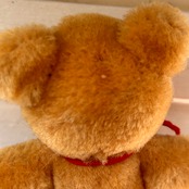 キャメルのほうは白よりやや小さめ、耳を含めた体長約10cm。モヘア毛、プラスチックアイの右目に気泡が入っています(写真11)。ボディ横でタグが切られています。紐が抜けたのか、頭に小さな穴があります。(写真10)。