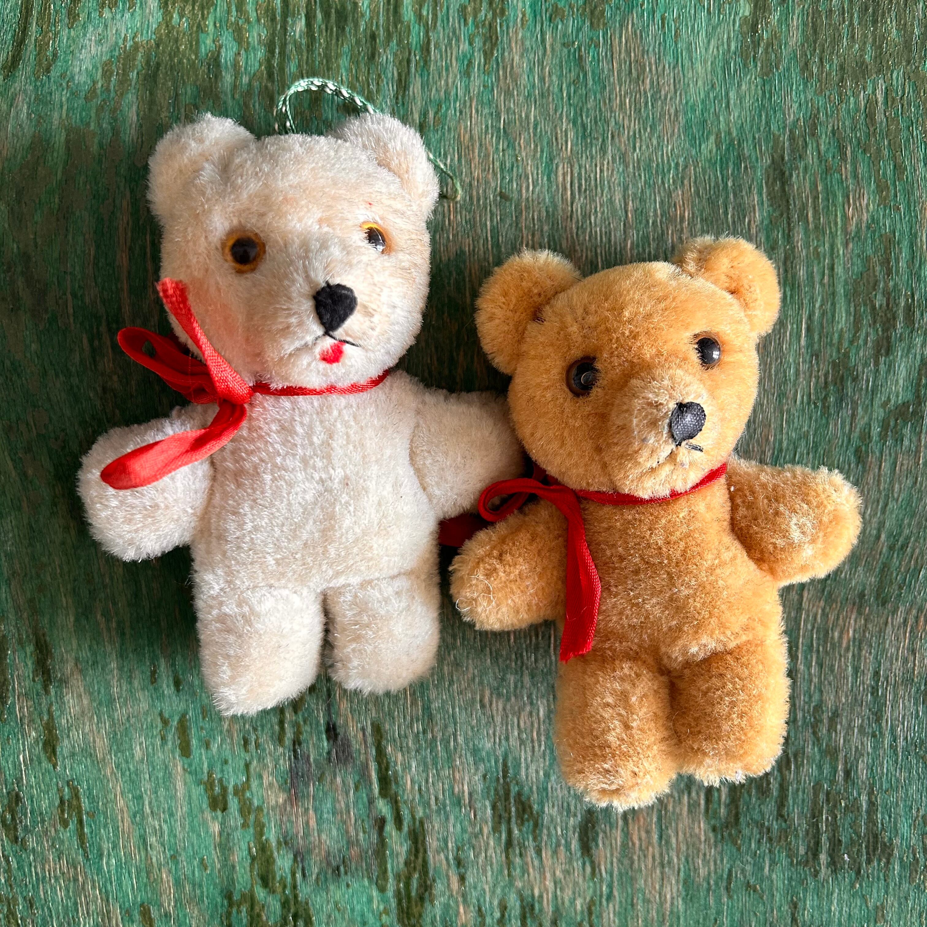 白いほうは、ぺろっと出した赤い舌、モヘア毛、プラスチックアイは少し曇っています(写真20)。耳を含め体長11cm。ぶら下げる紐がついています。薄汚れ感あり。