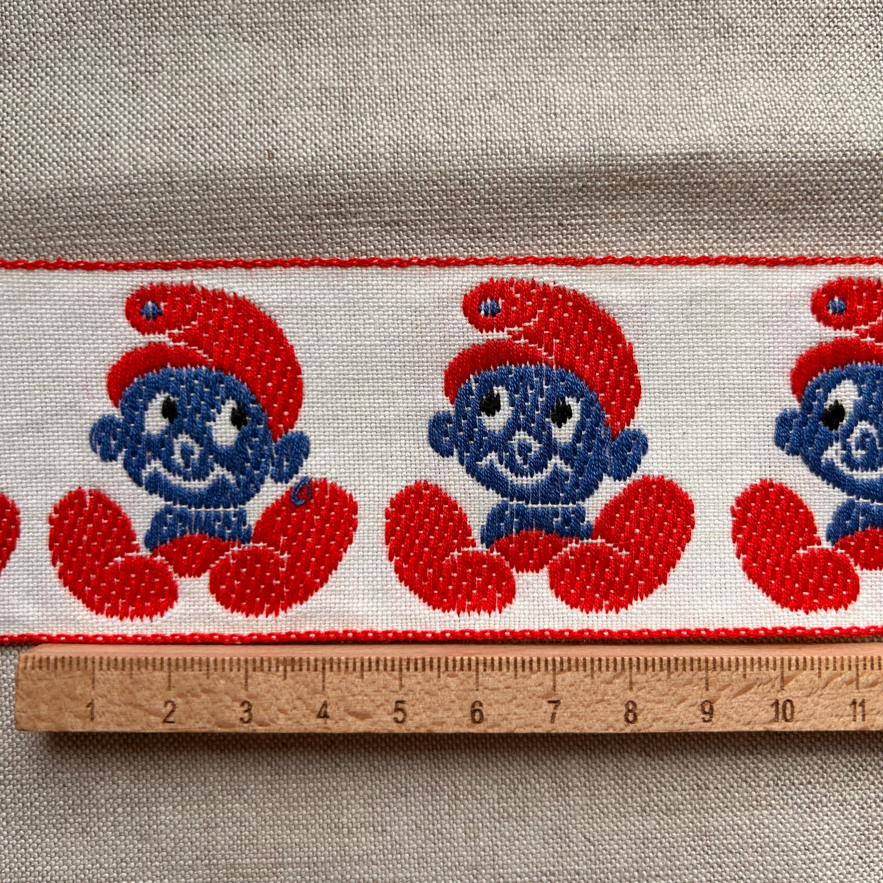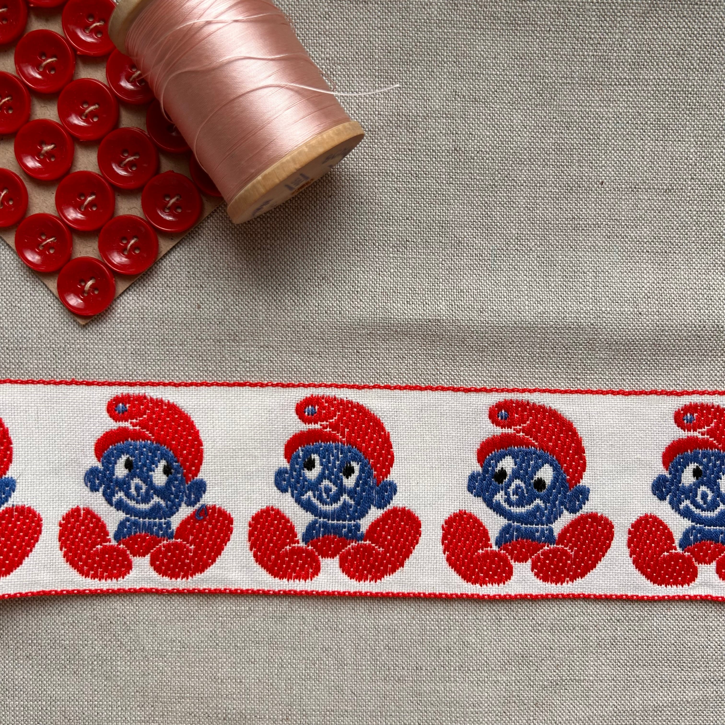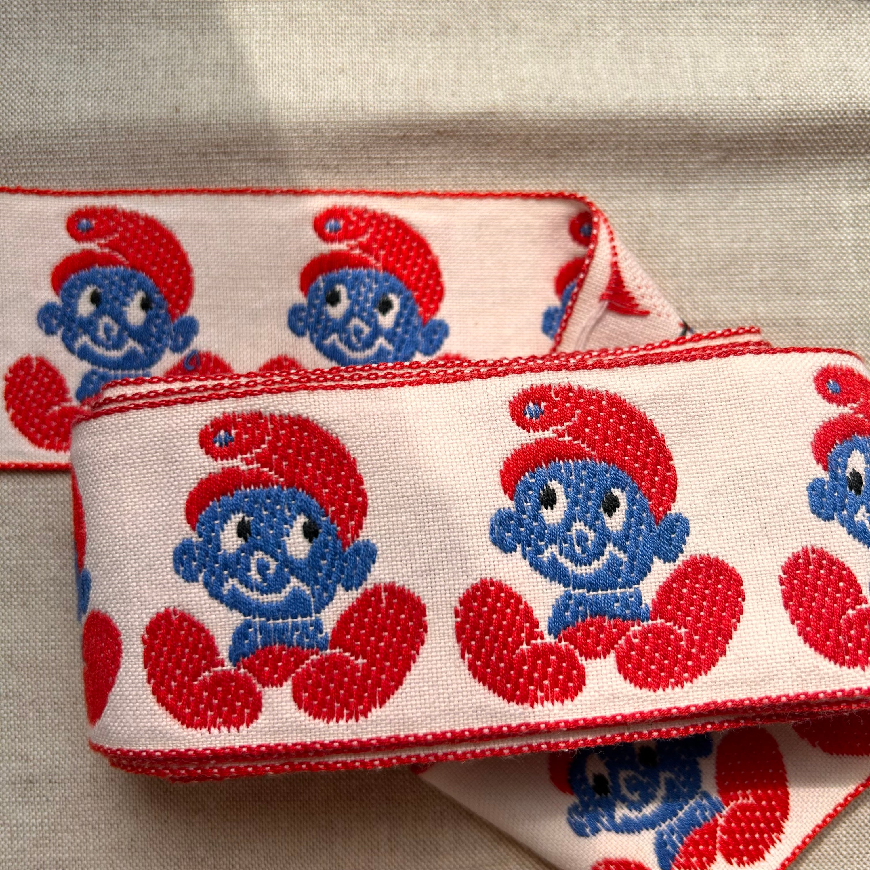 赤と青で、スマーフのような小人がインパクトのあるデザイン。1カットだけでも存在感あります。1点の長さは50㎝で、小人11人分です。デザイン上、小人のキワをカットすることになります。