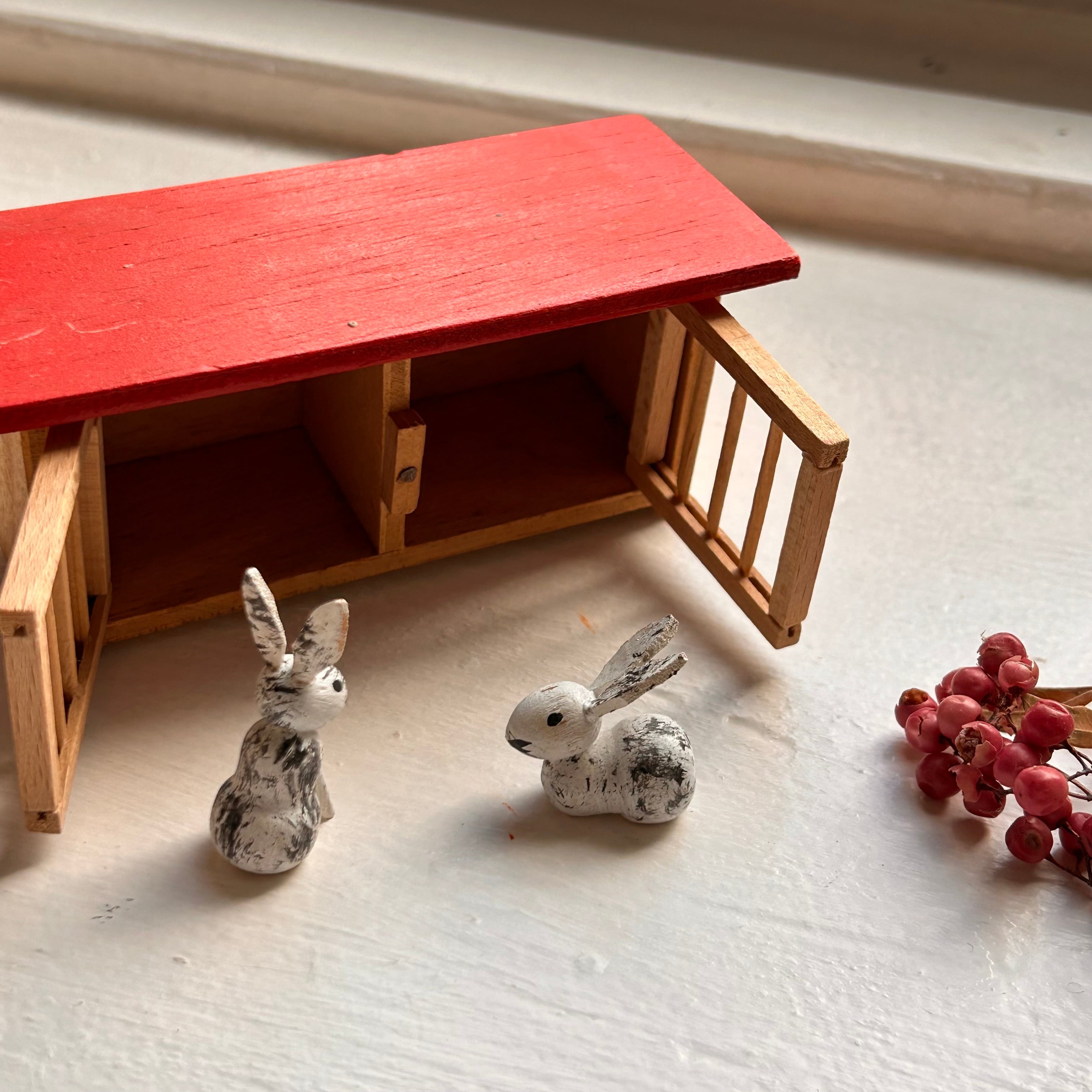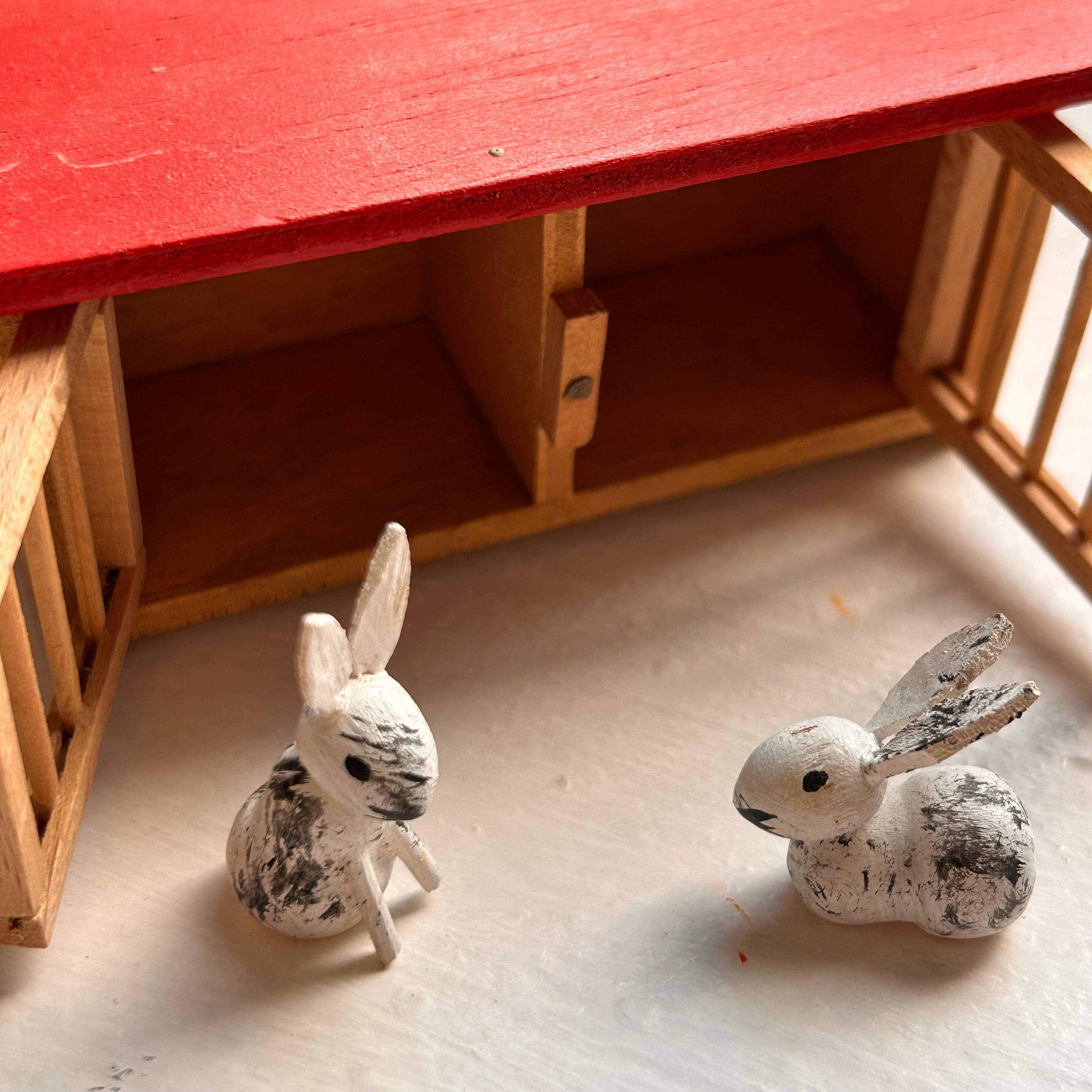 黒いぶちのある白いうさぎ二羽と、赤い屋根のうさぎ小屋のセットです。