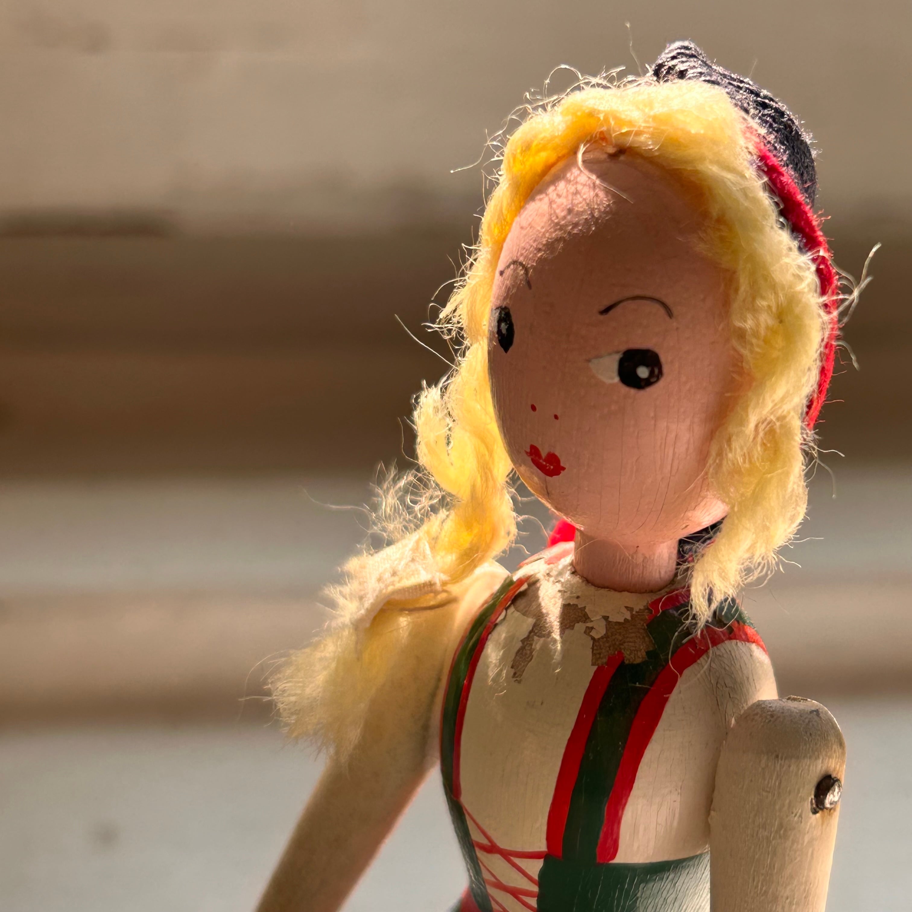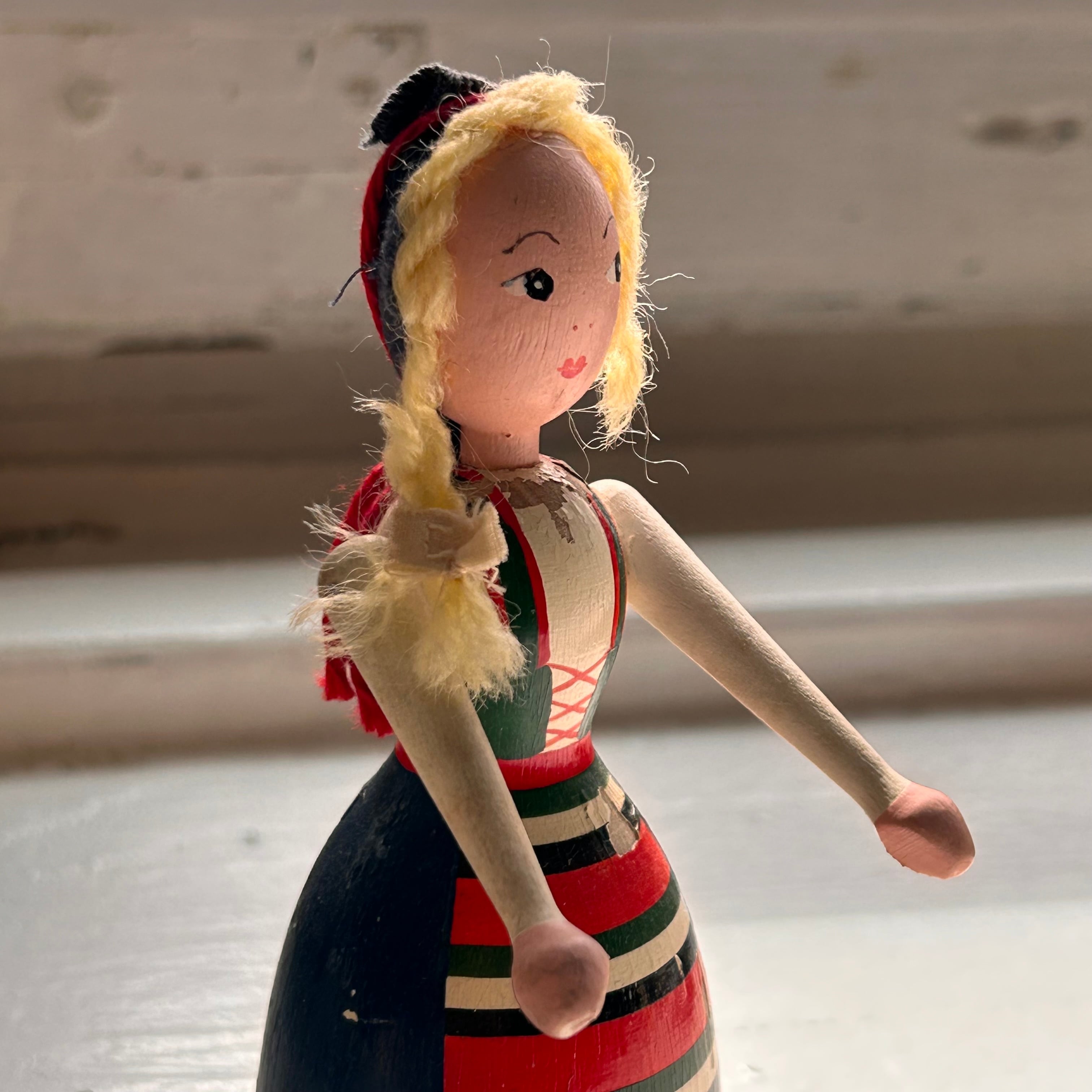 民俗衣装を着たドール。毛糸のおさげに紺の帽子をかぶっています。