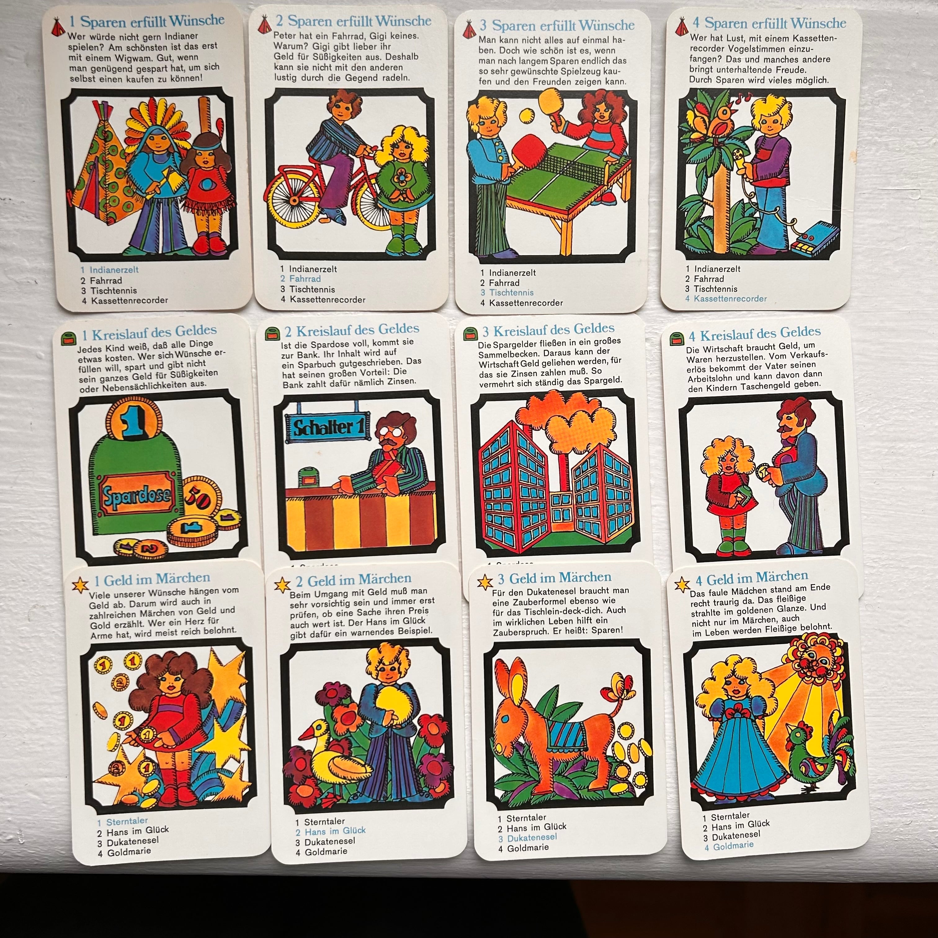お金の歴史やお金の流通、貯蓄で願いをかなえよう、など各テーマが4枚ずつで描かれています。ドイツの銀行がSchmidという大手ゲームメーカーと作ったノベルティものです。