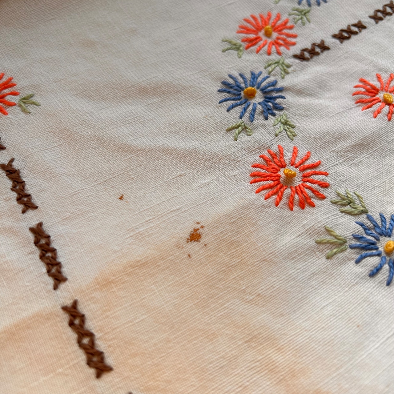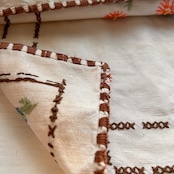 全体的にシミが多いのですが、小花の可憐さやクロスステッチとの組み合わせ、周囲の茶色の縁取りなど、かわいさに負けてご紹介したくなった1枚です。
