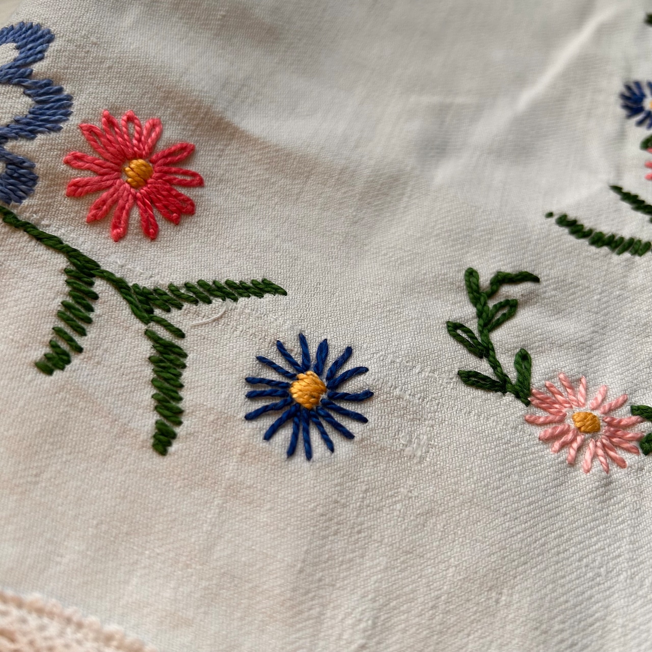 厚いコットン地にぱっと華やかな花の刺繍がきれいな、古そうなクロス。