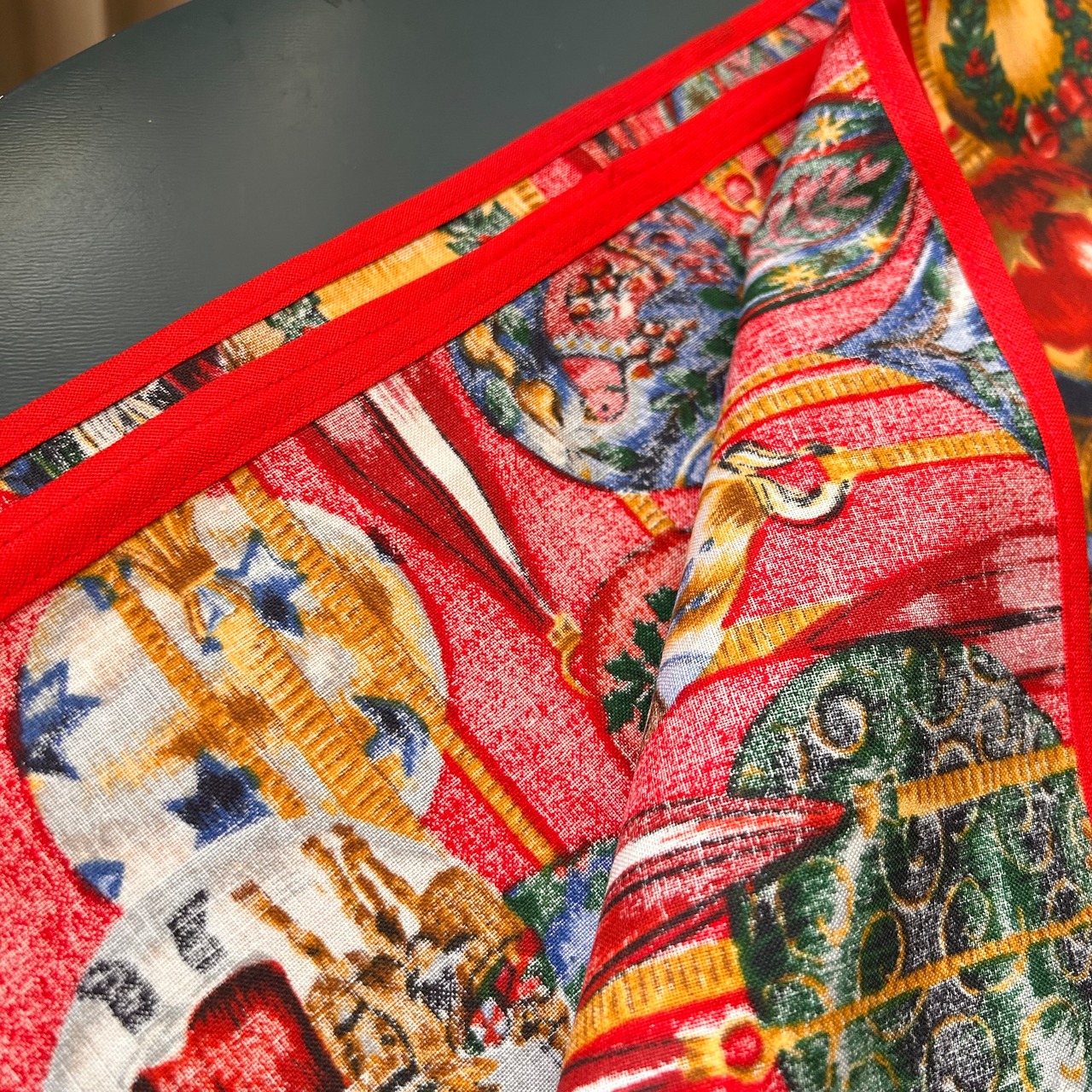 赤いパイピングテープで縁取りされた大きな一枚のクロスです。