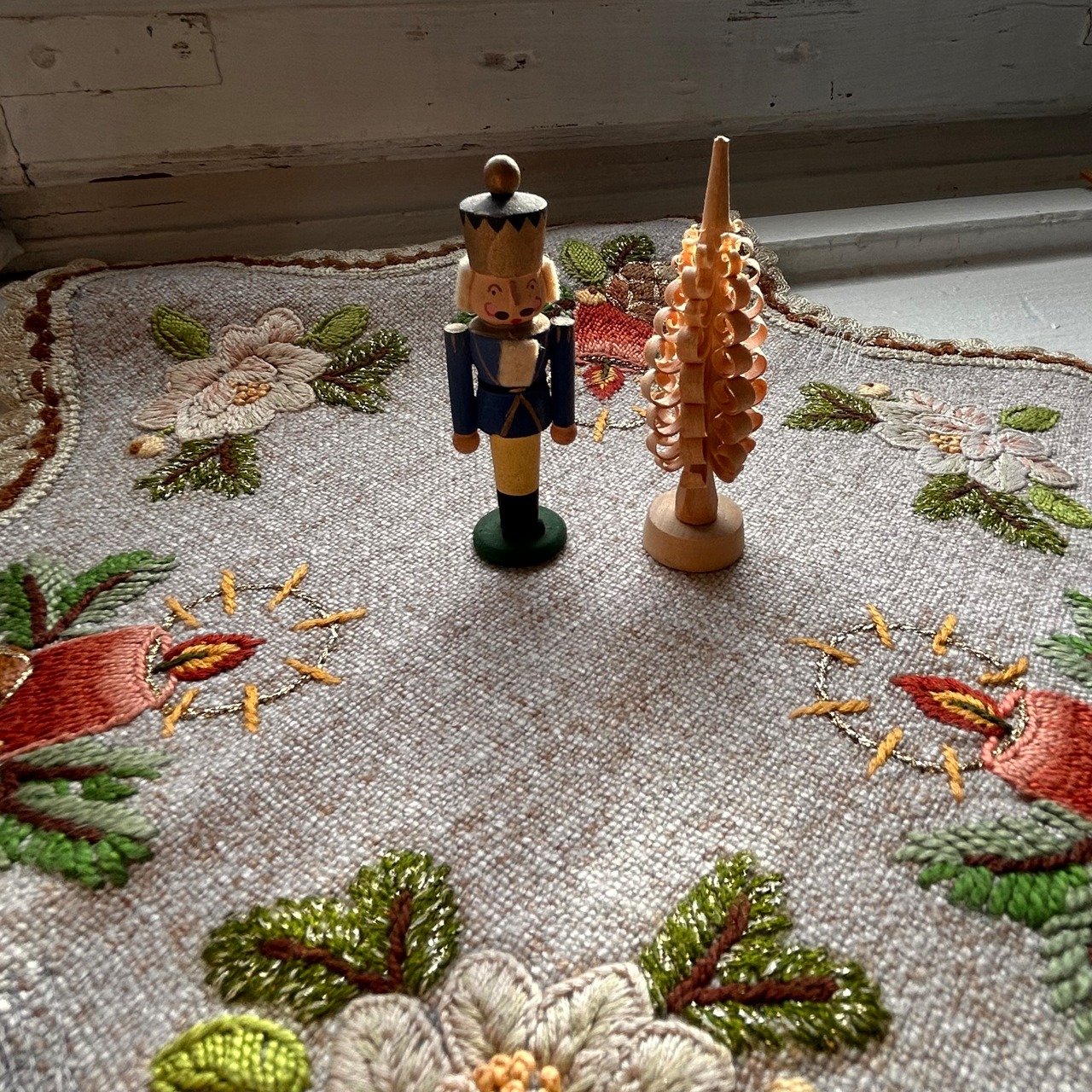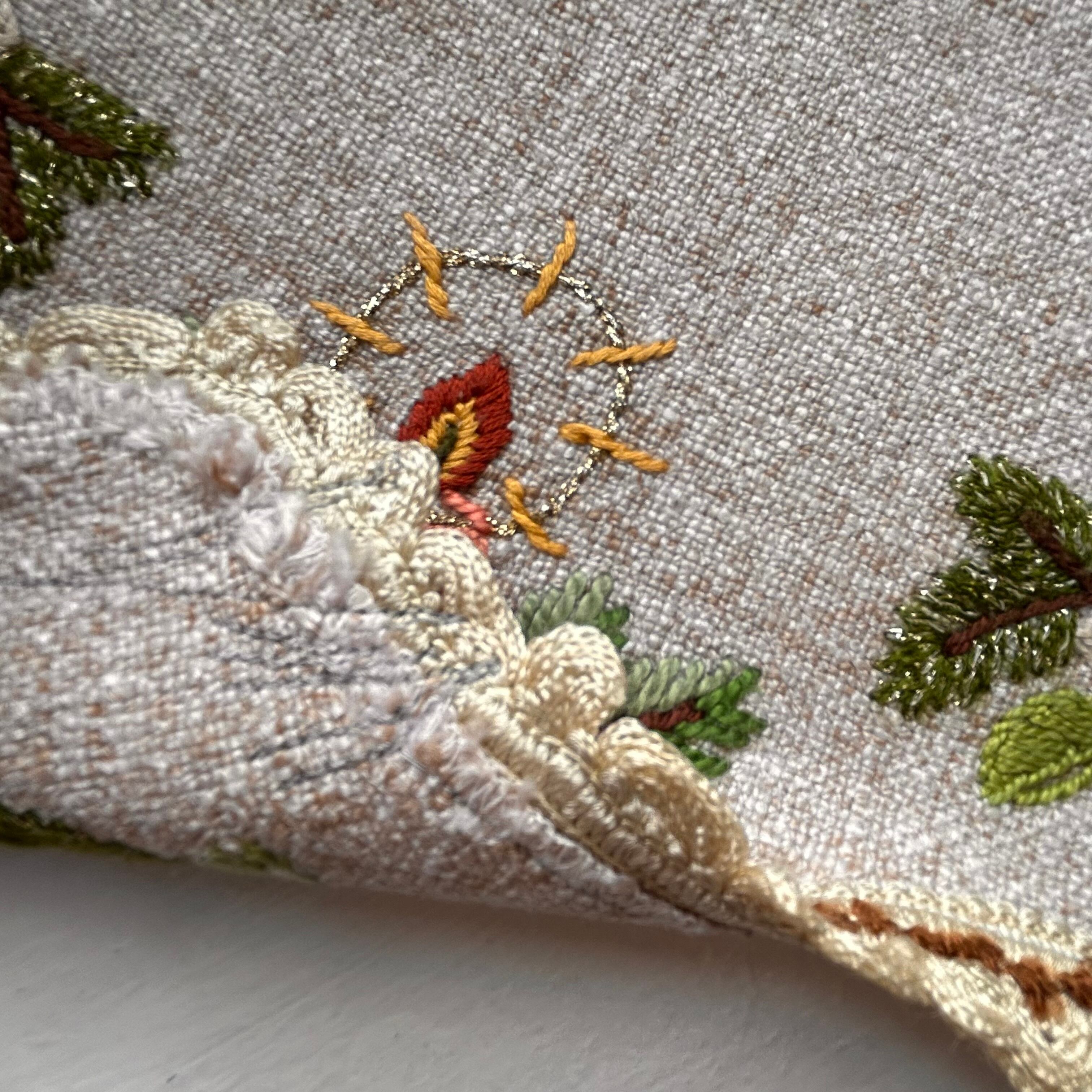 厚手のウールのような、ジュートのような生地に色とりどりの凝った刺繍がぎゅっと詰まっています。縁取りは化繊のリックラックテープによるものです。