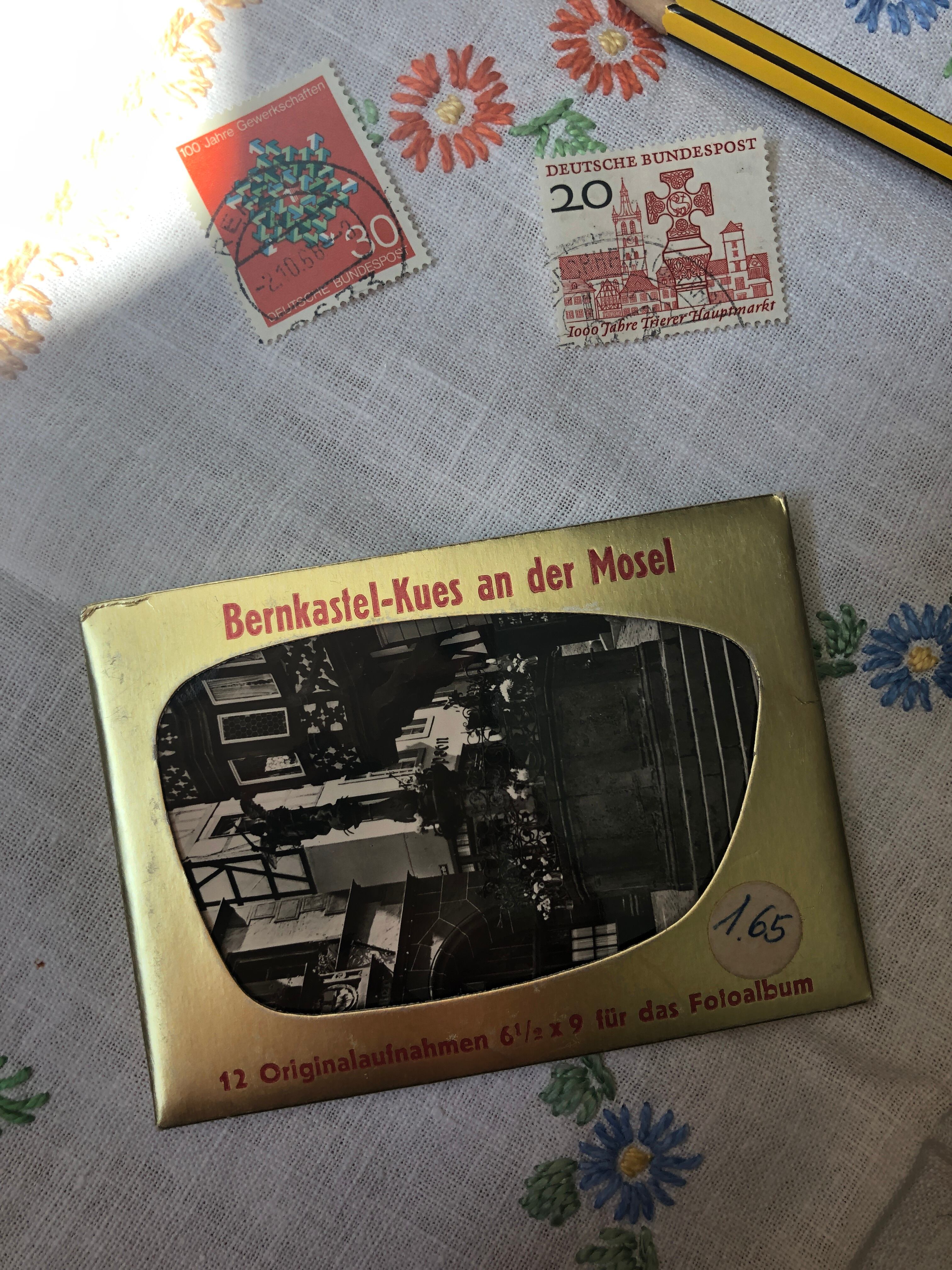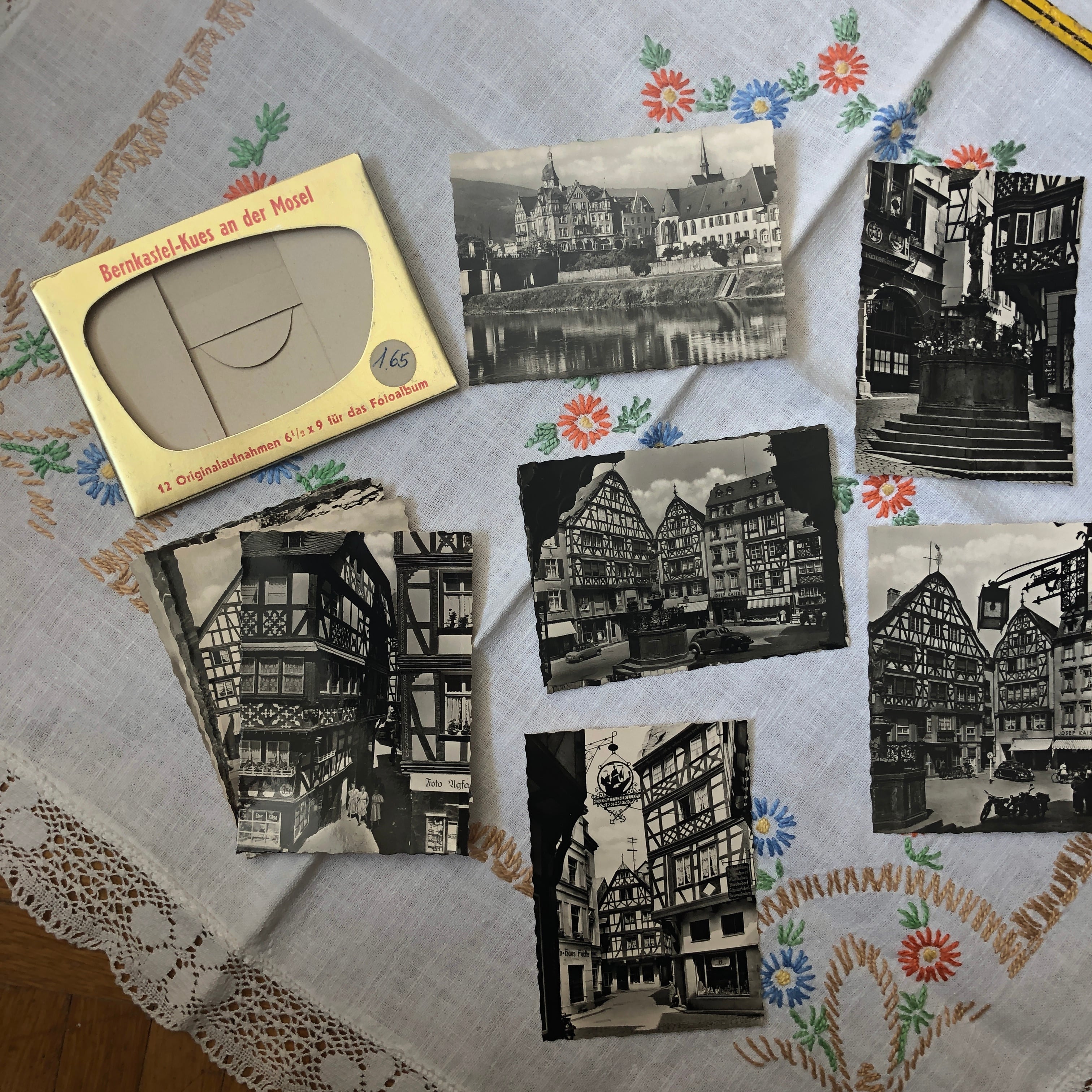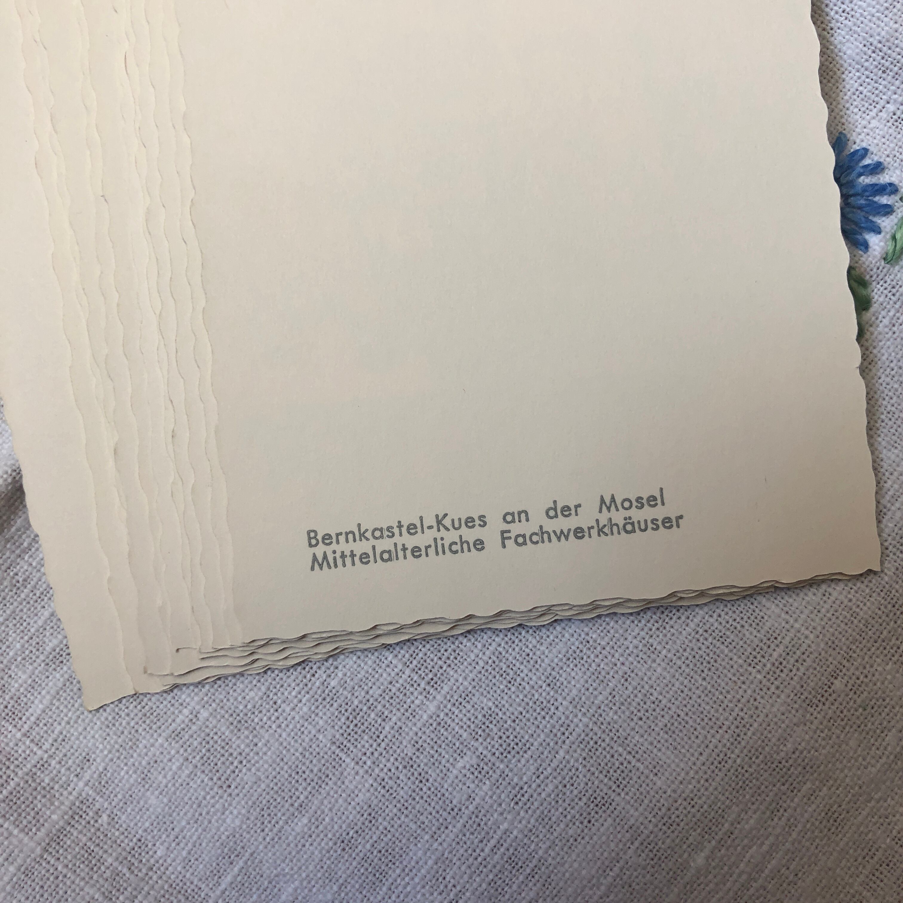 モーゼル川の流れる街、ベルンカステル・クースの名所を写した12枚の写真が入っており、裏には、場所の名前も書かれています。縁がかわいく切り取られています。