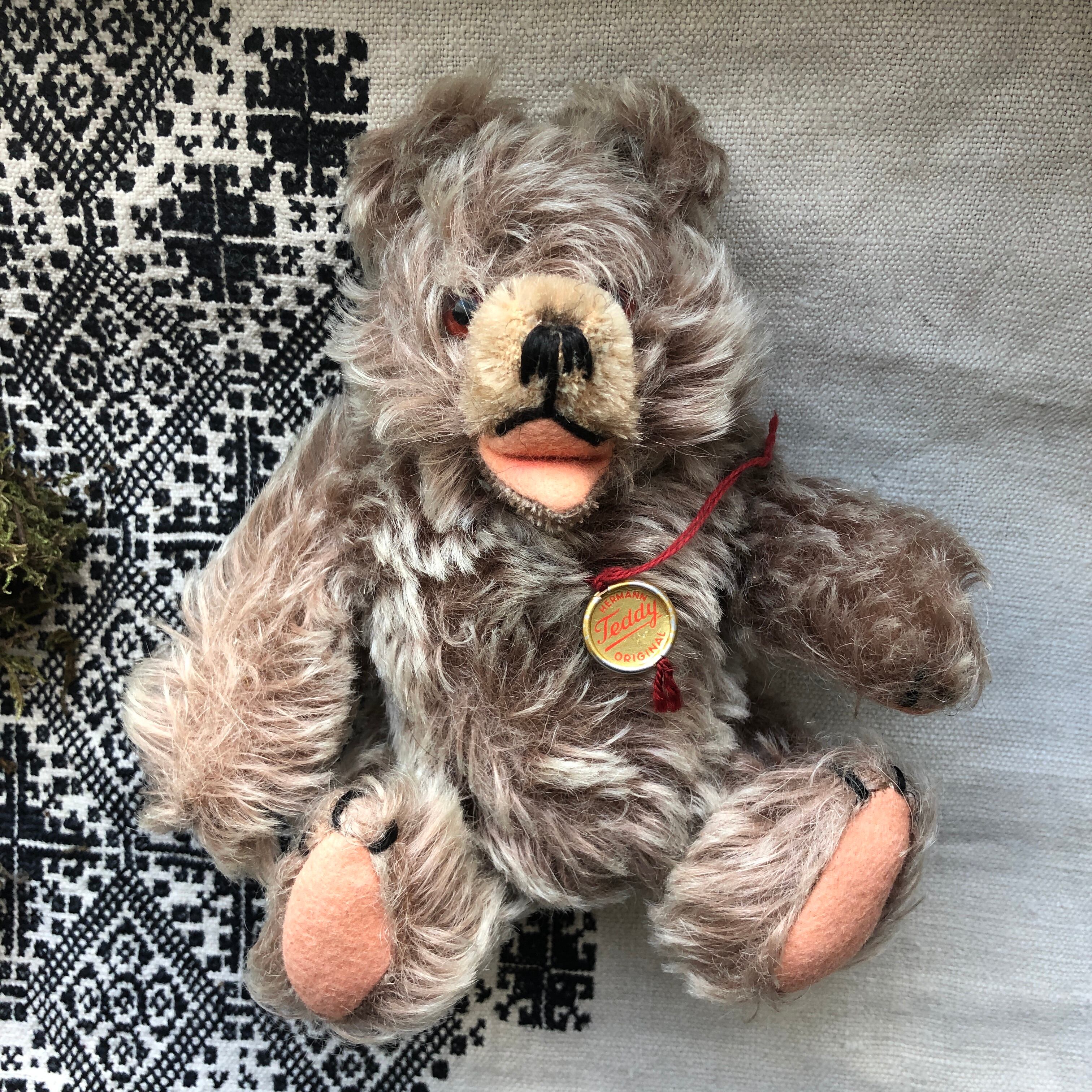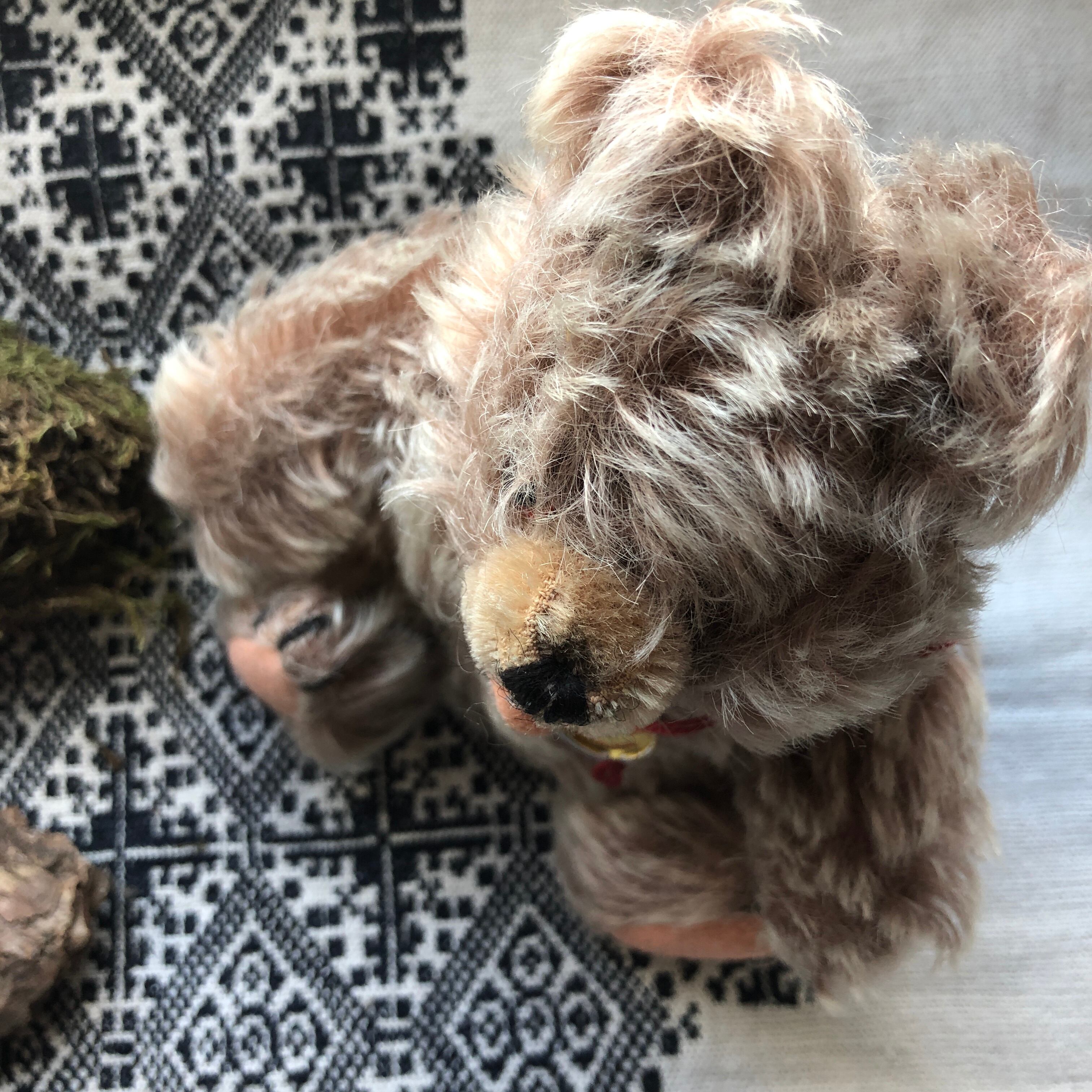 オープンマウスで、ややピンクがかった、もじゃもじゃのモヘアの毛のかわいいこです。毛が寝ている部分もありますが、美品です。