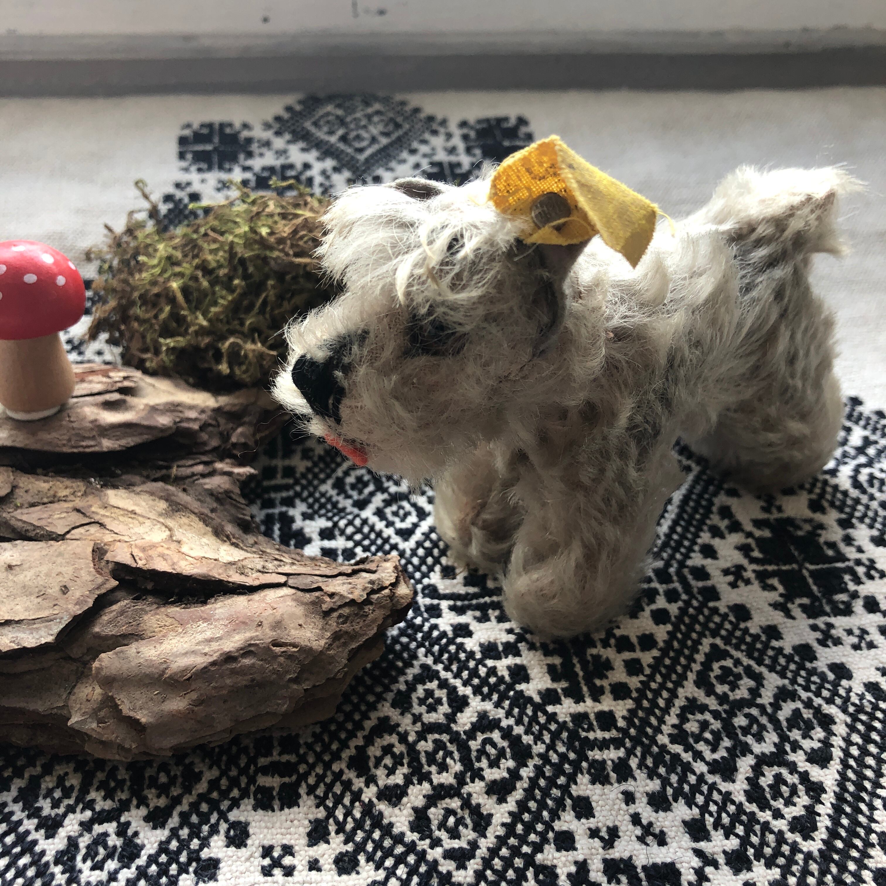 ペロッと出した赤い舌が愛嬌のある小さなシュタイフのテリアです。
