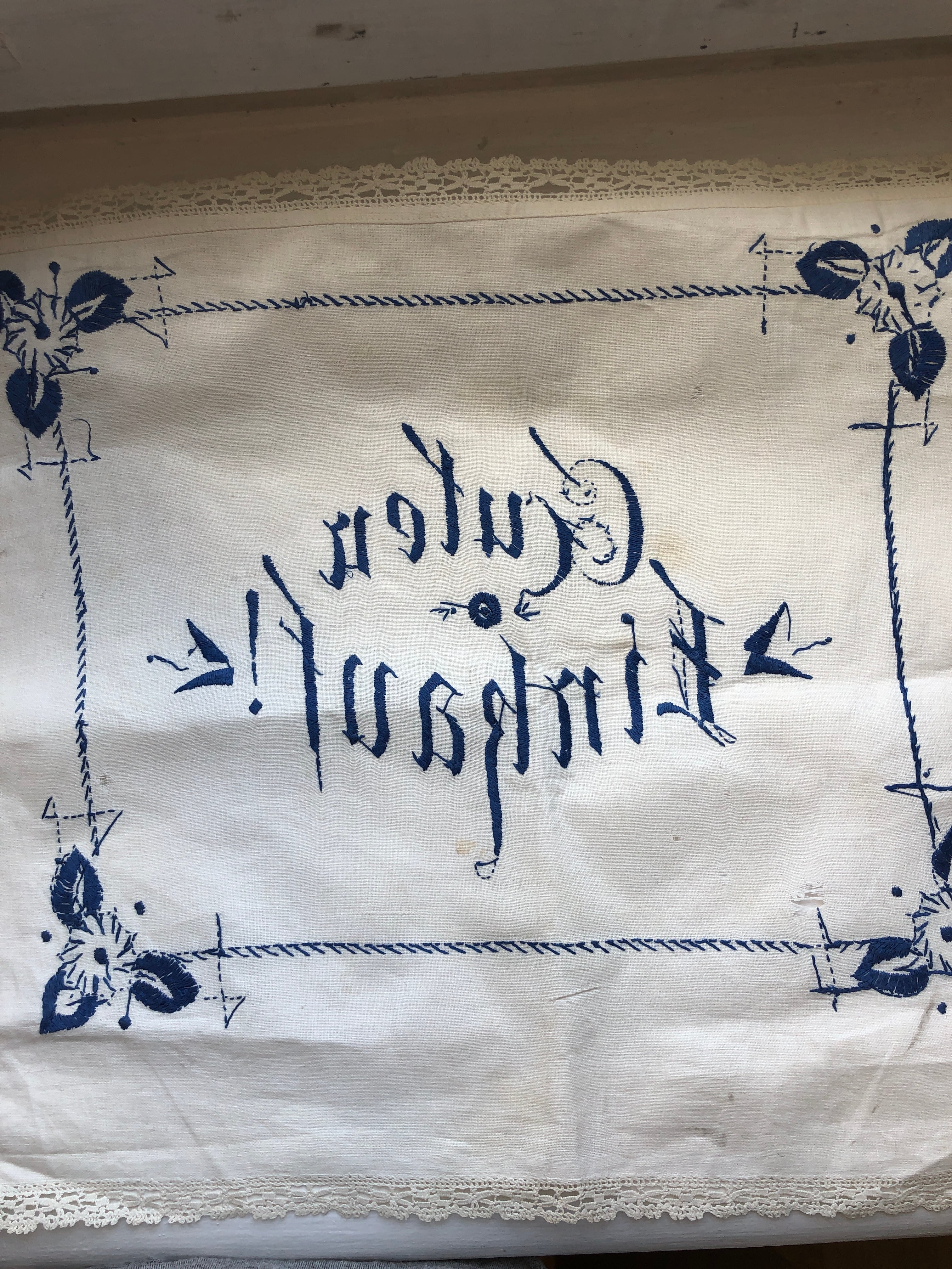 おそらく、買い物カゴなどの目隠しに使われていたリネンの刺繍クロス。かなり古いものです。