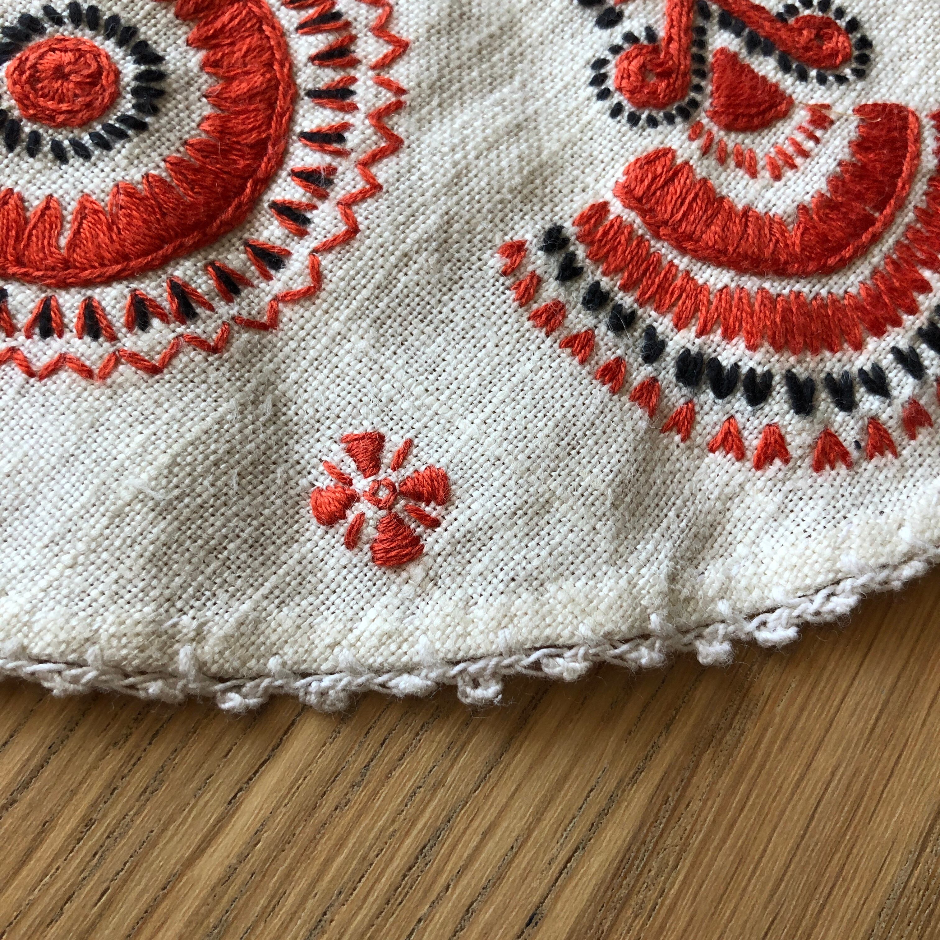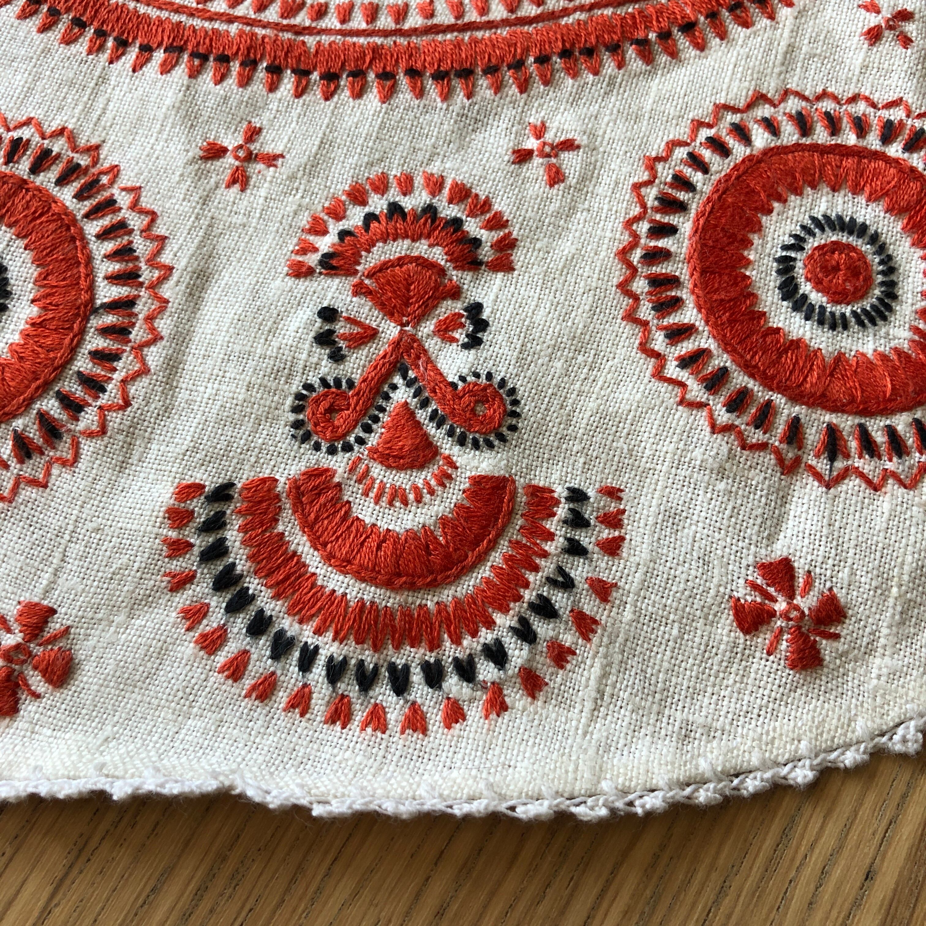オレンジと黒で丁寧に刺繍された丸いクロス。