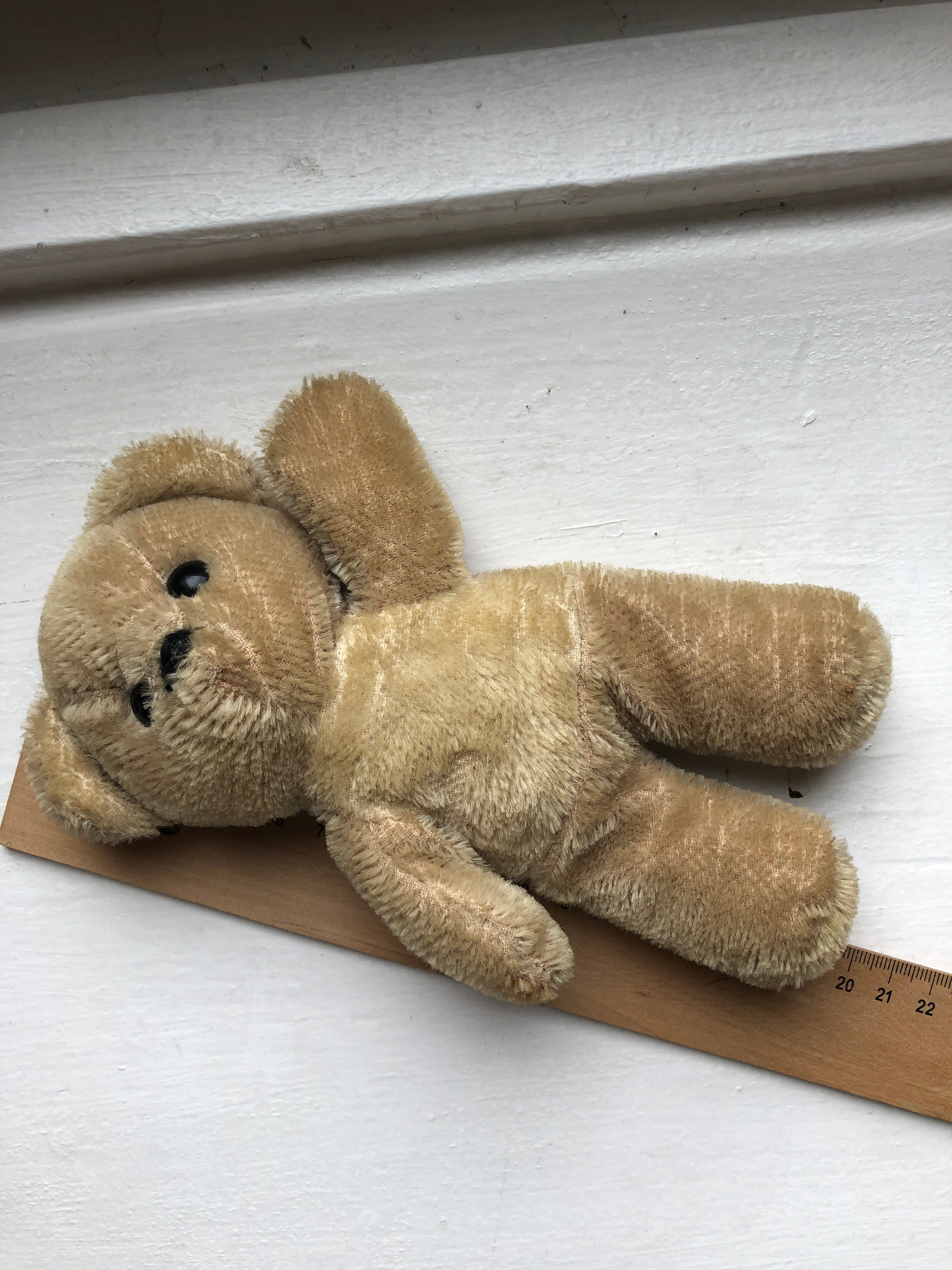 ちょこんと片手をあげた様子がかわいらしい古いクマ