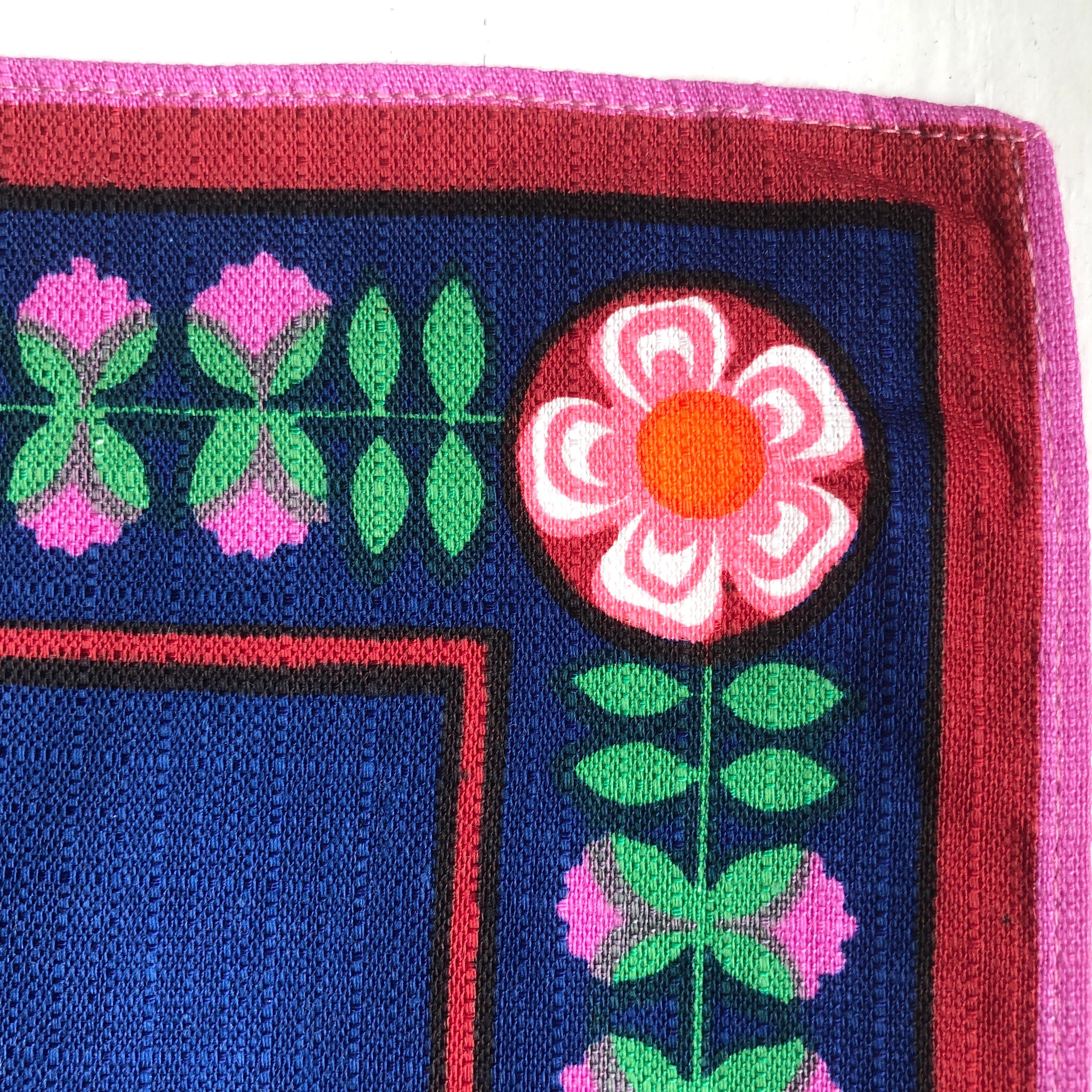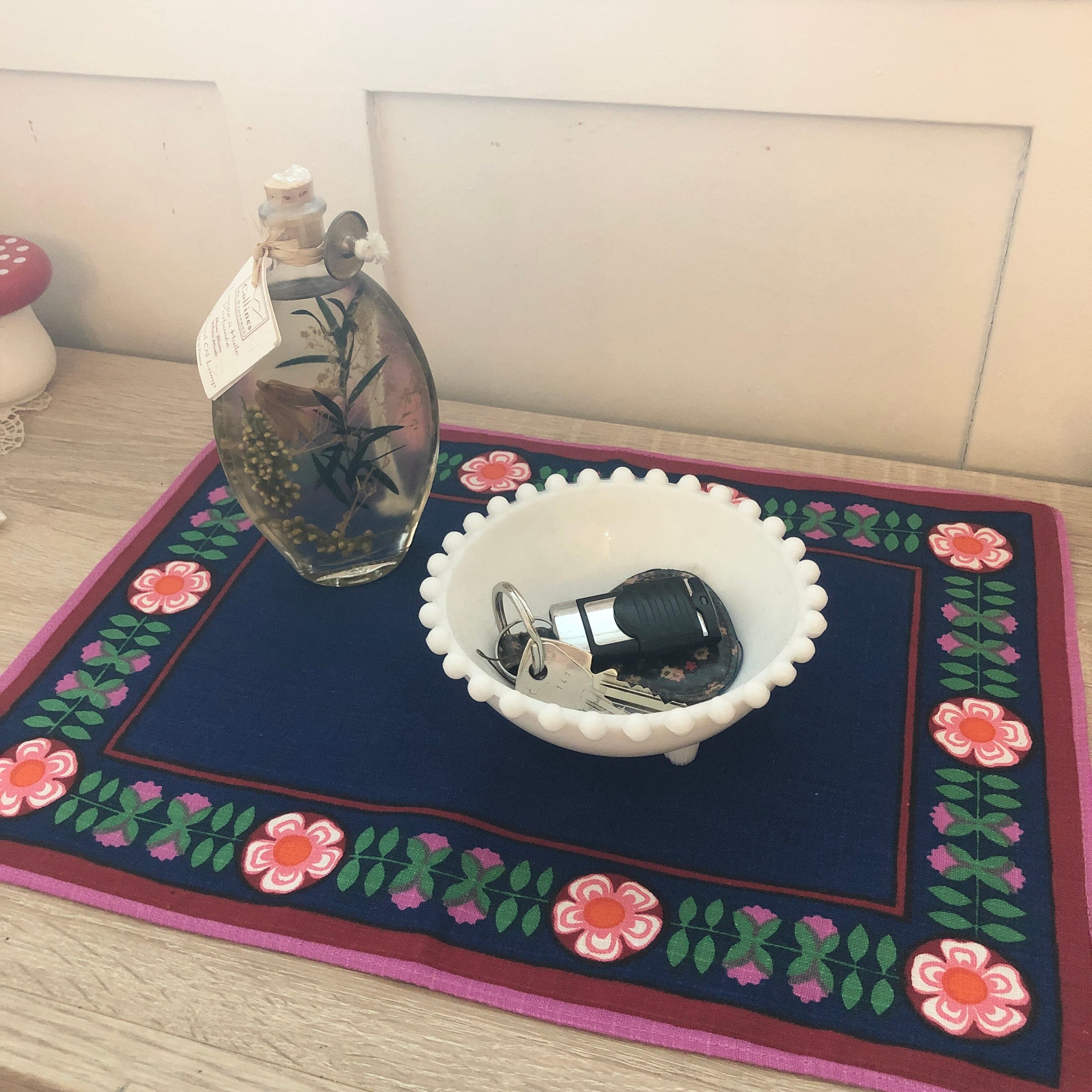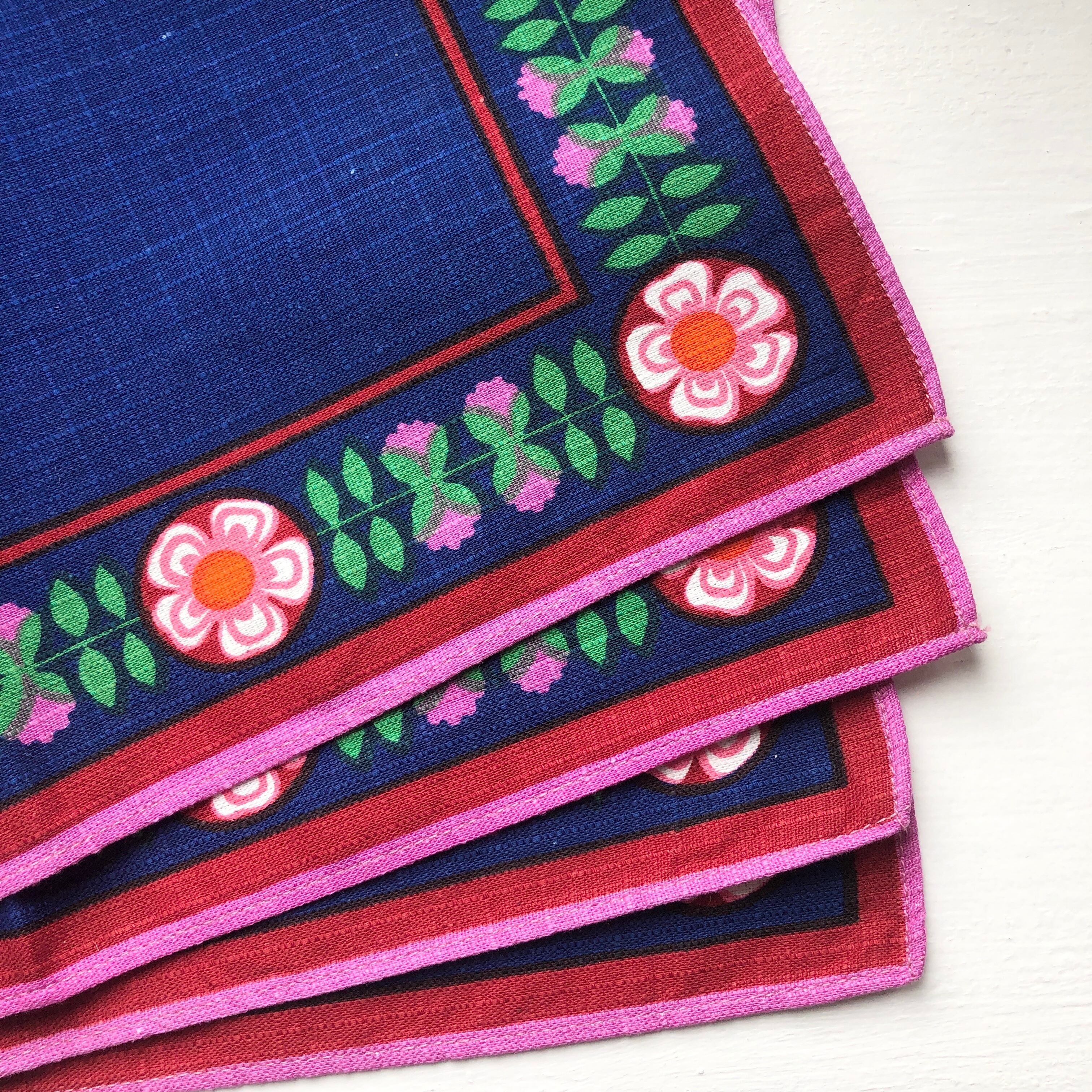 ネイビーに東欧を思わせるようなピンクの花模様が華やかなランチョンマットの4枚セットです。同じものがセットで残っていることは珍しく、テーブルコーディネートも楽しくなりそうです。