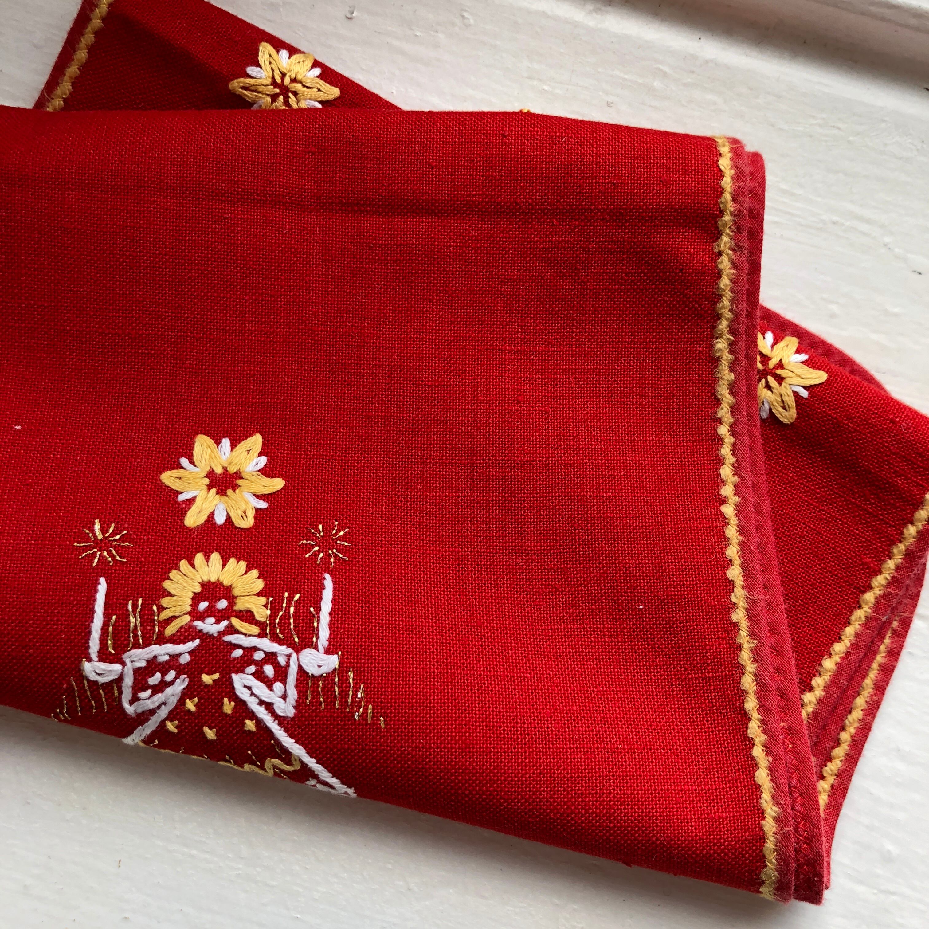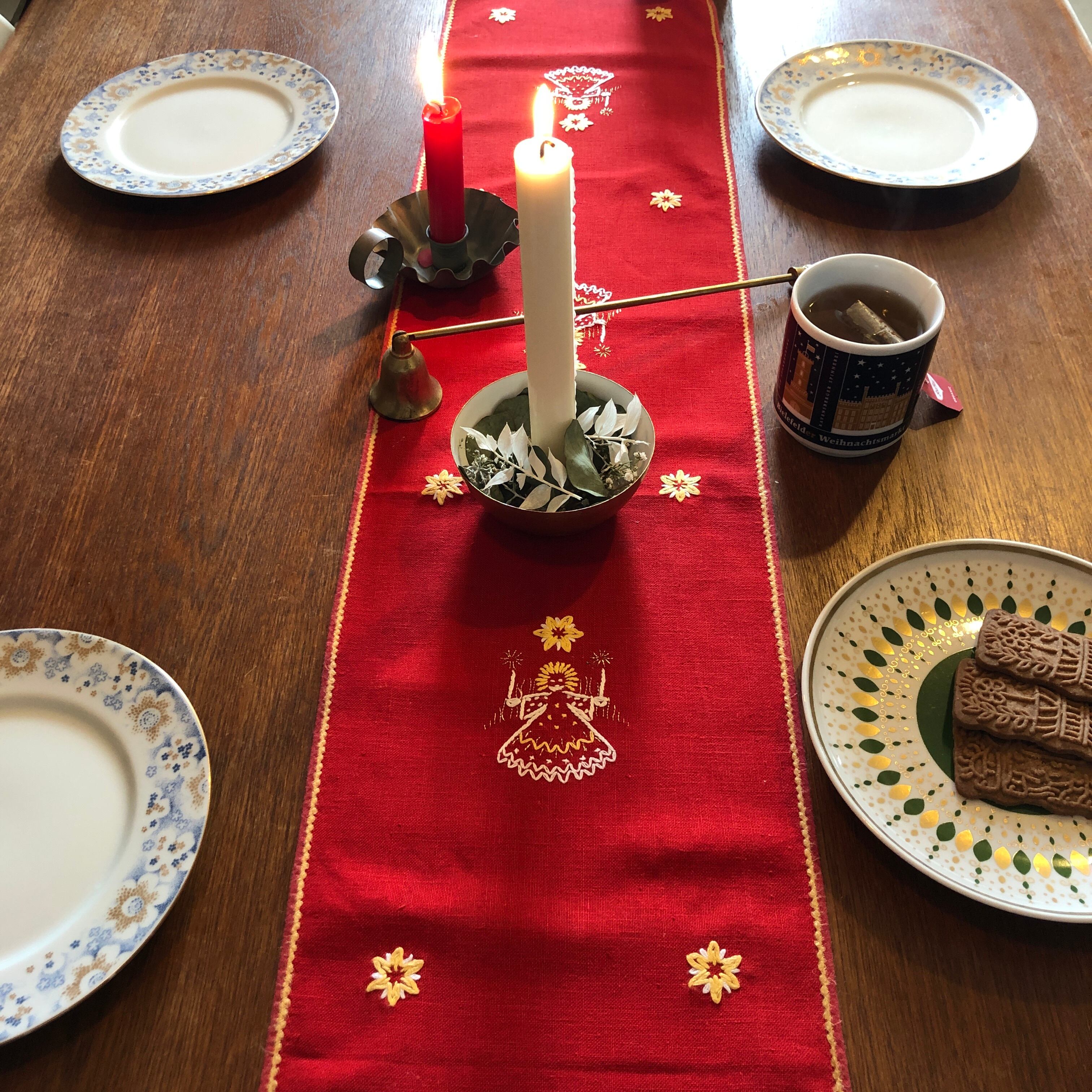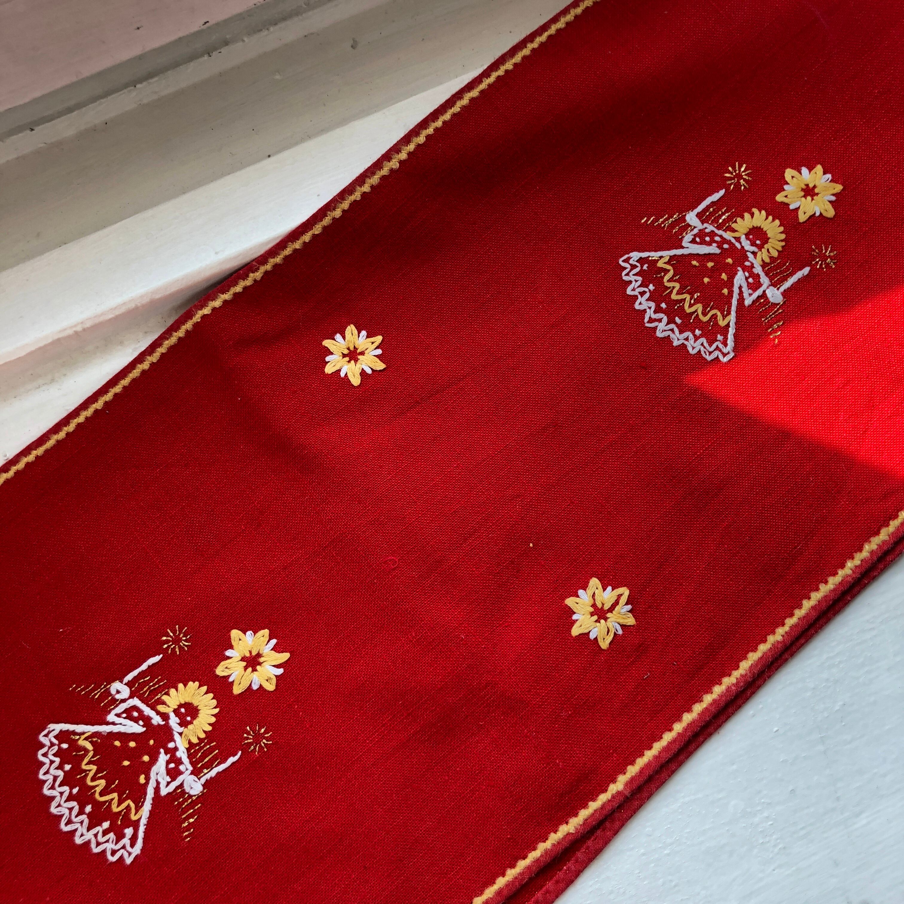 キャンドルを両手に持った天使が4か所に刺繍された赤いテーブルランナー。ゴールドの細い糸での刺繍がアクセントとなっています。
