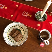 手仕事の素朴さがかわいい一枚です。きれいな赤い色でクリスマスの食卓を華やかにしてくれることと思います。