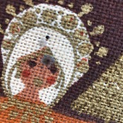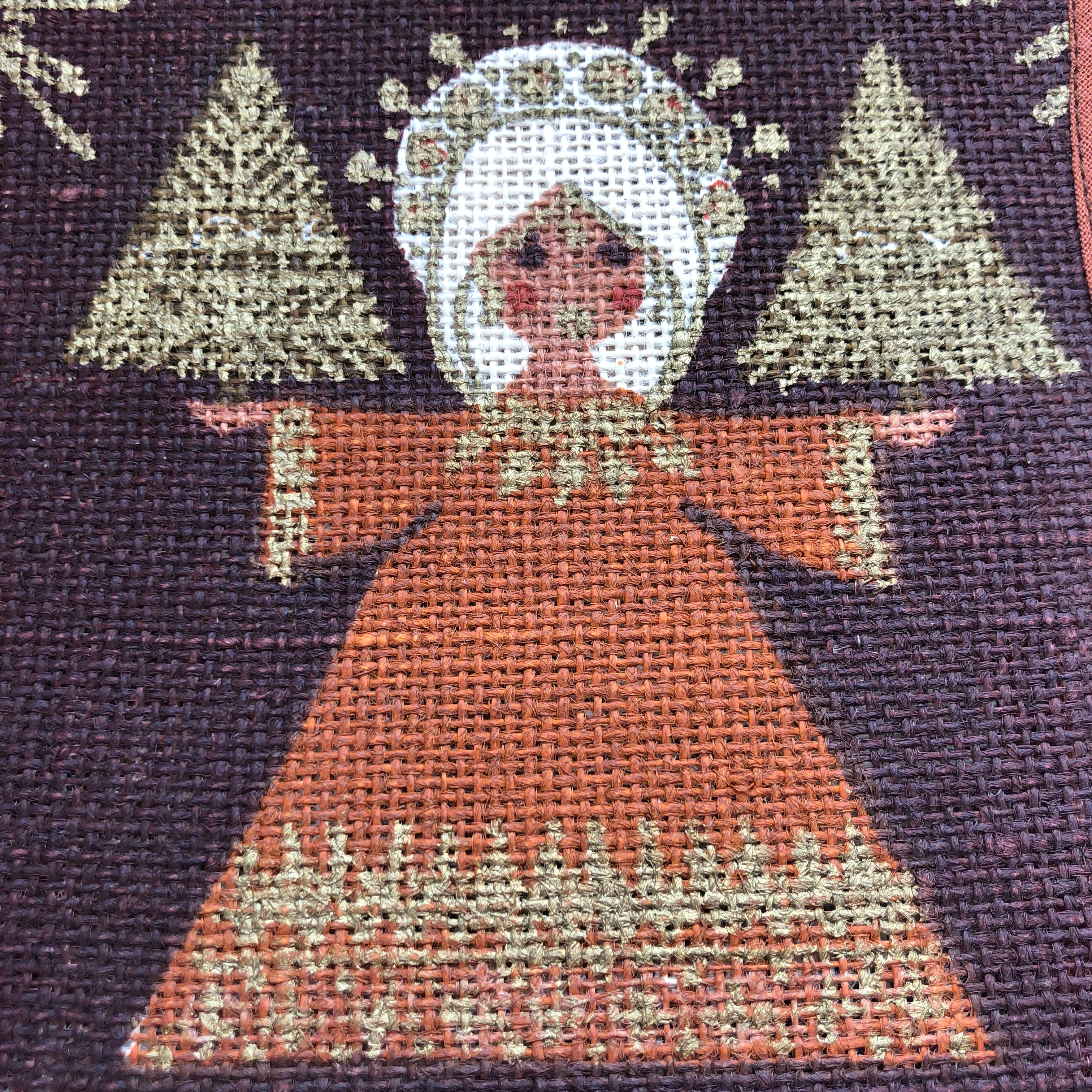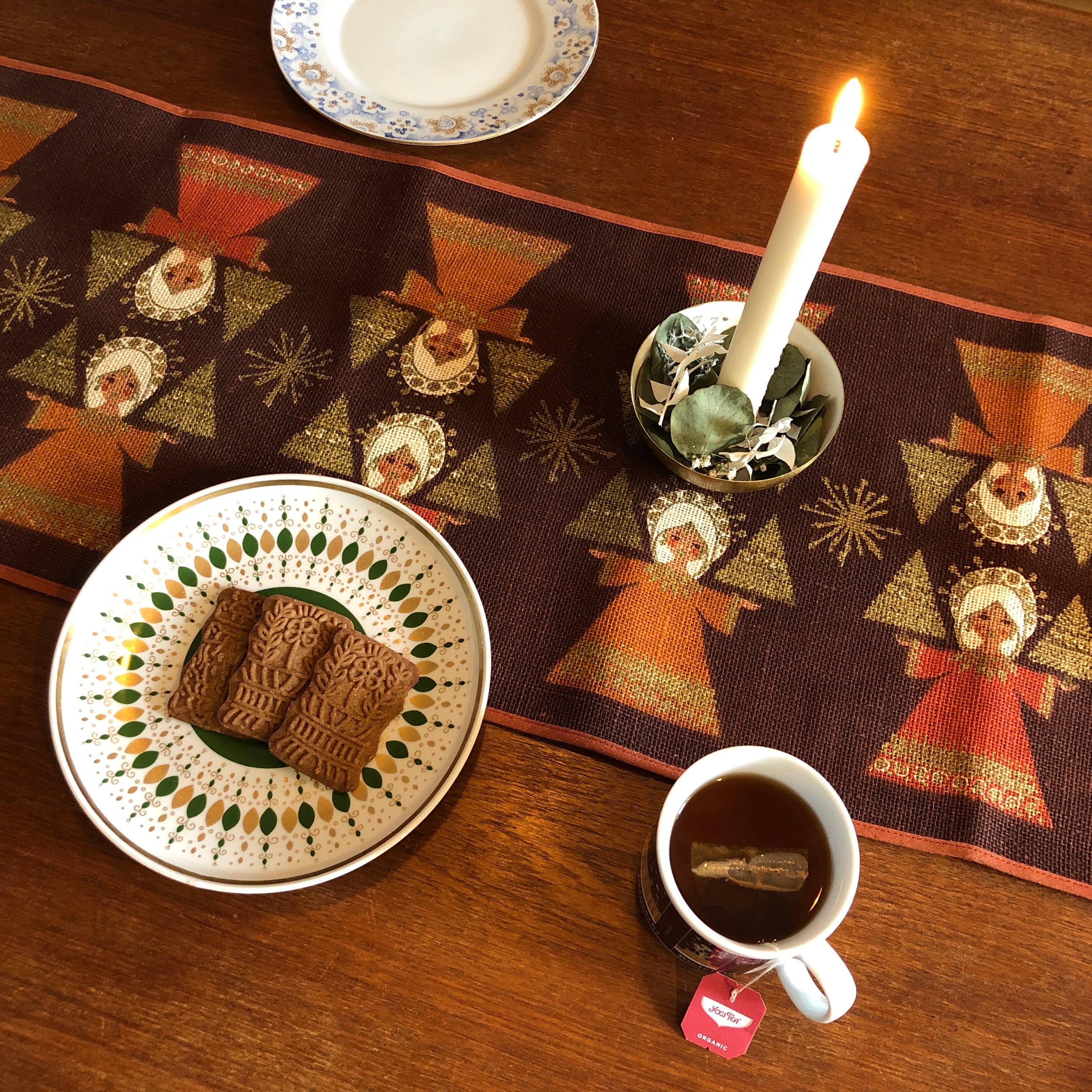 白とゴールドの豪華な帽子をかぶって、ツリーを両手に持ったかわいらしい女の子が並びます。シックな茶色でクリスマスのテーブルを華やかに彩ることができる1枚です。