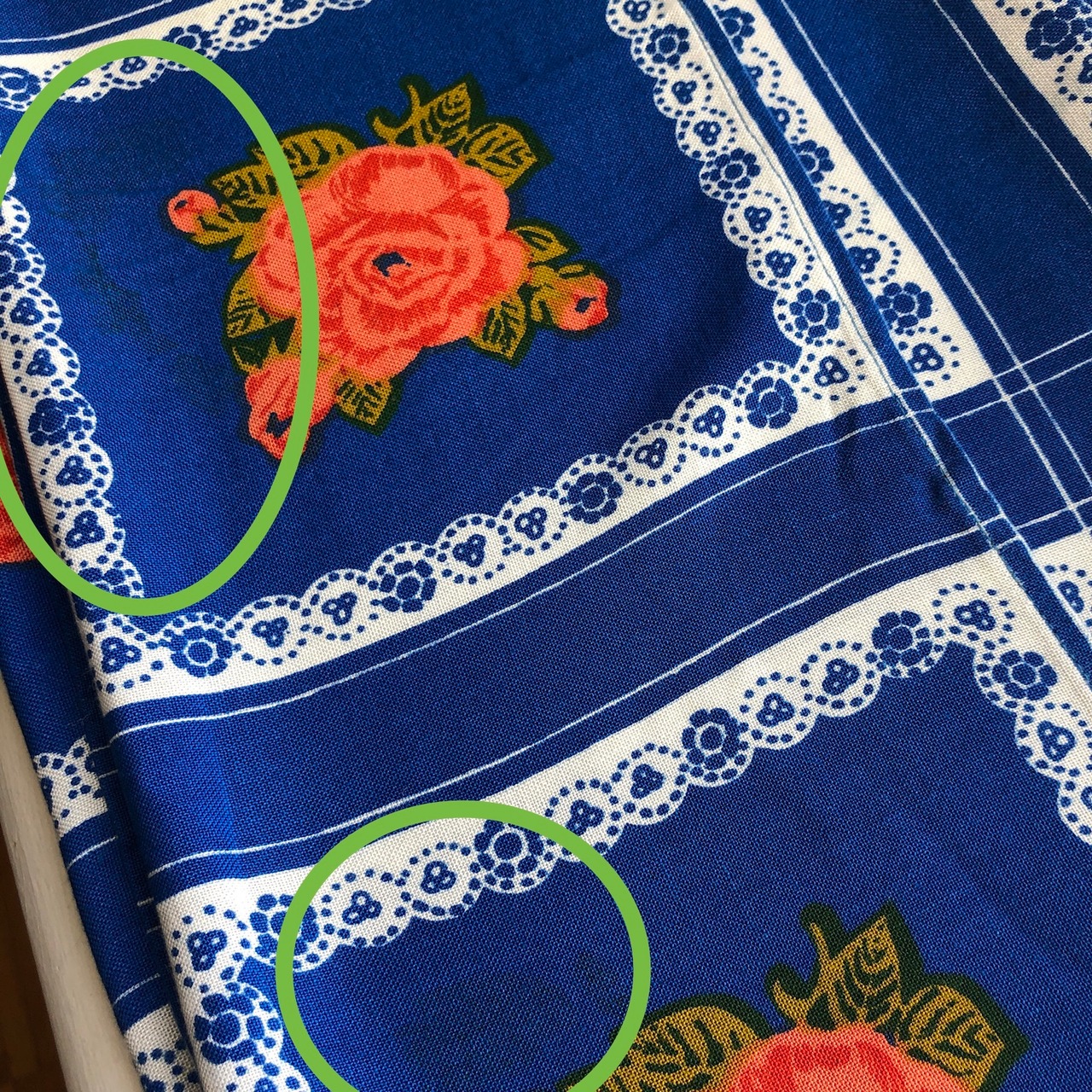 状態など:折り返した部分に大き目のシミがあります。色の抜けた箇所があります。洗うと落ちそうなシミが一点あります。状態が気になる場合は、ぜひお問い合わせください。