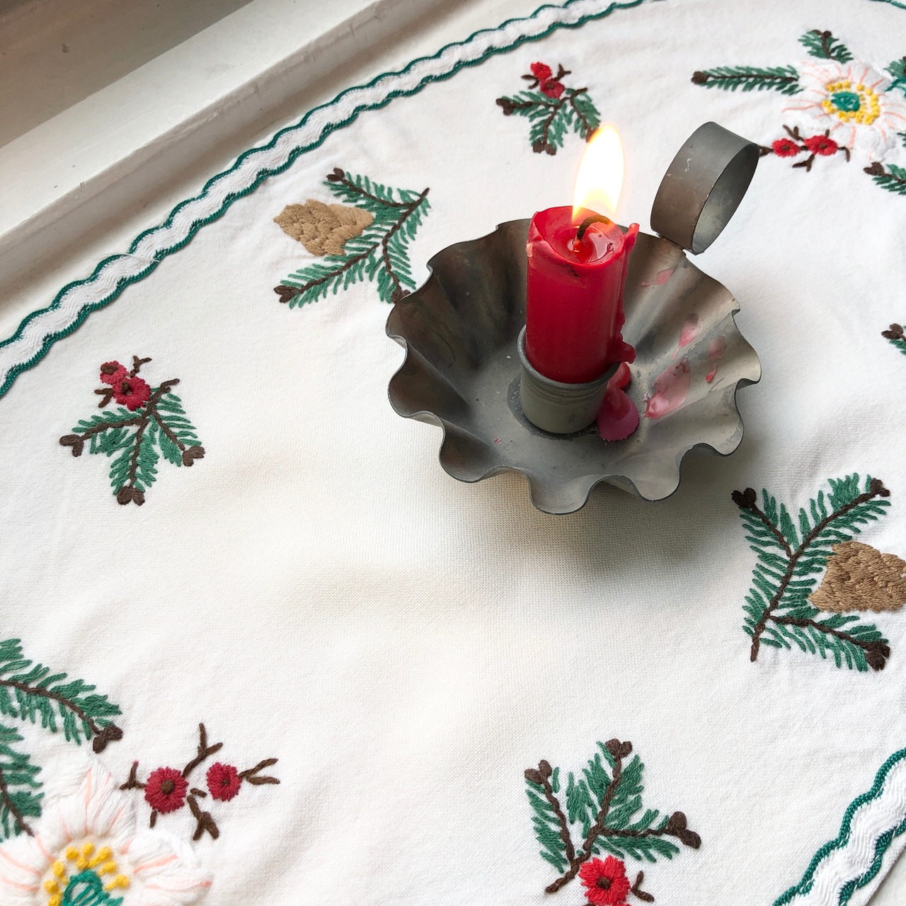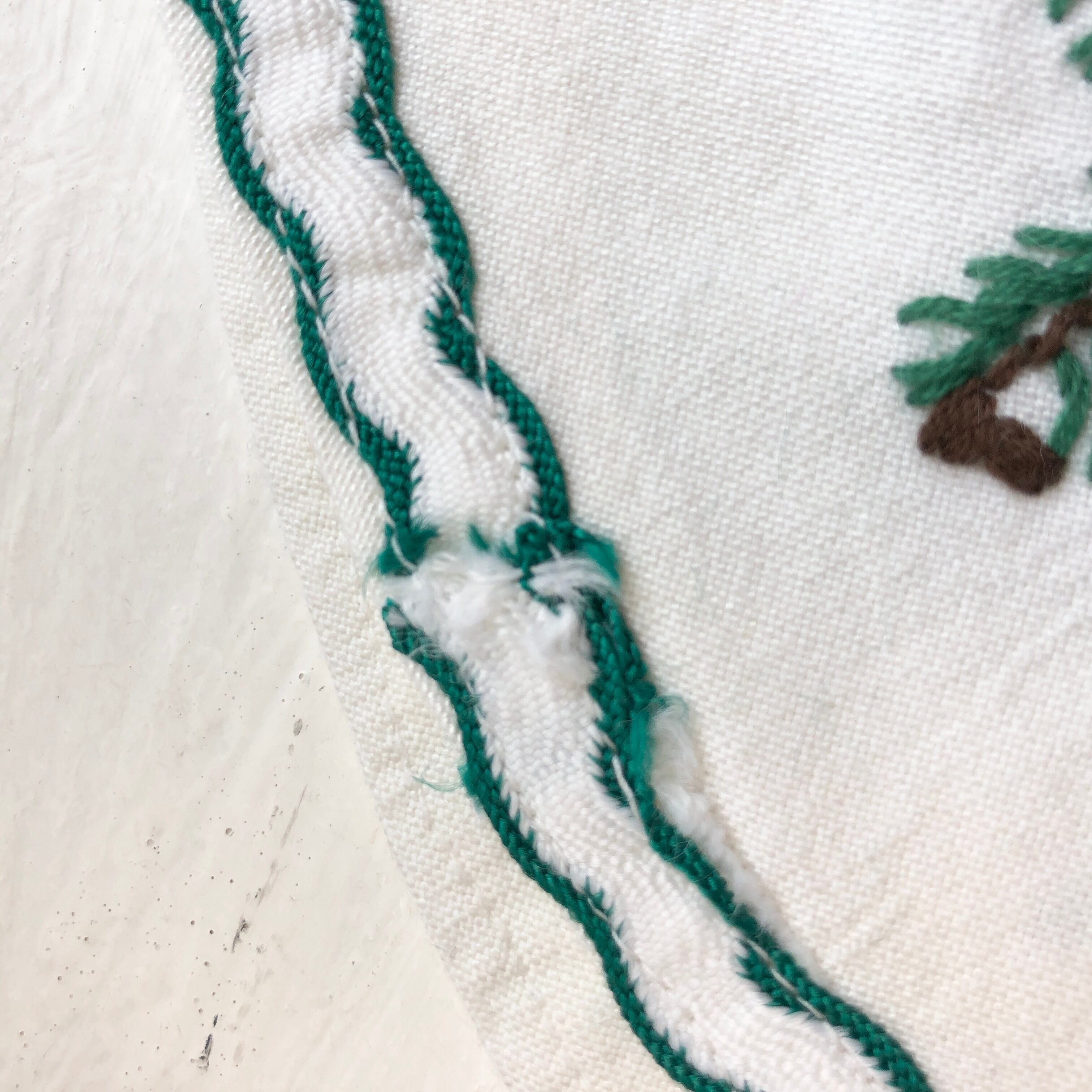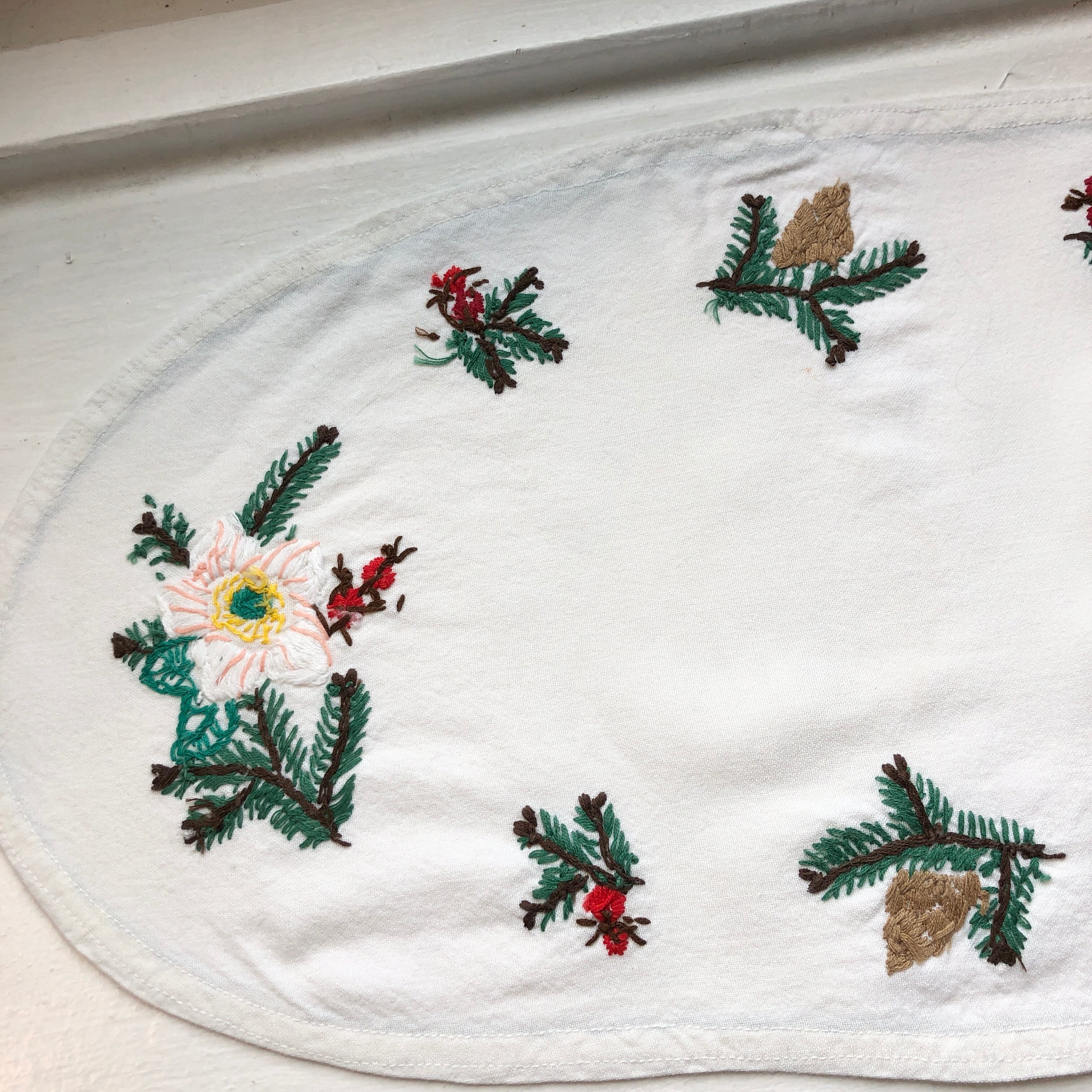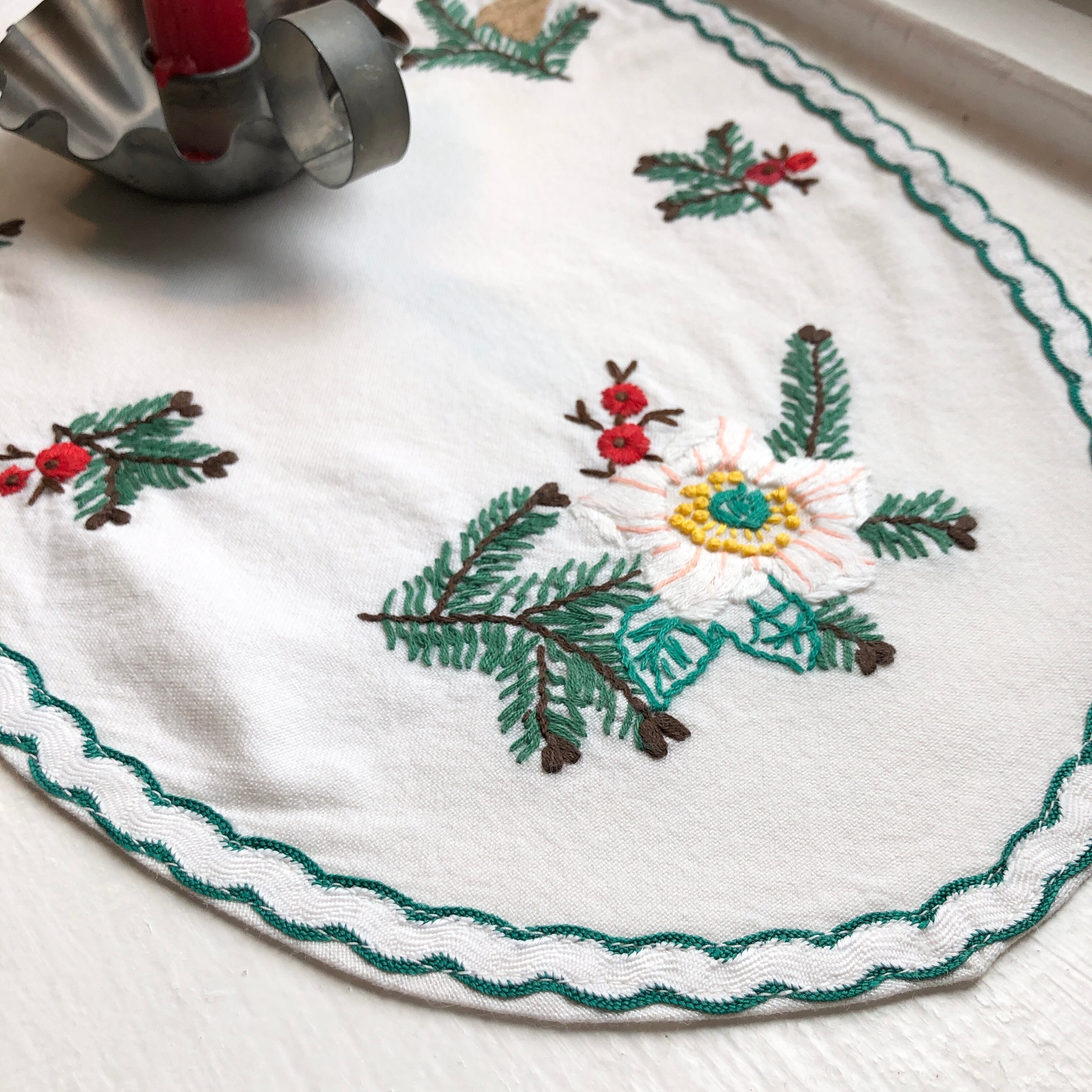 クリスマスローズに赤い実、松ぼっくりやもみの木の枝が刺繍された素朴でノスタルジックなオーバルのクロスです。周りを囲む緑のテープがアクセントになってかわいい一枚です。一生懸命刺繍がほどこされた様子が伝わってきます。