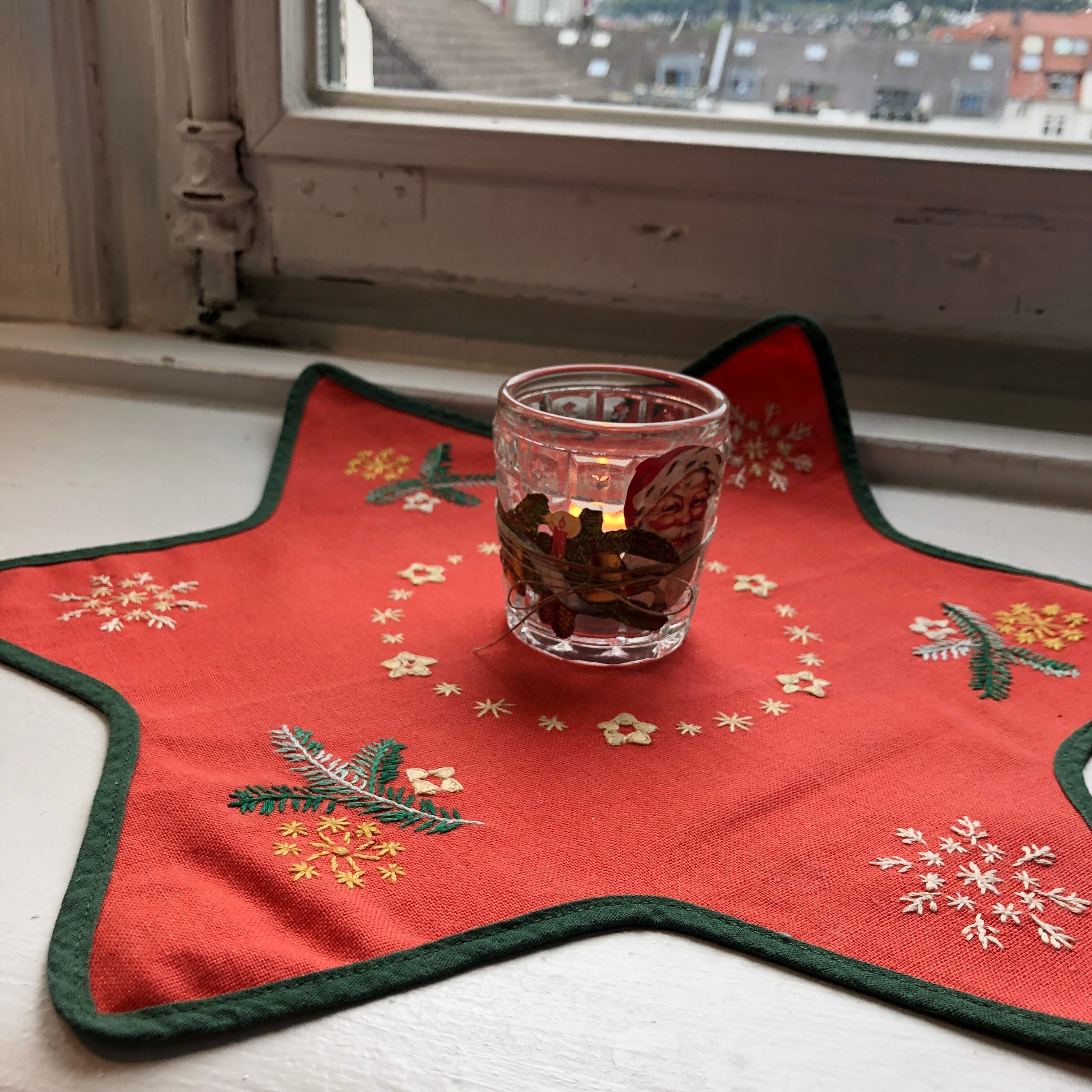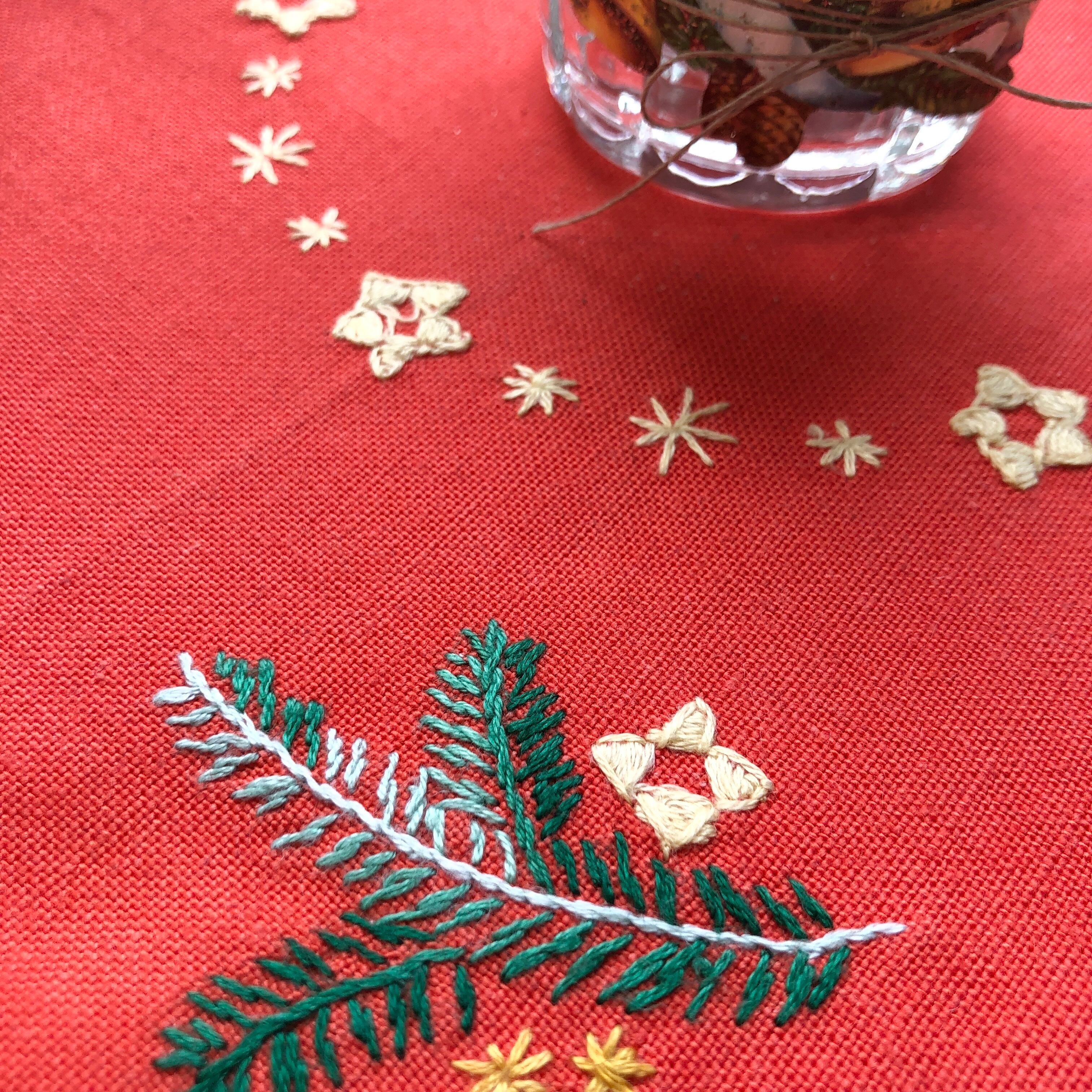 雪の結晶や黄色い小花、もみの木の枝が丁寧に刺繍されています。周りは緑のパイピングテープで縁取られています。