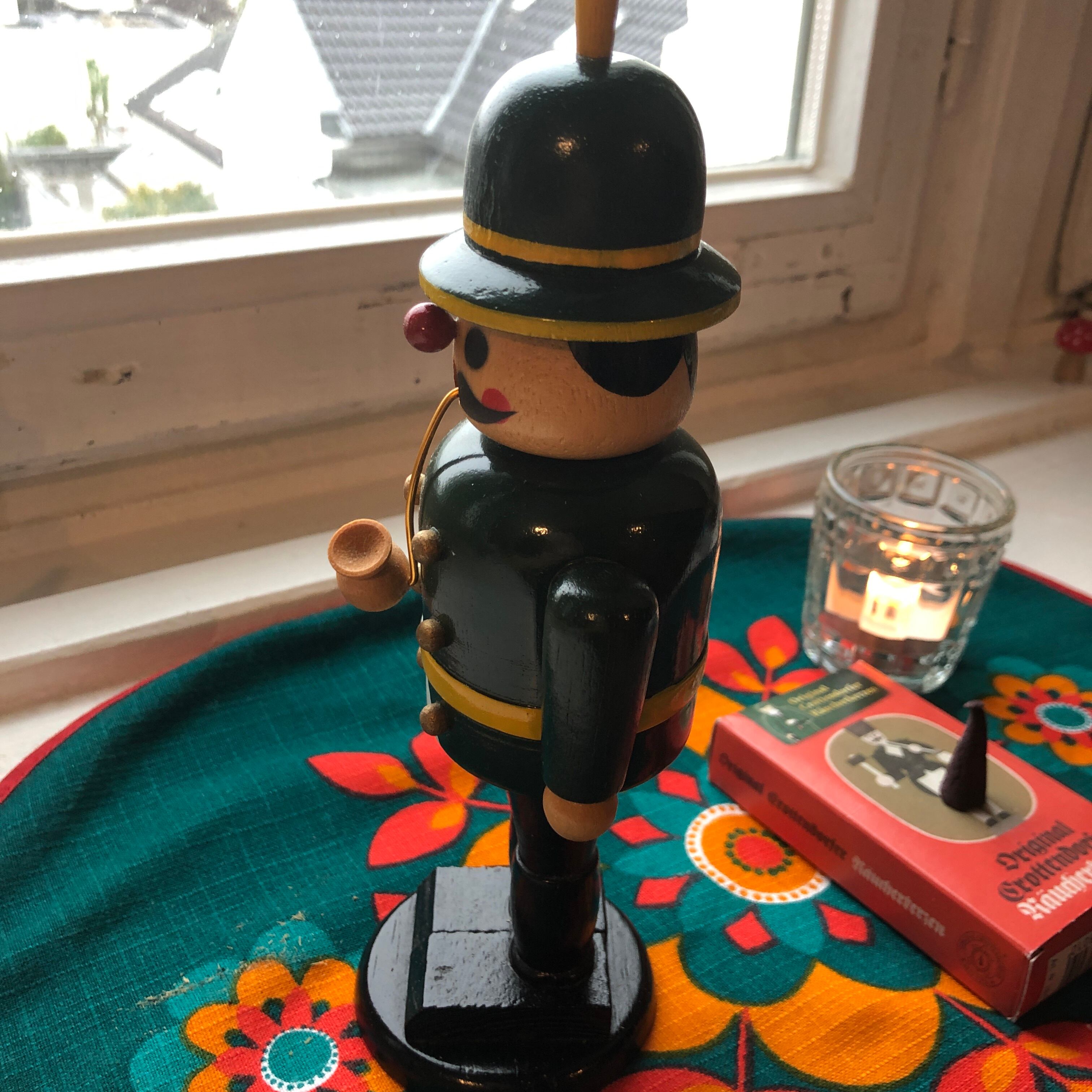 緑の制服に金ボタン。赤い鼻をしてパイプをくわえた兵隊さんです。愛嬌のある丸い目をしてほっぺを赤くしています。