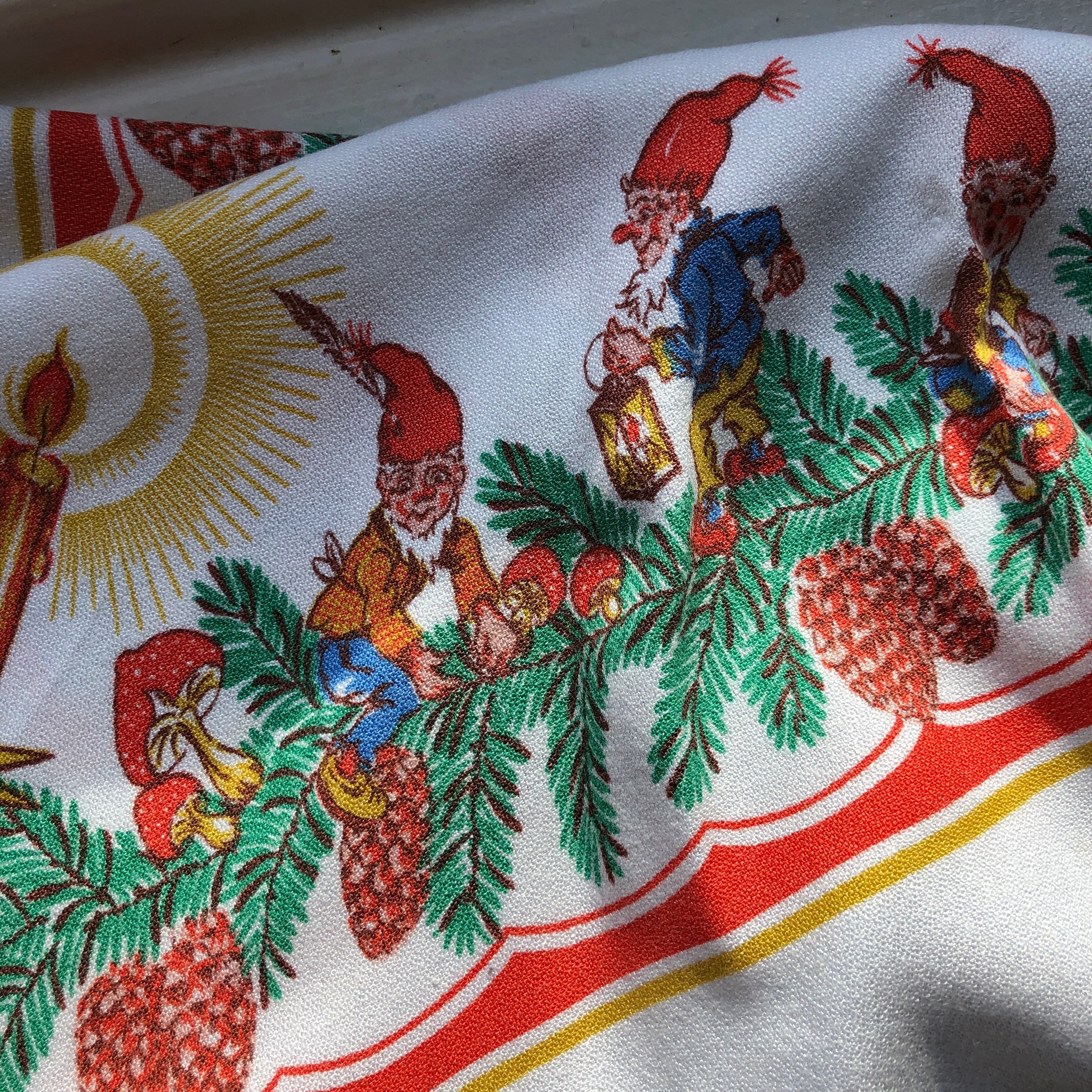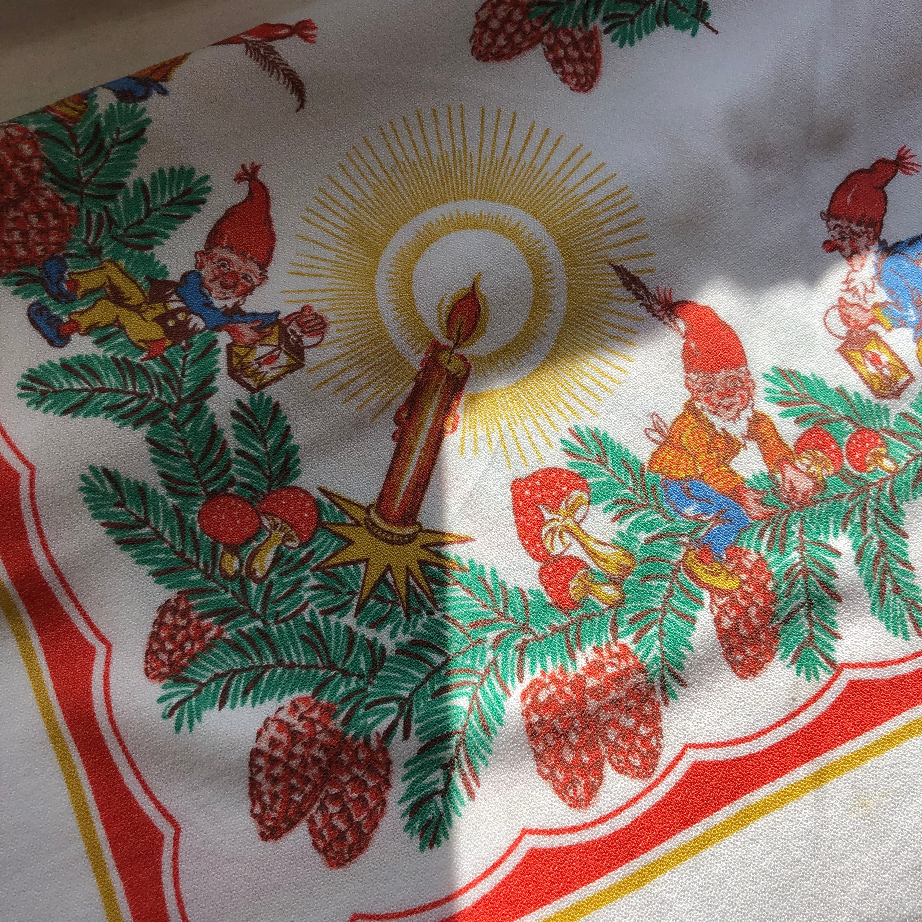 光り輝くキャンドル、キノコ狩りをするたくさんの小人たちの表情が楽しめるクリスマスクロスです。ランタンを片手にキノコをさがす小人たち。中央にもたくさんのキノコと松ぼっくりが。