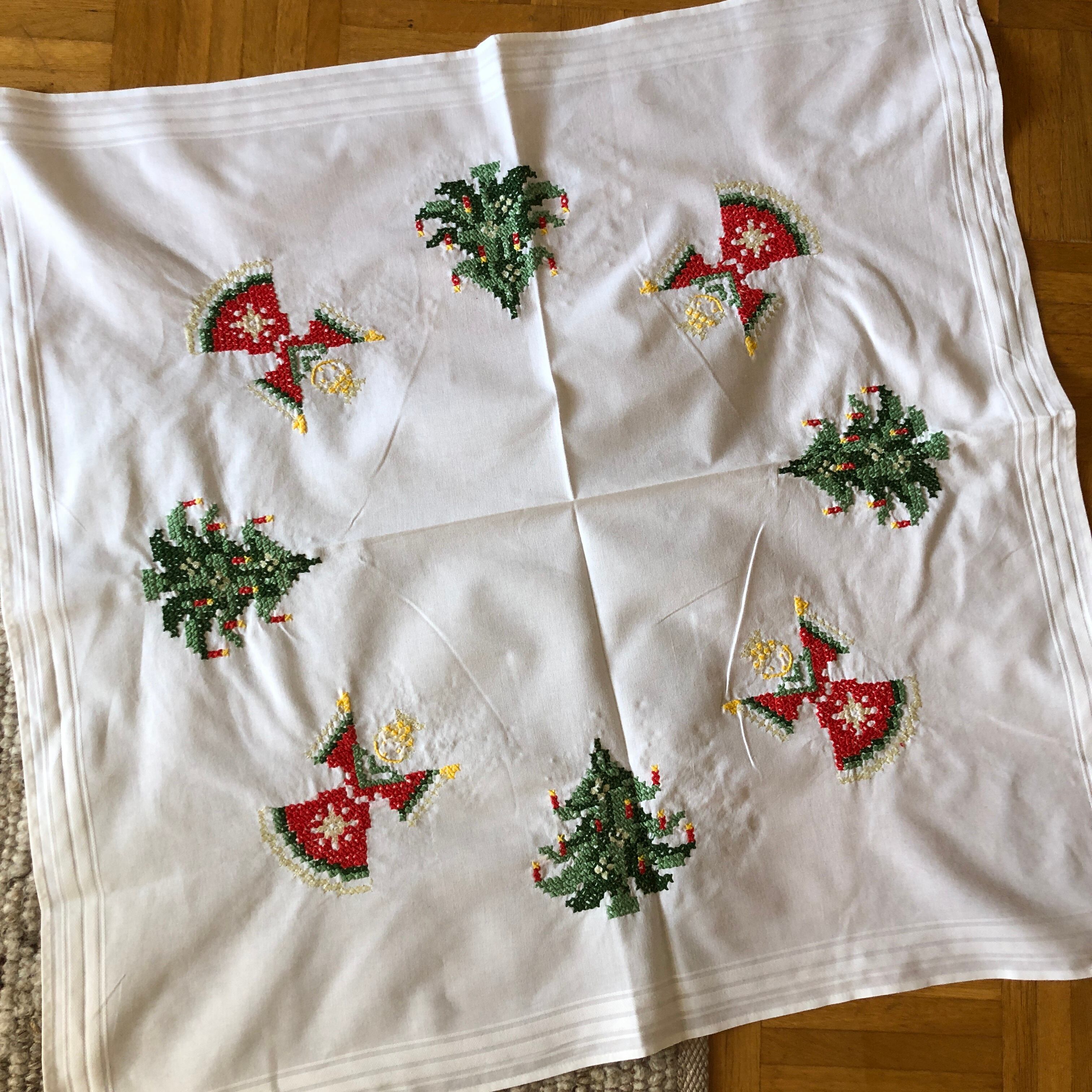 白い張りのあるコットン地に4つの天使と4つのクリスマスツリーのクロスステッチ刺繍がほどこされた刺繍クロスです。