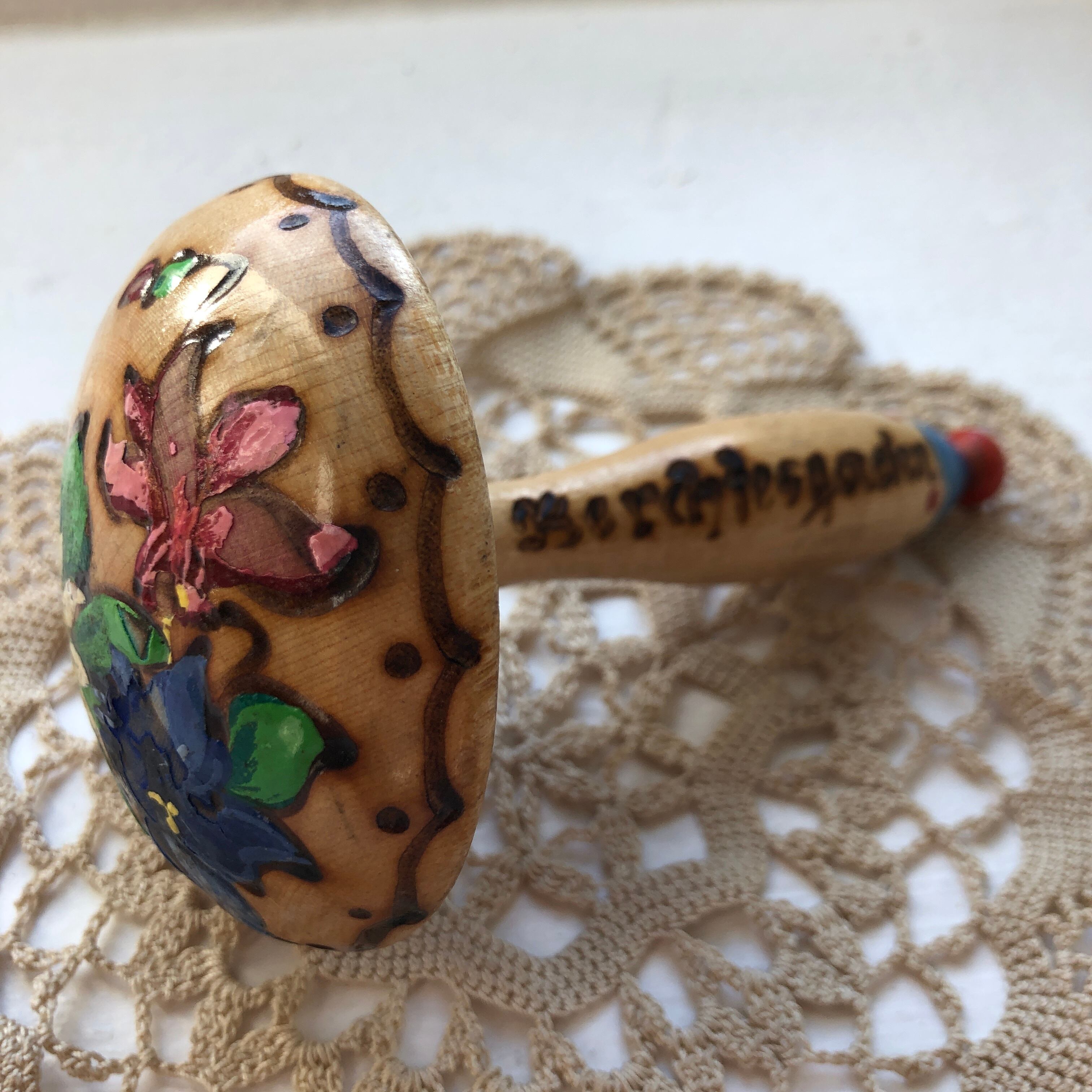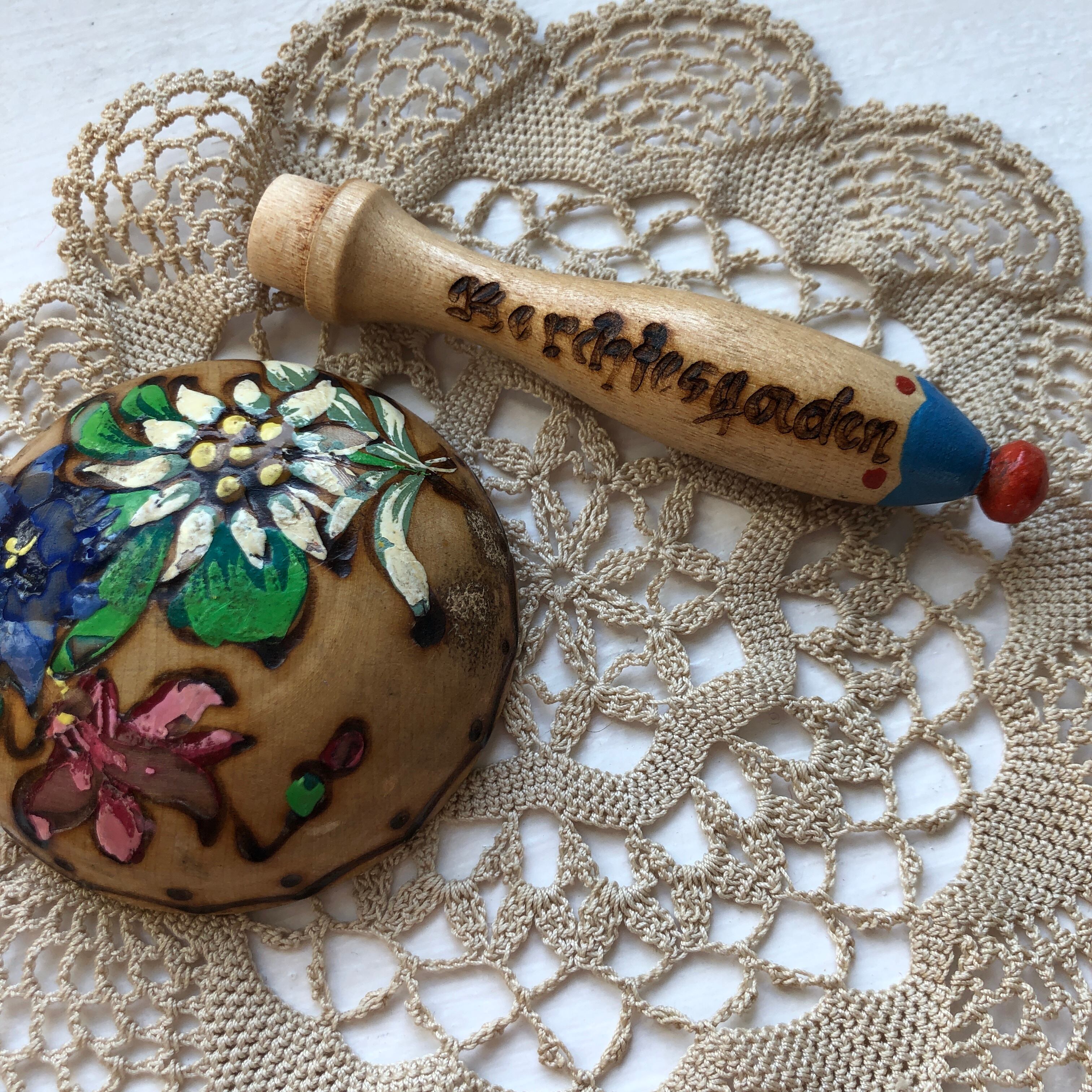 ドイツとオーストリアの国境にある山岳地帯であるベルヒテスガデンという地名が彫られたダーニングマッシュルーム。焼きごてで、エーデルワイスなどの花も描かれています。軸の根元は水色と赤でペイントされていてとても凝った一点です。