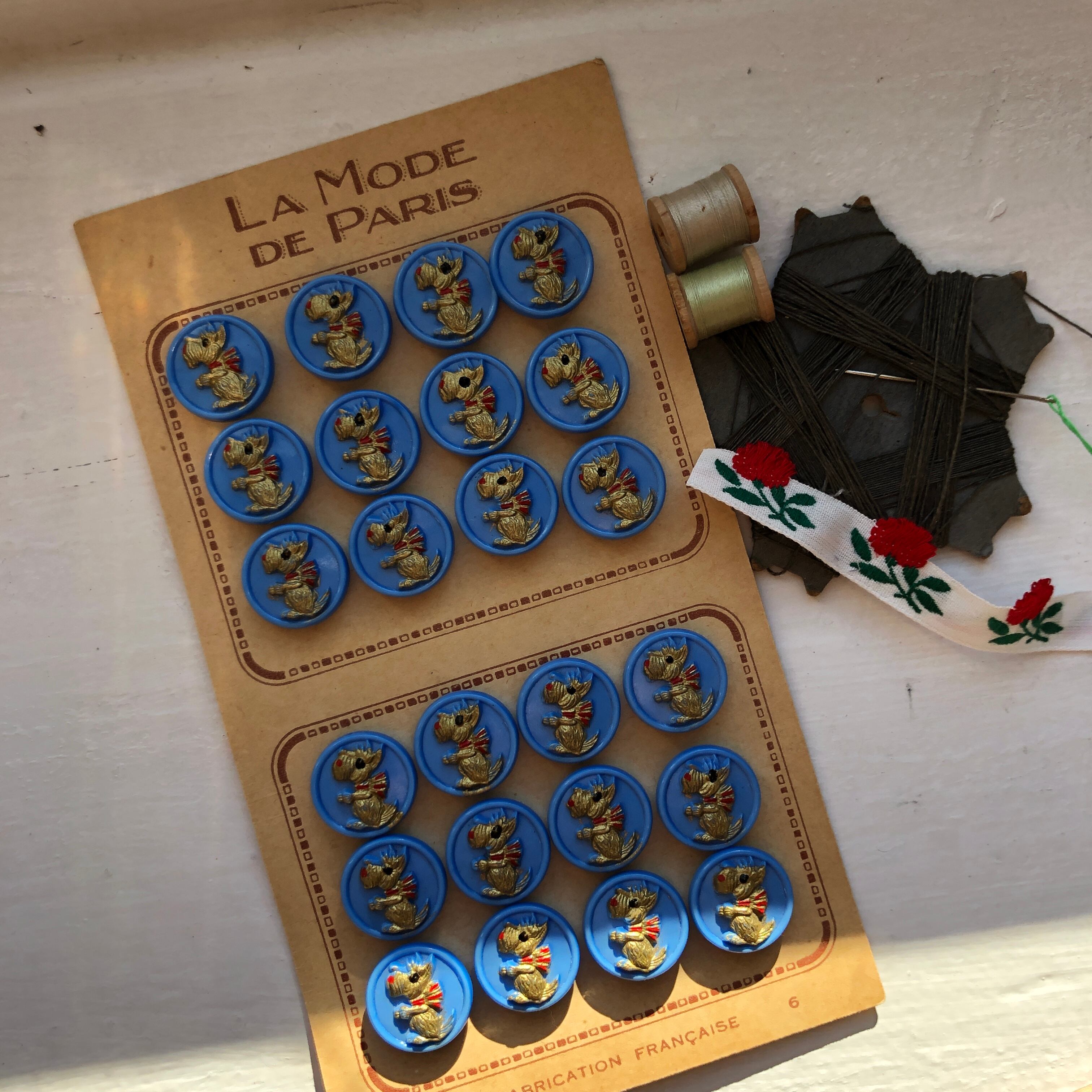 ゴールドのぱっちりお目目のテリア。赤いリボンをつけています。時々ペイントが雑なものがあります。1つでも存在感のあるボタンなので、お洋服のポイントにどうぞ!アクセサリー作り、手作り小物やコラージュなどのアレンジにもピッタリです。もちろんシートとして飾ってもかわいい1枚です。