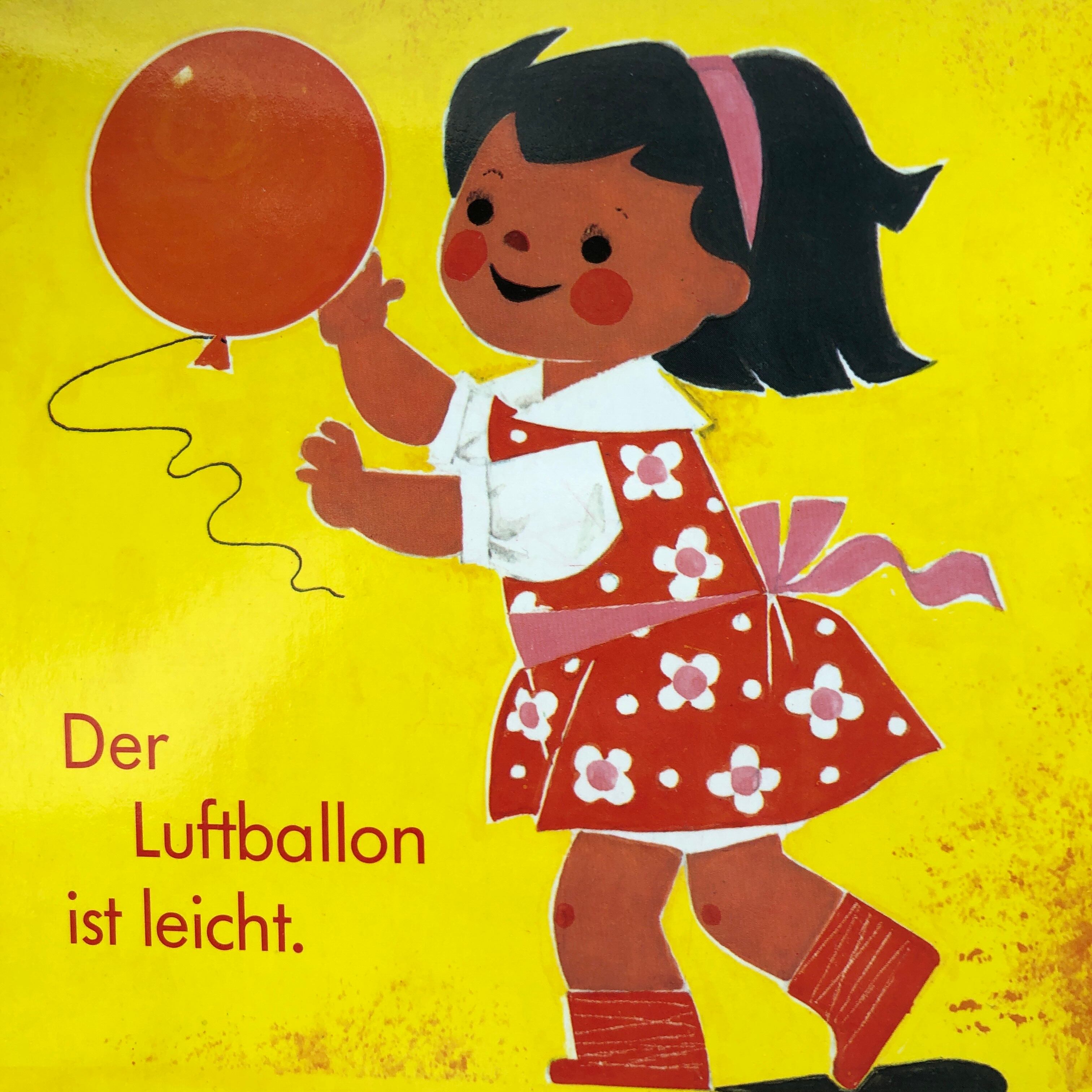 荷物は重いよ。風船は軽いよ。などといった対比や、かくれんぼするよ。どちらさまですか?などと子供の日常の風景がカラフルで元気なイラストで描かれています。