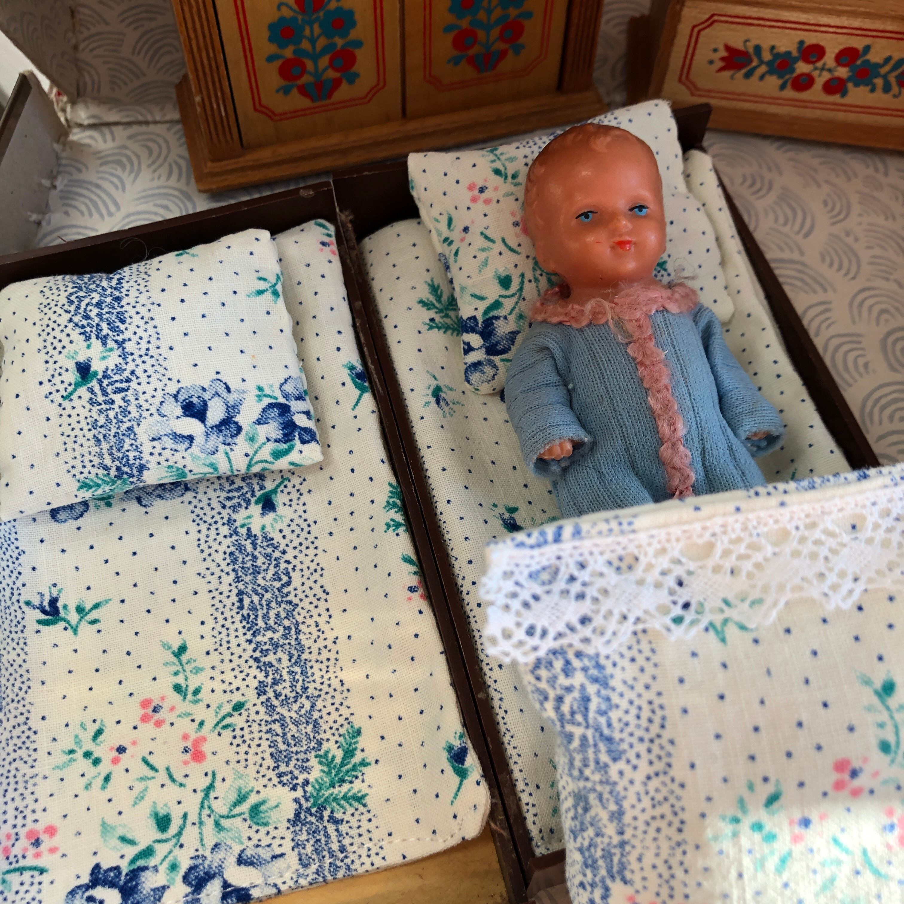 フォークロアな花柄のかわいい木製のしっかりした作りの洋服ダンス、お揃いの棚、ゆりかごになるベビーベッドなどたくさんの家具がついています。ベッドはシンプルなプラスチック製のものですが、ヴィンテージのジャーマンファブリックで作った布団が敷かれています。