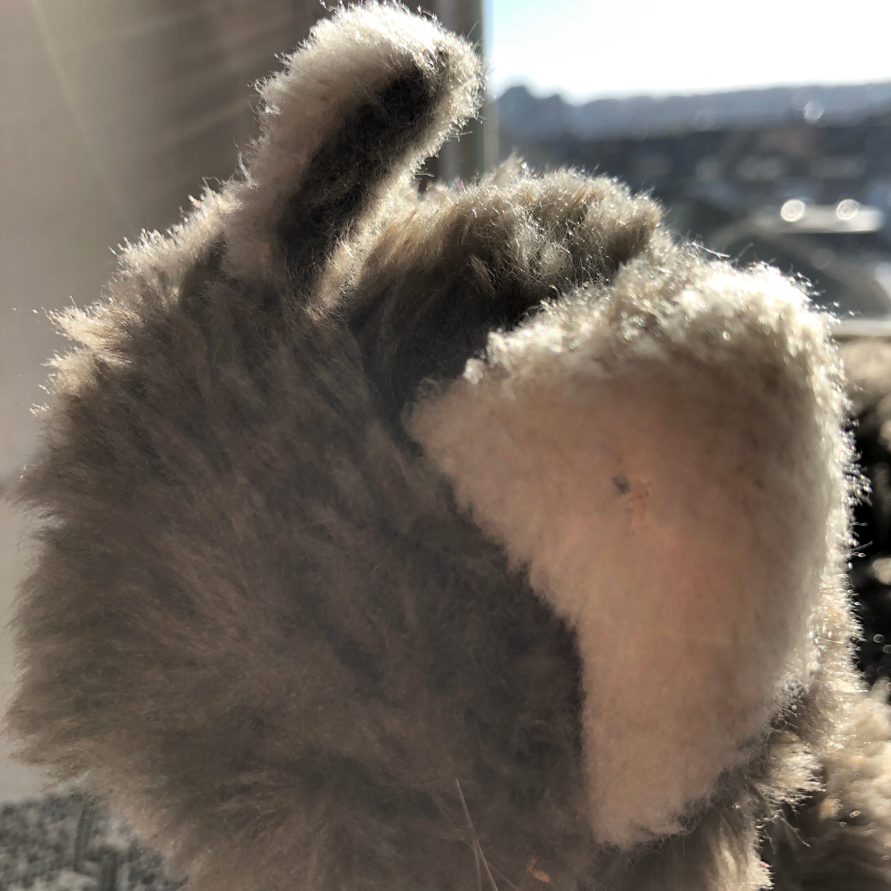 薄汚れた感じがあります。頭には木毛、胴体は綿が詰まっています。モヘア素材ではないので、洗剤のついた布などで軽く拭いたりすることはできると思います。