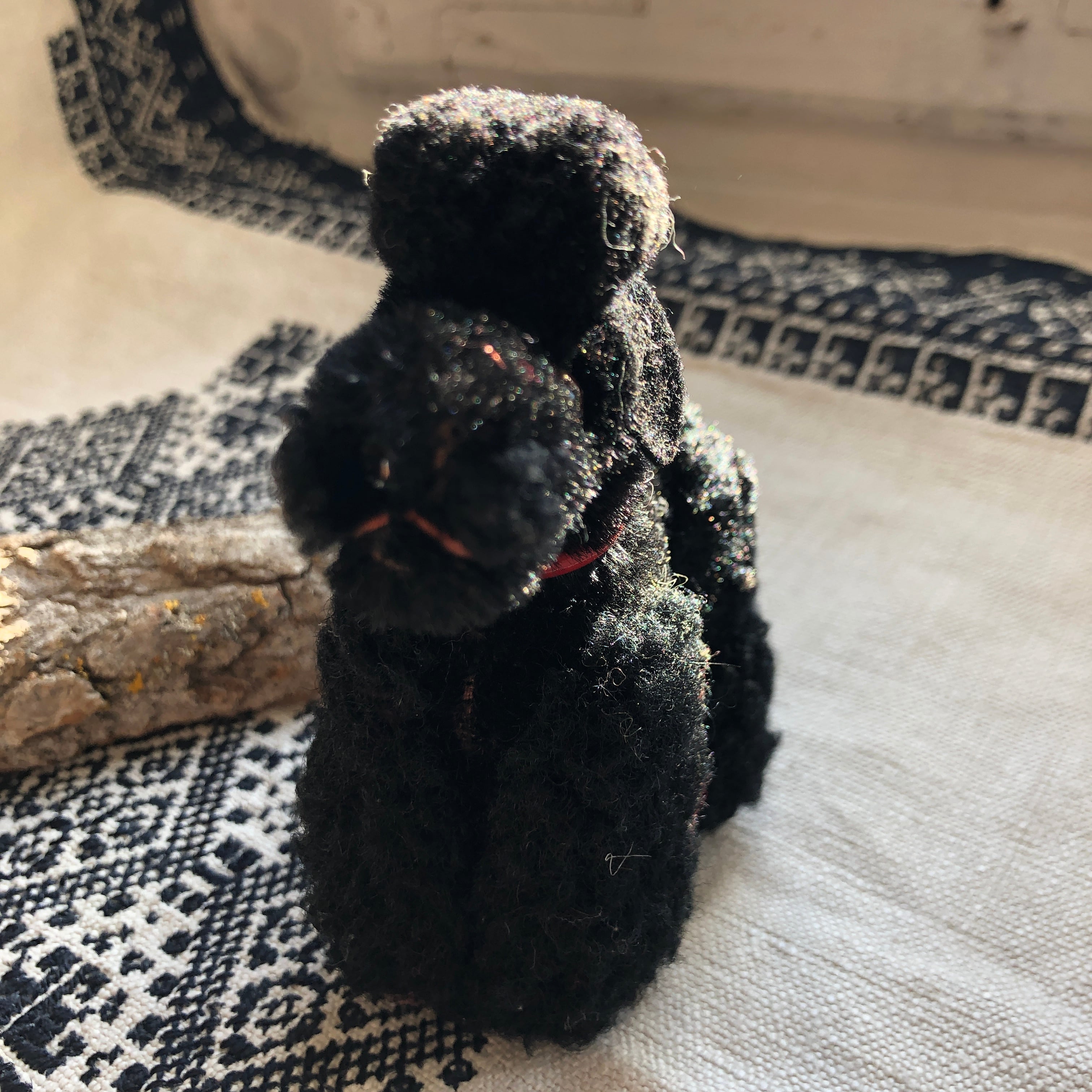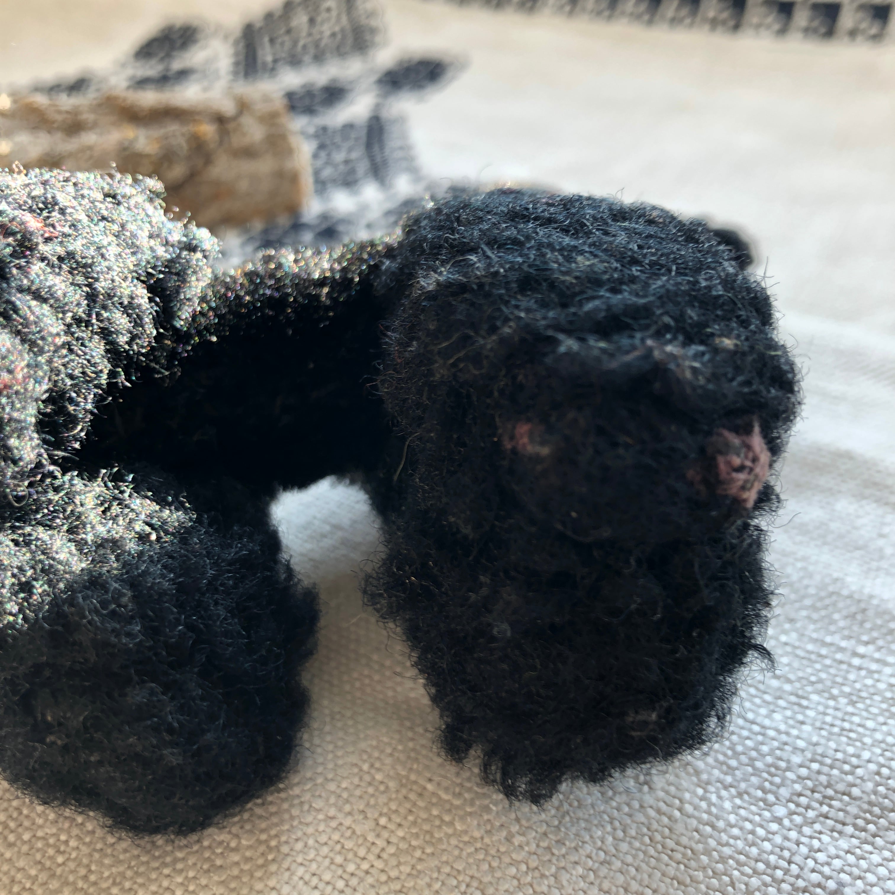小さな黄色のグラスアイ、刺繍による口、フェルトの耳、鼻もガラスのようです。そしてオリジナルの赤い首輪がついています。
