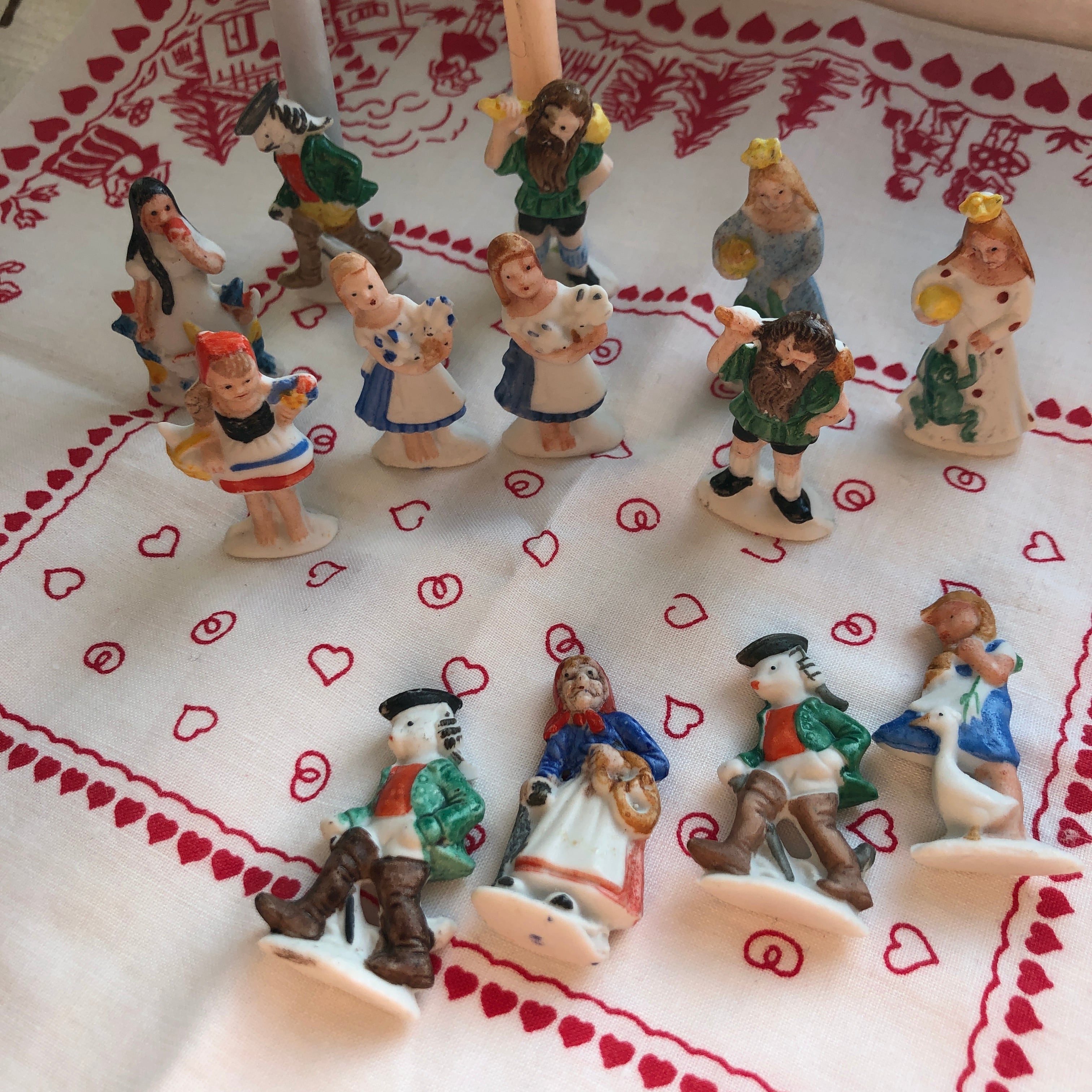 ハンドペイントで、デザインは作成者に任せられていたものらしく、同じ人形でも違う色の服を着ていたりします。自立するものもあれば、自立しないものもあります。写真でご確認、あるいはお問い合わせください。