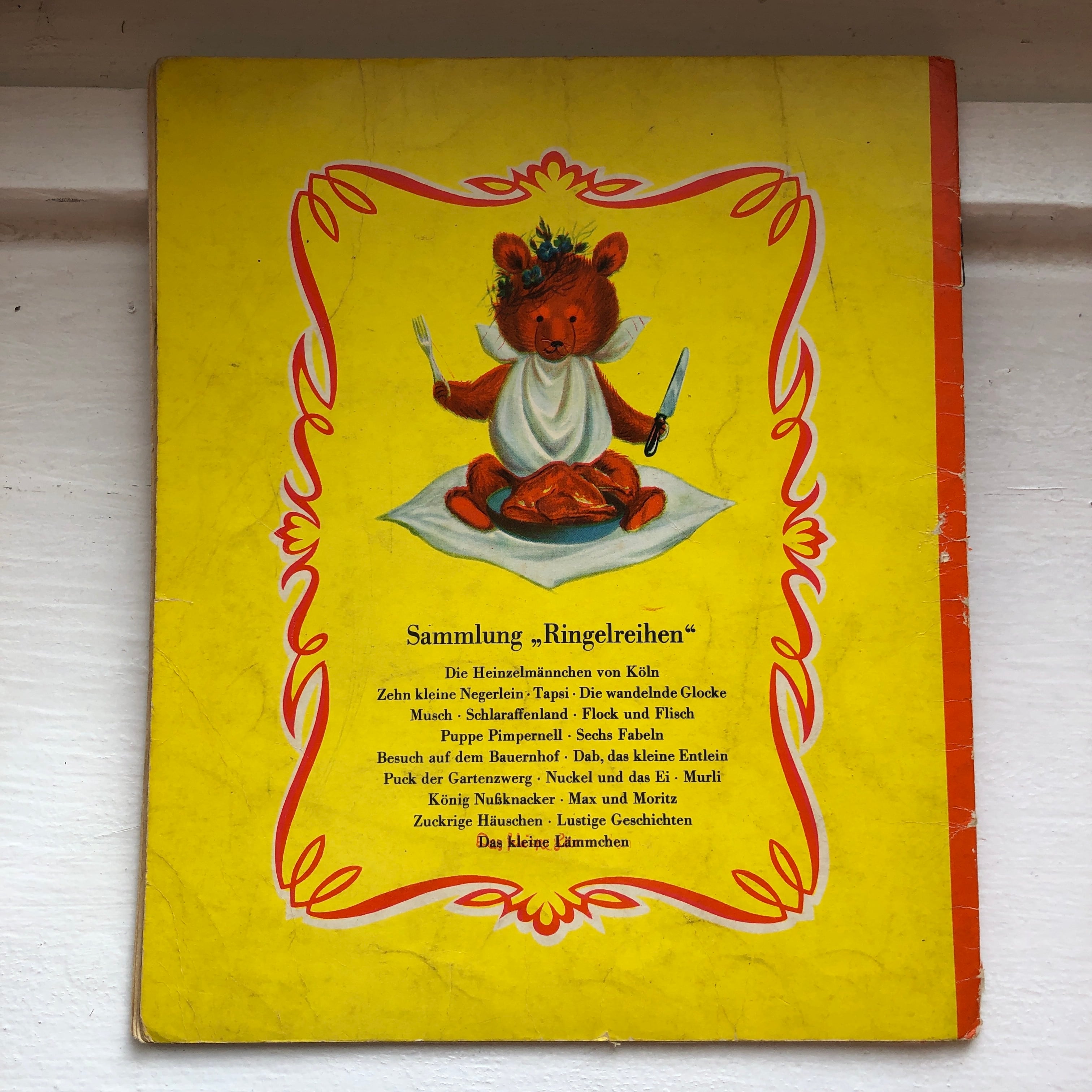 状態など:とても古い絵本で、ホチキスで綴じられたページが抜け落ちています。赤いボールペンによるいたずら書き、名前、数字の書き込みがあります。表紙の下が破けています。