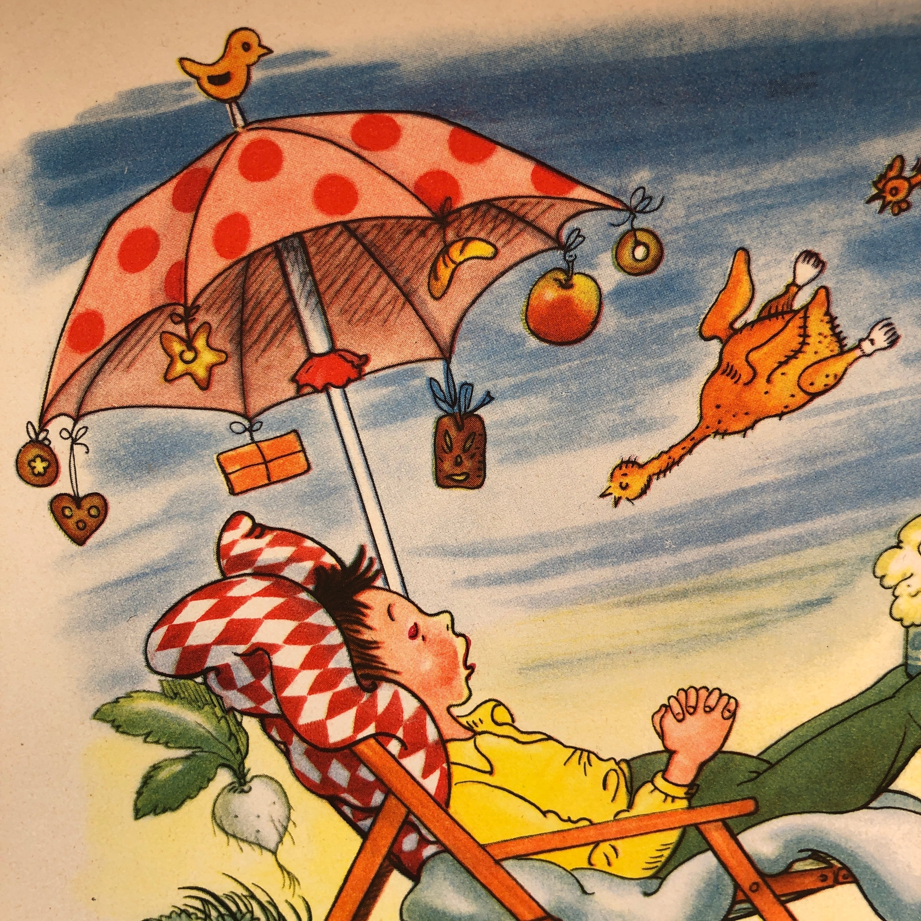 子供にとっては、山はケーキで出来ていて、木にはパンがなり、柵にはソーセージがぶら下がっていて、空をチキンが飛んでいます。井戸からはぶどうジュースが出てきて、レンガはジンジャーブレッドで出来ています。