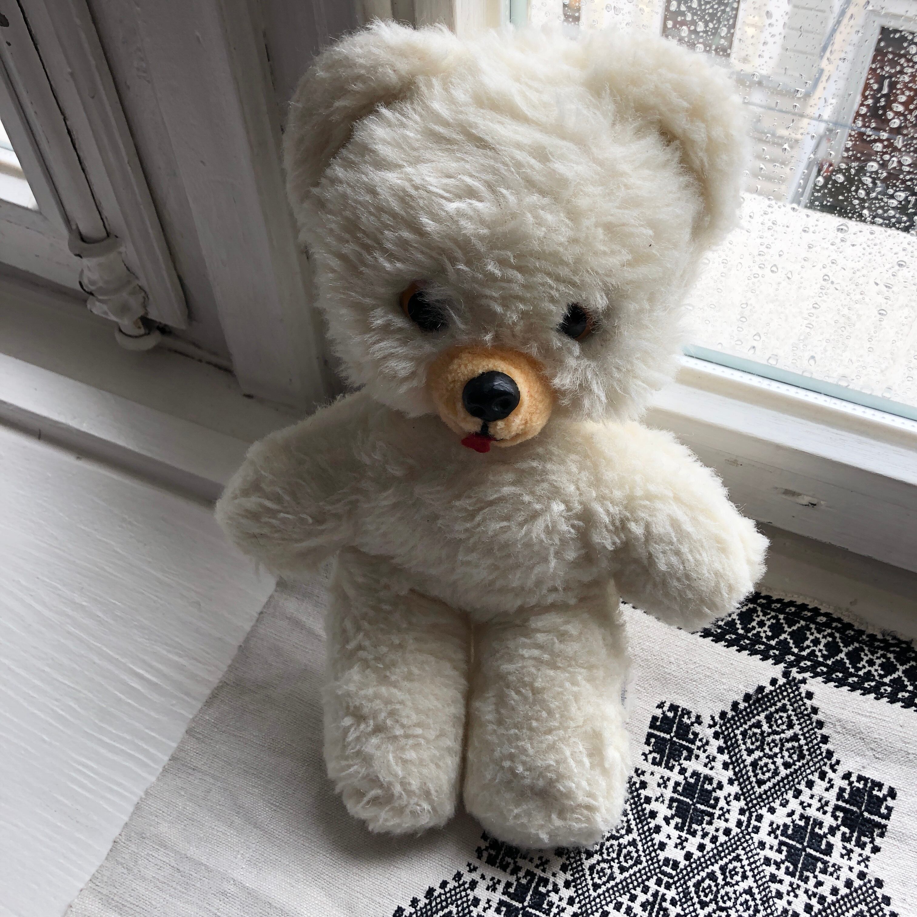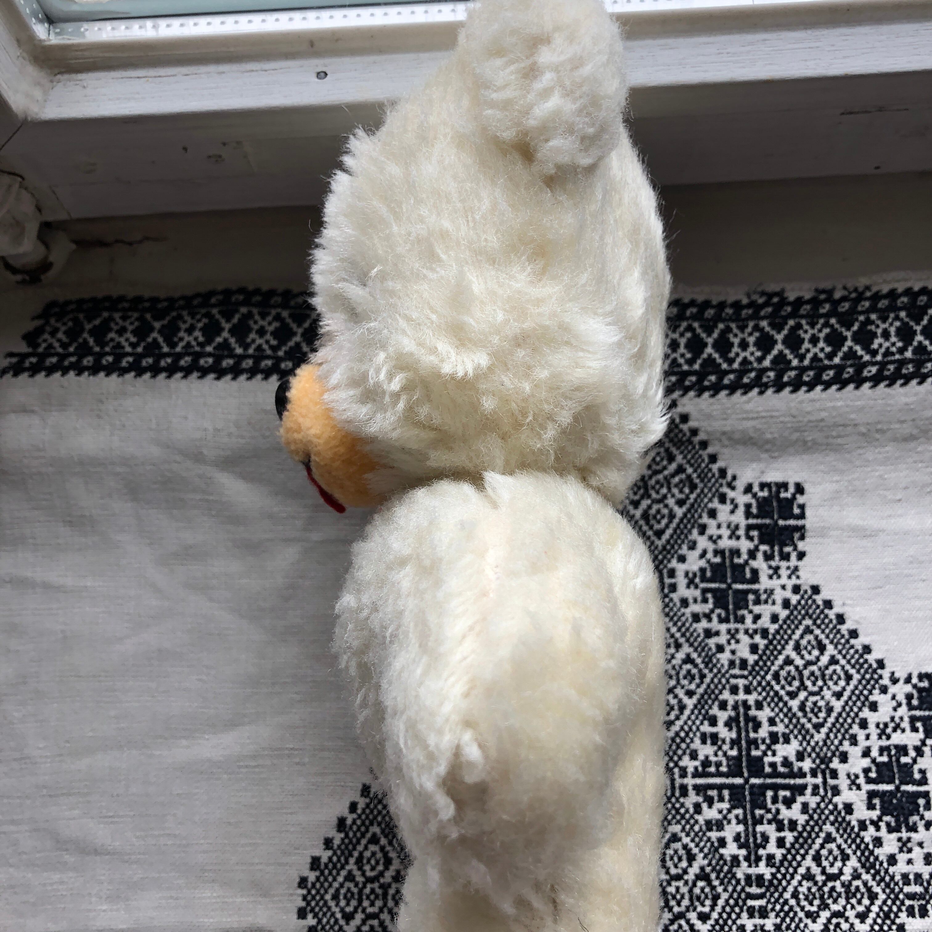 短い手とまっすぐな太い脚がかわいい白いくまのぬいぐるみ。