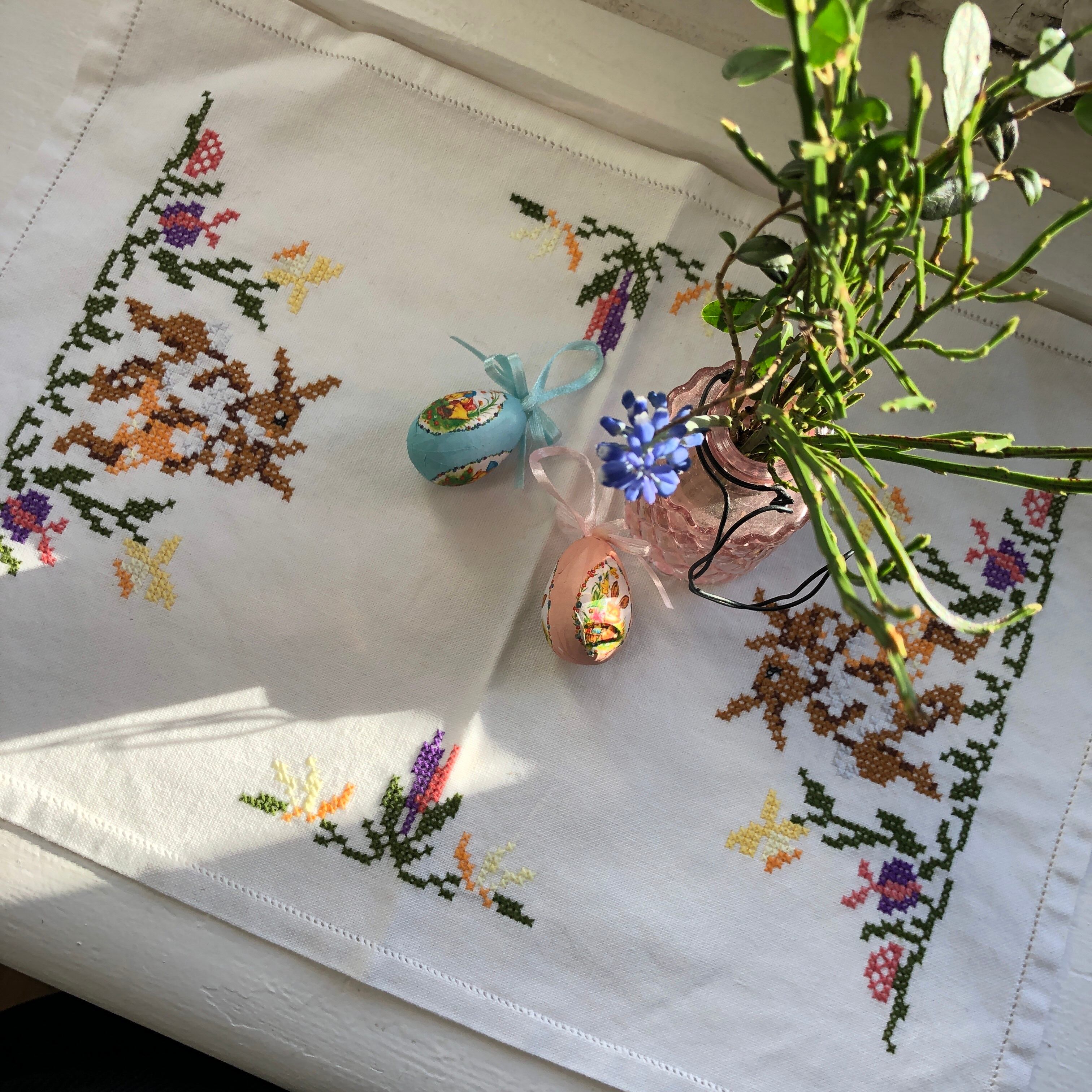 2匹のイースターバニーがキノコやちょうちょ、水仙のお花に囲まれている。そんな春らしさたっぷりなデザインのクロスステッチがほどこされた小さめのクロスです。