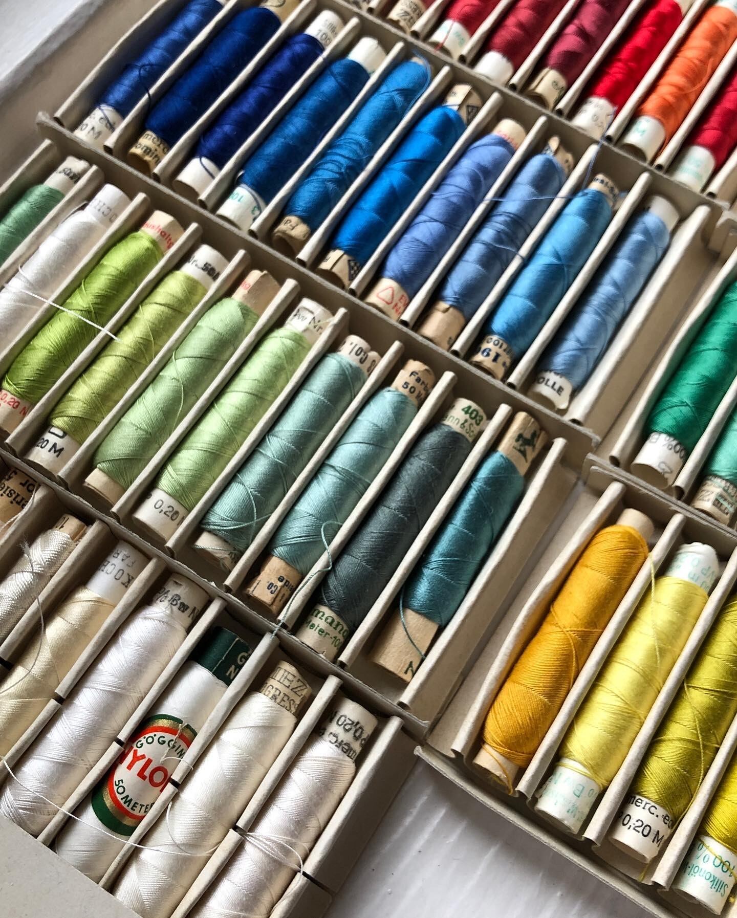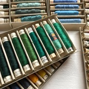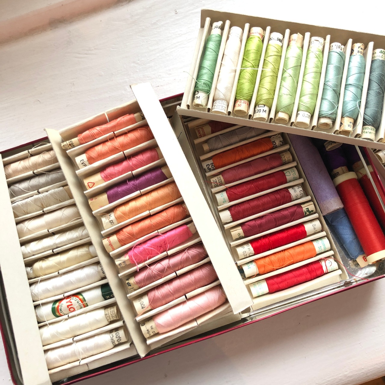 古い木綿(一部、絹糸)の糸が90巻、缶に収納されたセットです。