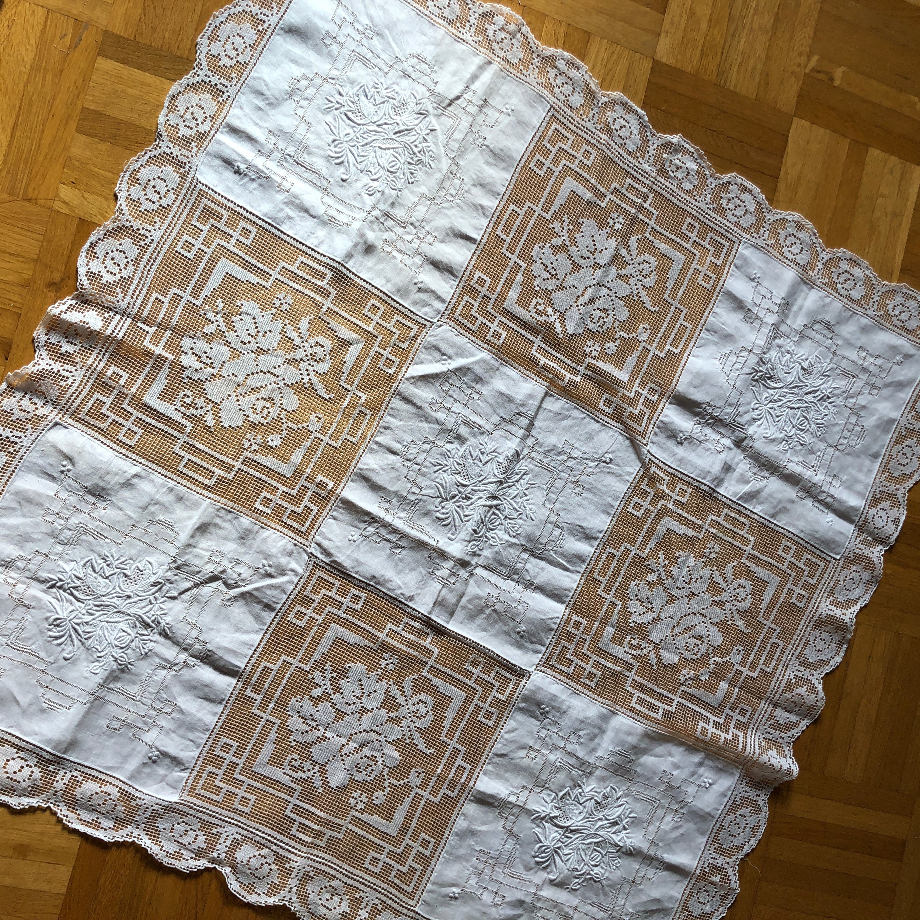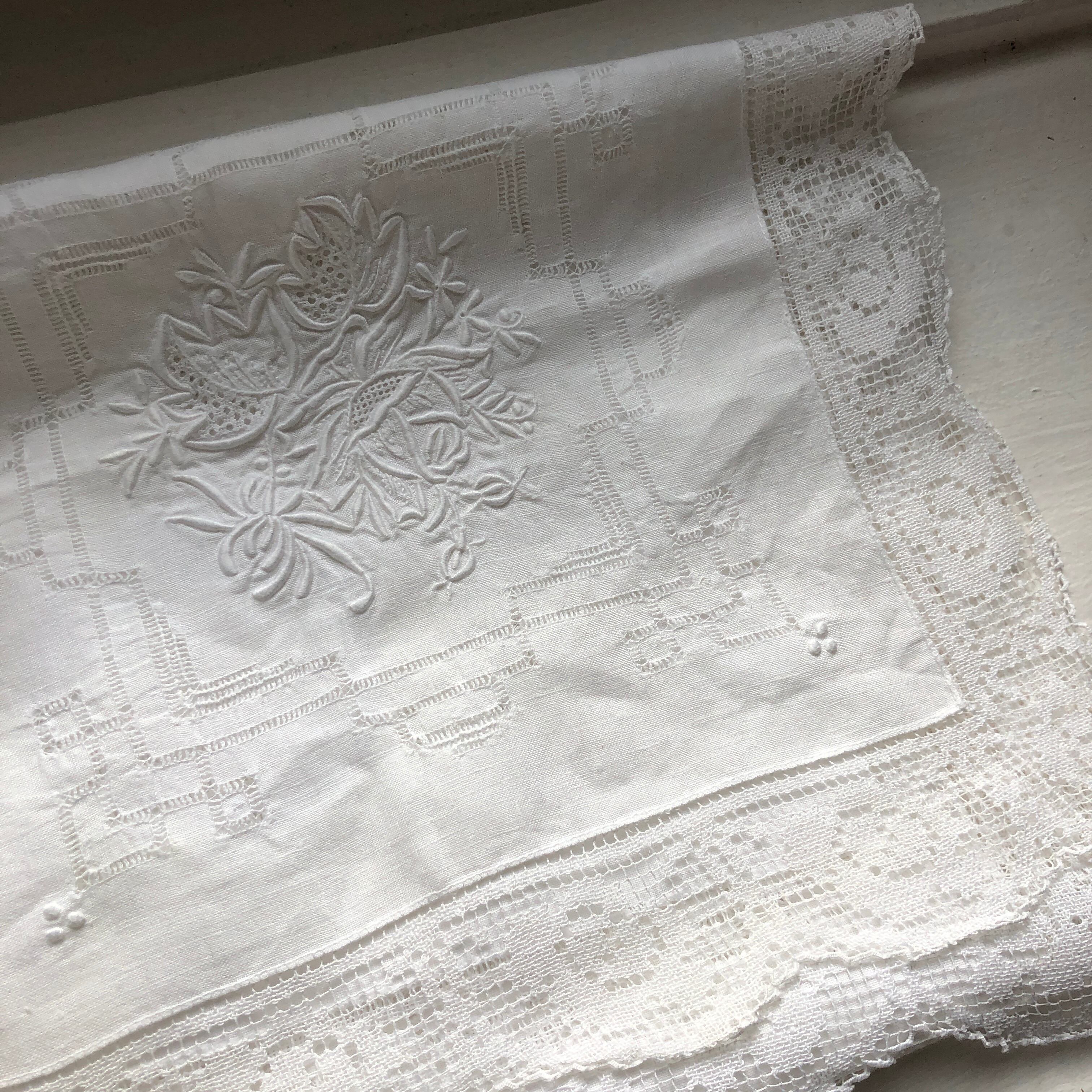 リネンのクロスには、ぷっくりとした花が白く刺繍され、細かなドロンワークがほどこされています。周りもボビンレースで囲んであり、繊細な1枚です。