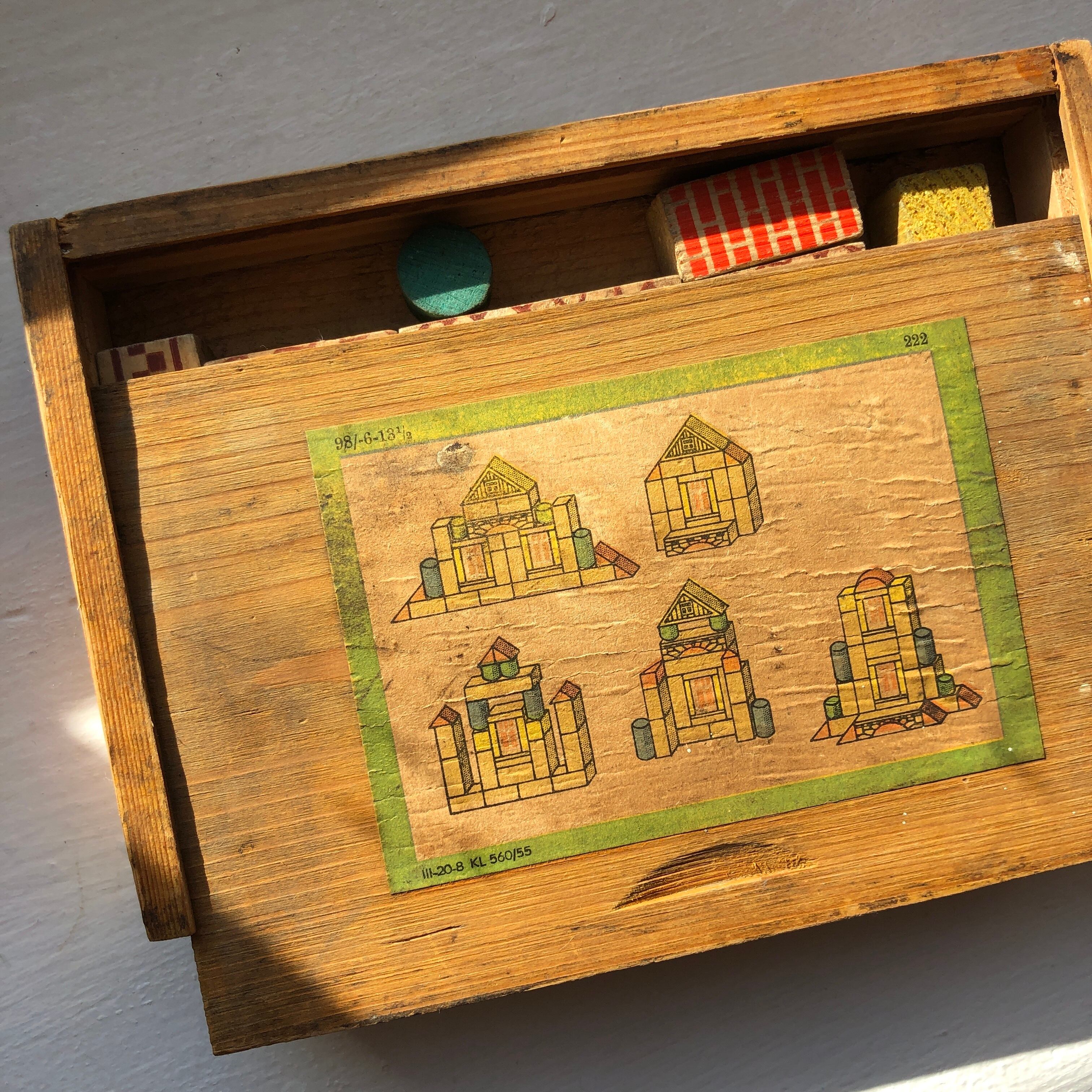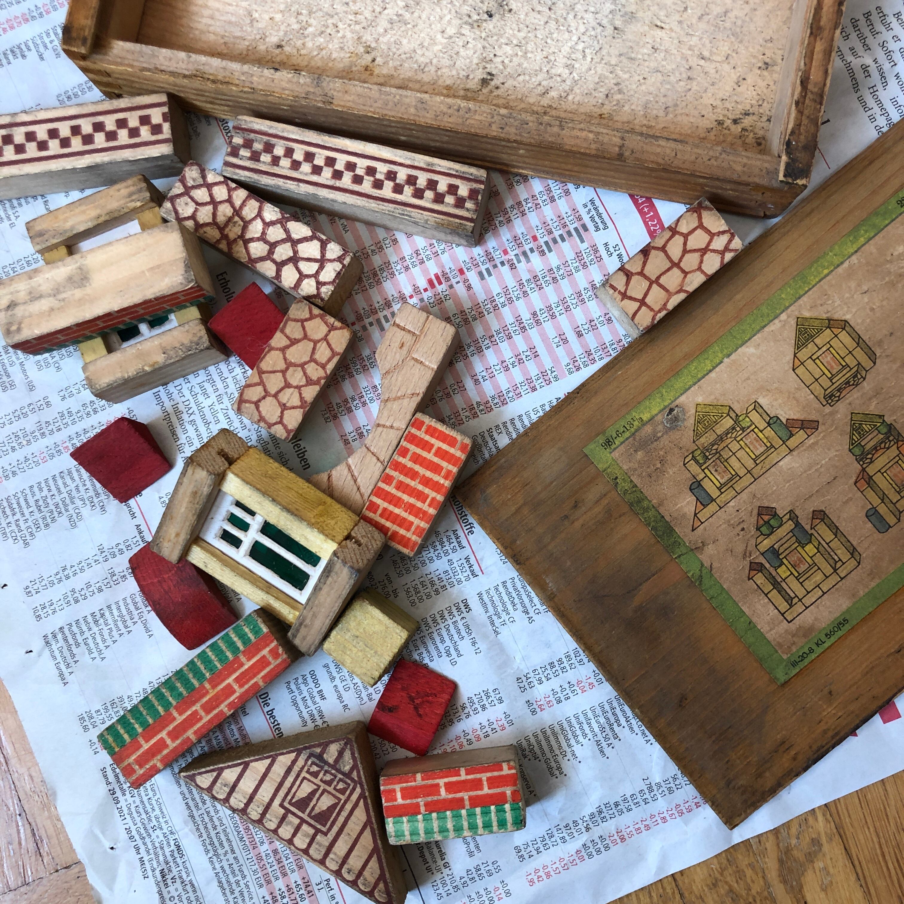 木箱いりのDDR(旧東ドイツ)時代のつみきセットです。1940年代のものと思われます。
