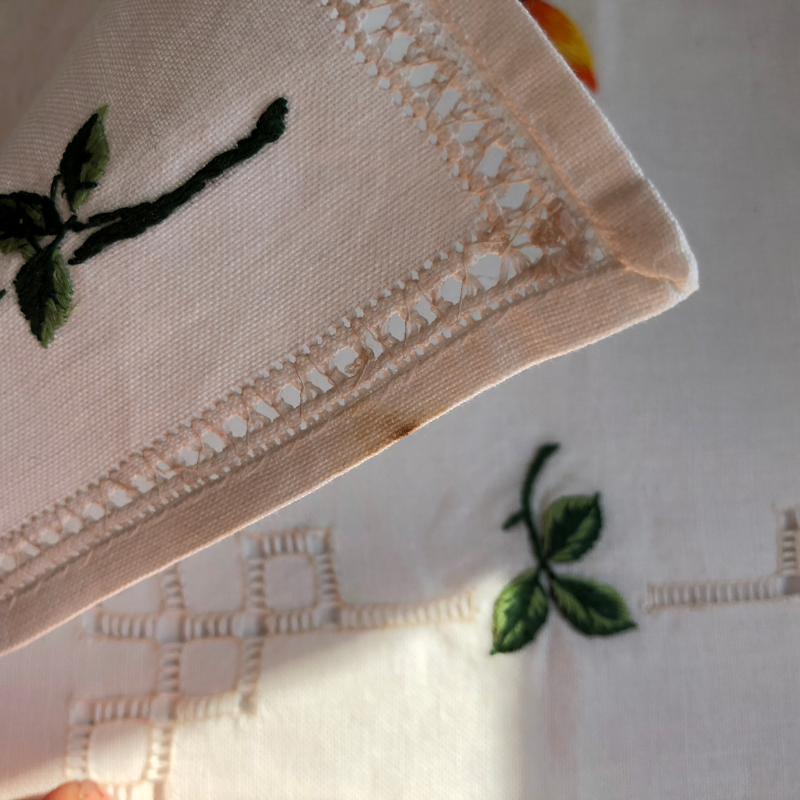 リネン地に黄色とオレンジで薔薇が刺繍され、クロスを囲む丁寧なドロンワークと角の処理が美しい一枚です。