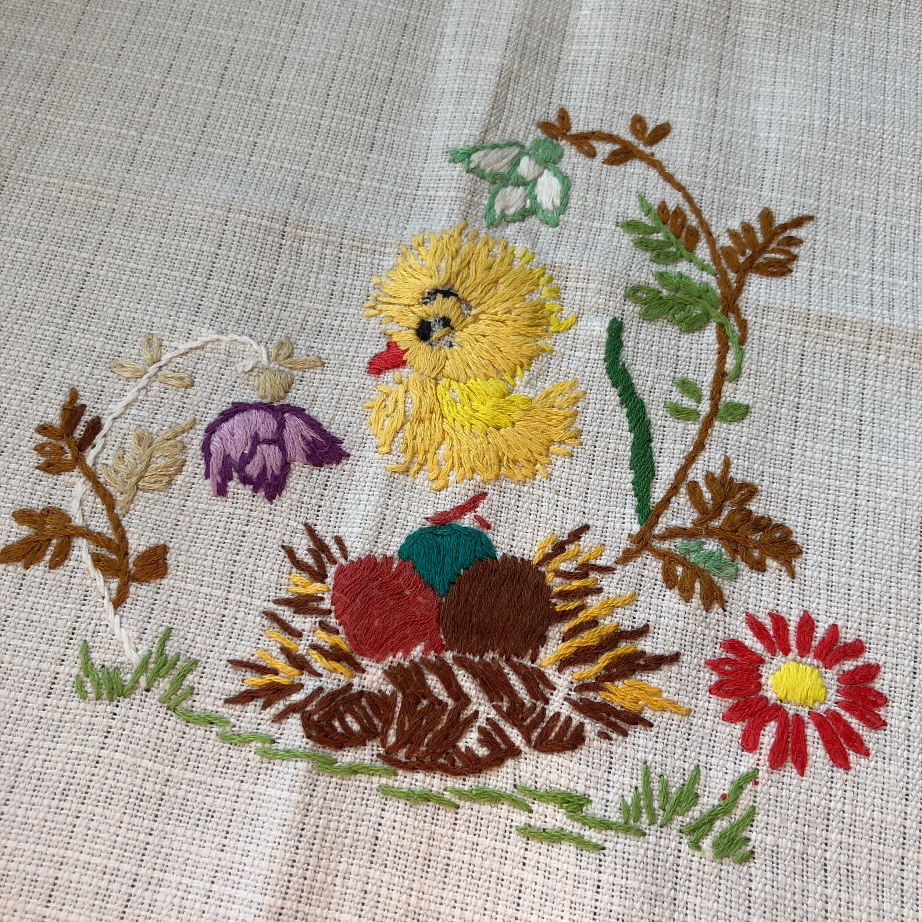 透かしのある布に4つのひよこが手刺繍されたイースタークロスです。