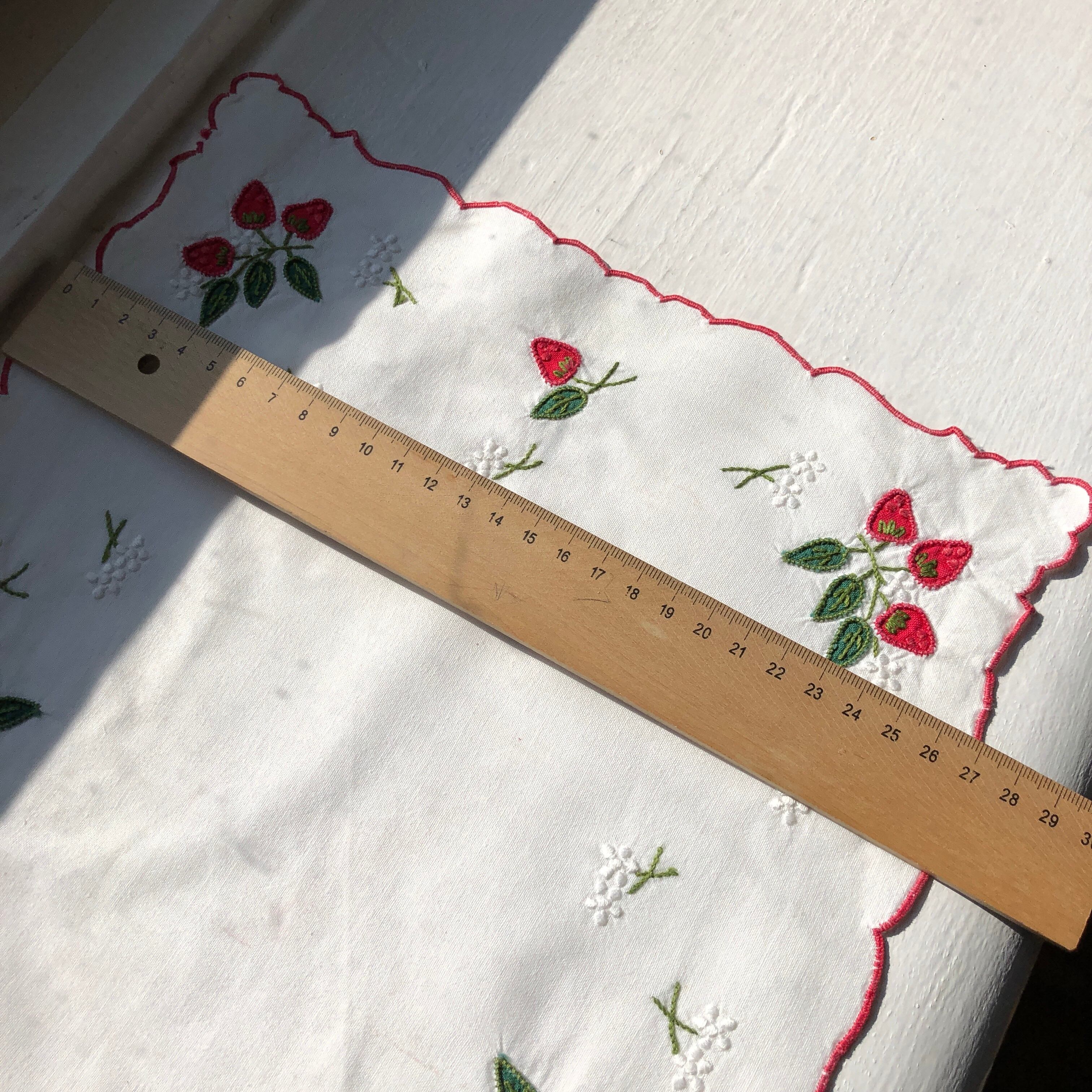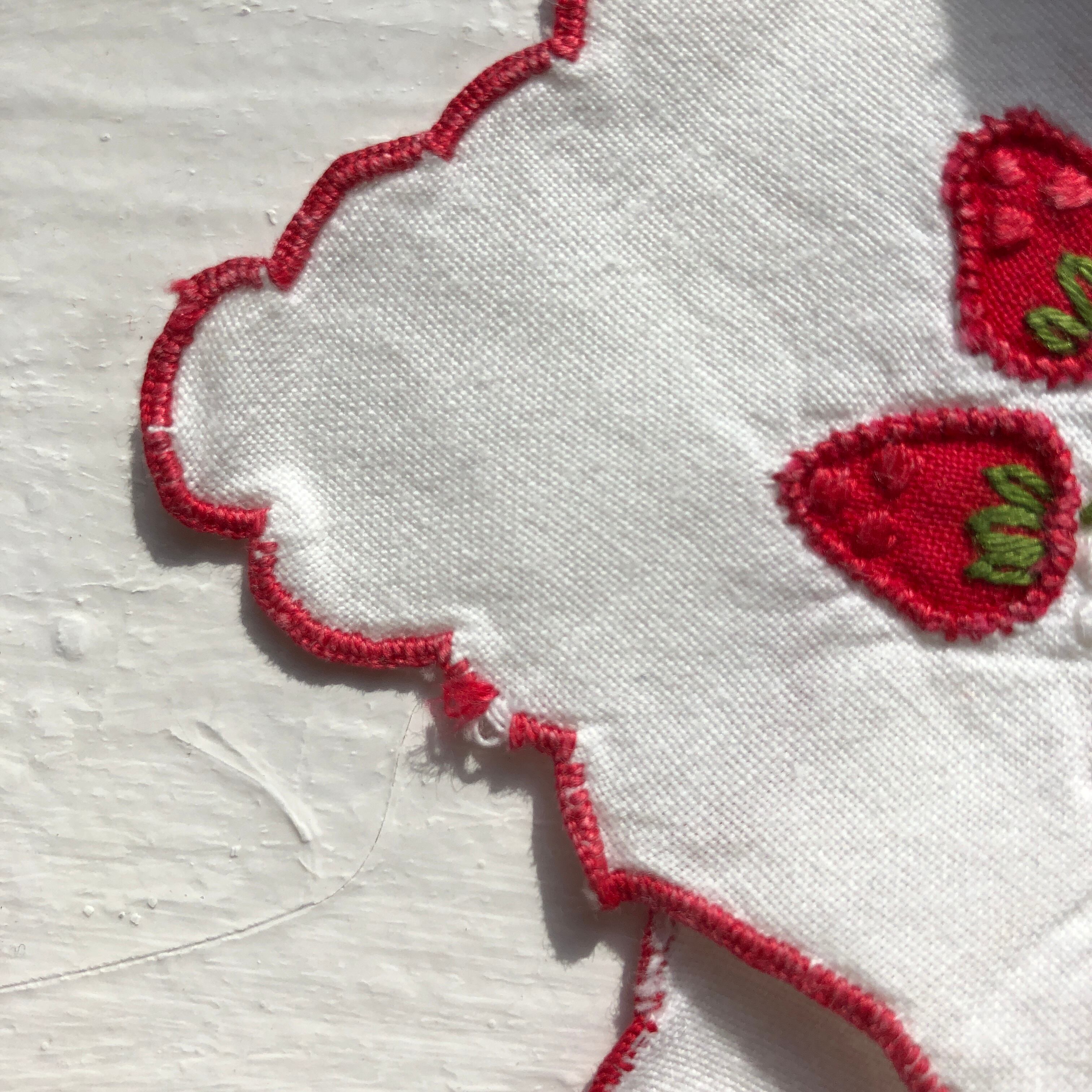 白地にイチゴがパッと華やかなクロス。イチゴと緑の葉っぱは布がアップリケされています。たくさんちりばめられた小さな白い小花もキュートです。