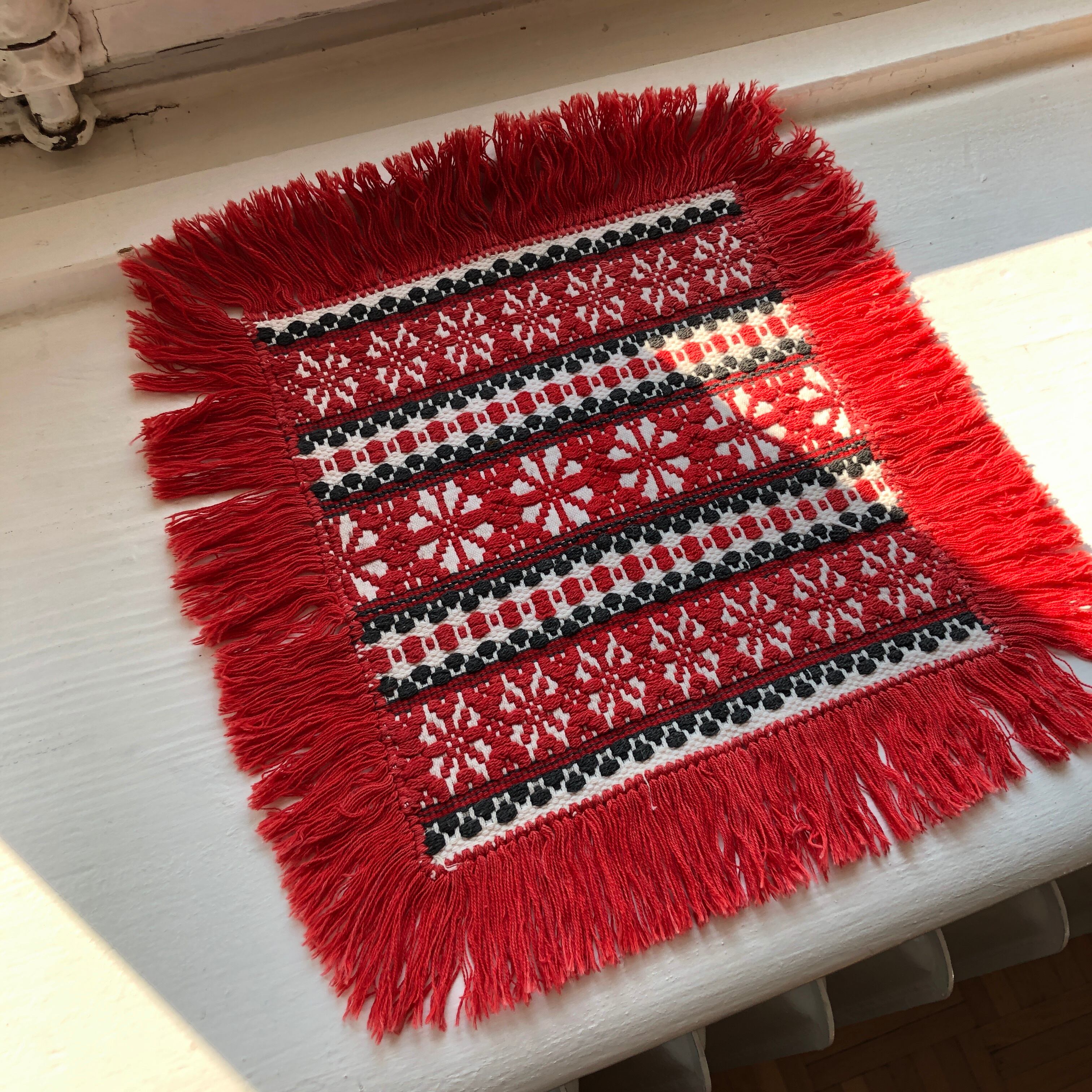 厚みのある白い布に太めの赤と黒い糸で丁寧にぎっしりと刺繍された小さなラグのようなクロス。約5cmのフリンジがクロスを一周囲んでいます。インパクト強めの一枚です。