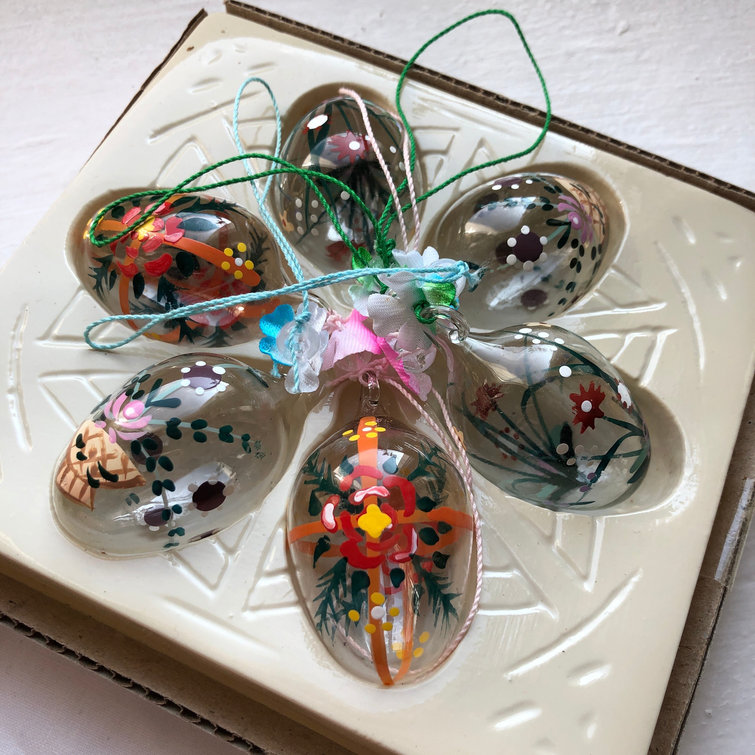 手描きの絵がかわいらしいガラスのイースターエッグ6個セットです。