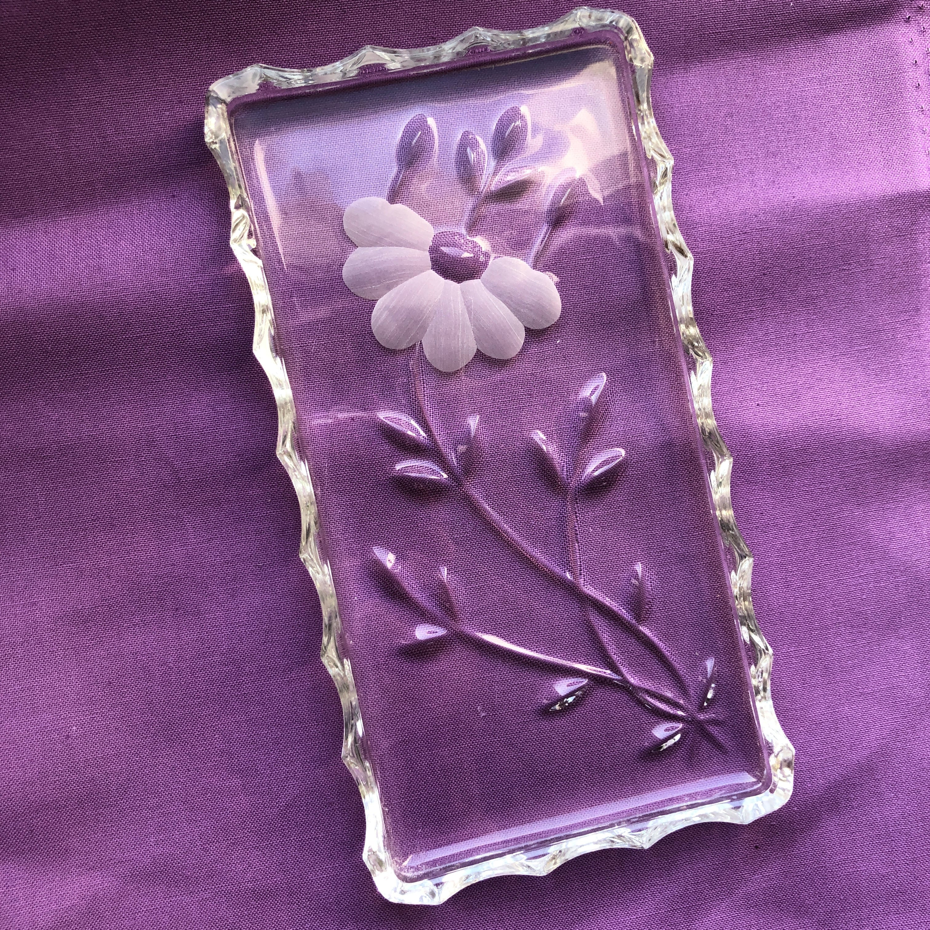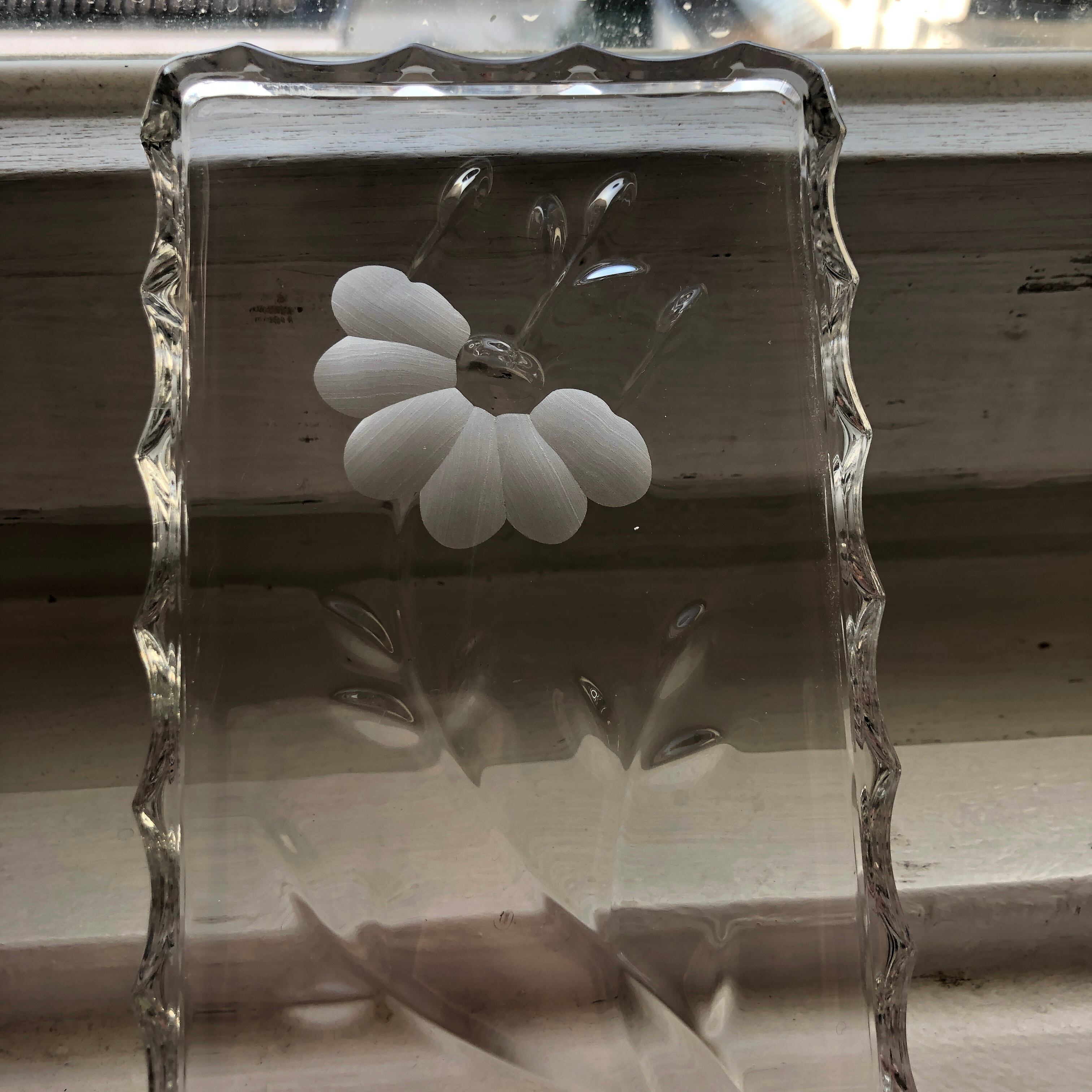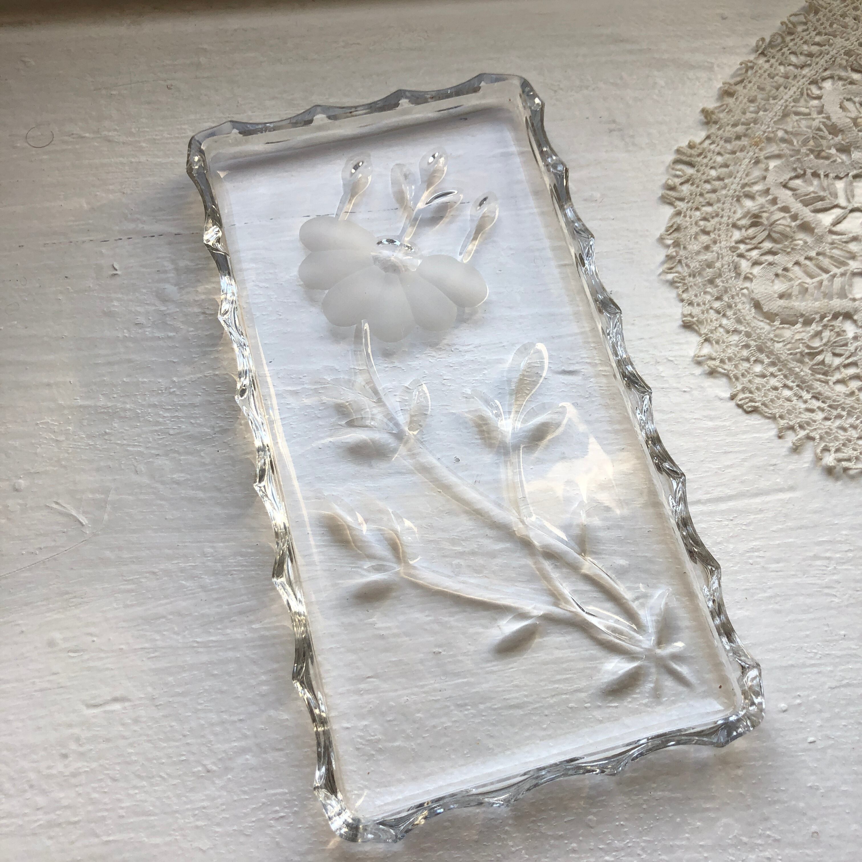 花びらがリアルにすりガラス加工され、枝の部分は滑らかなおうとつがあるガラスの長方形プレート。周囲の波線のカーブも美しい1点です。